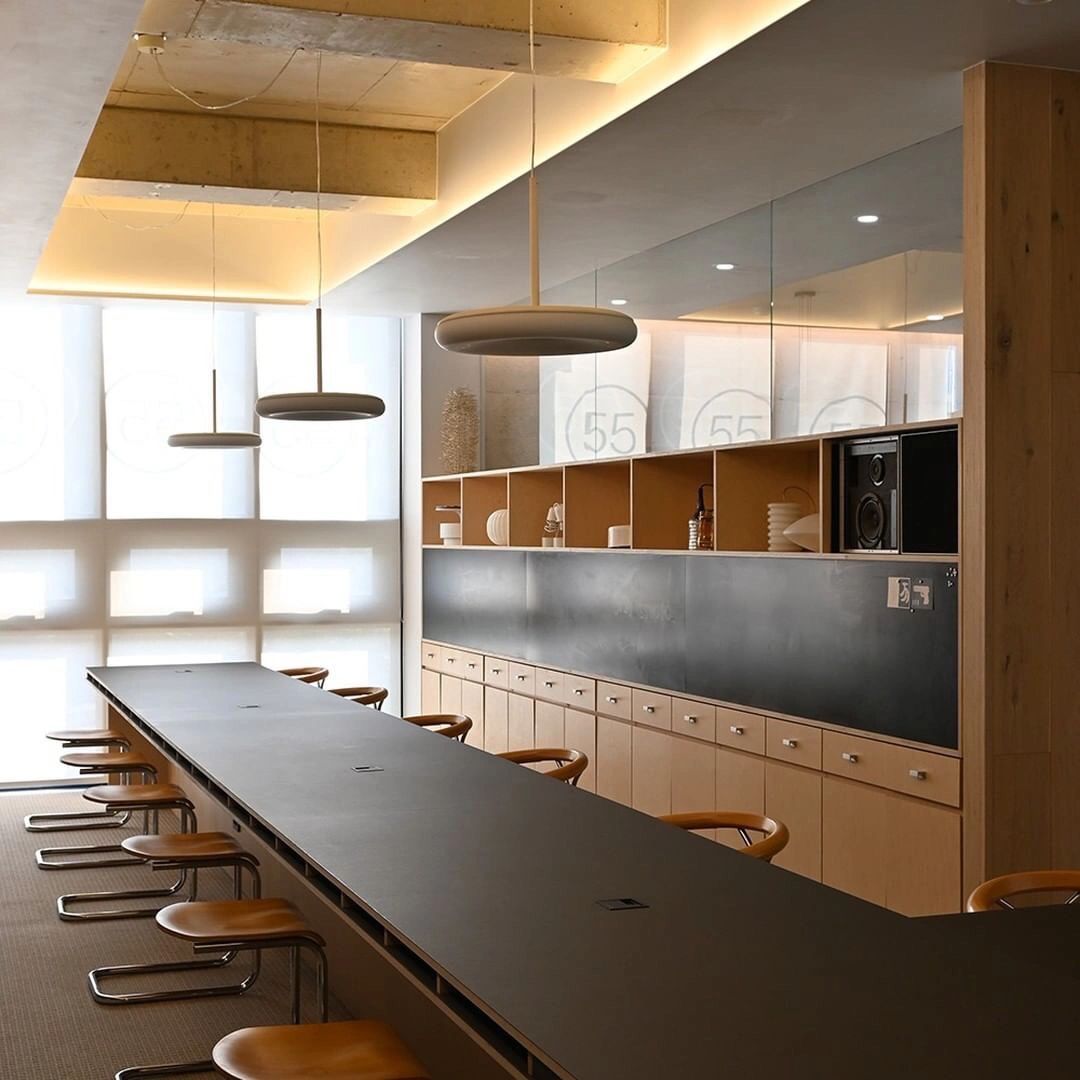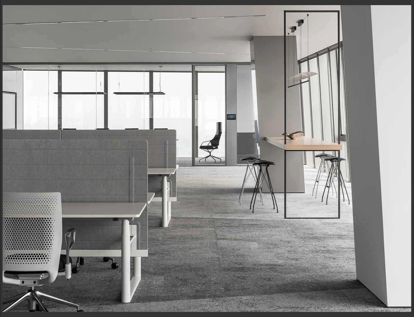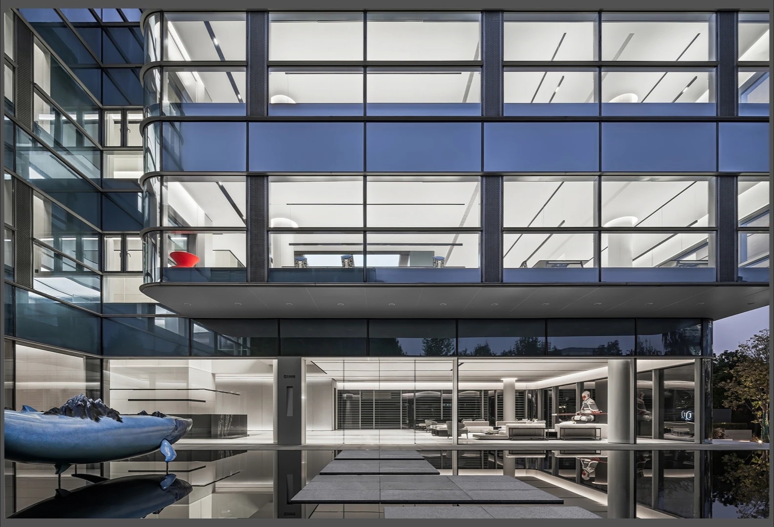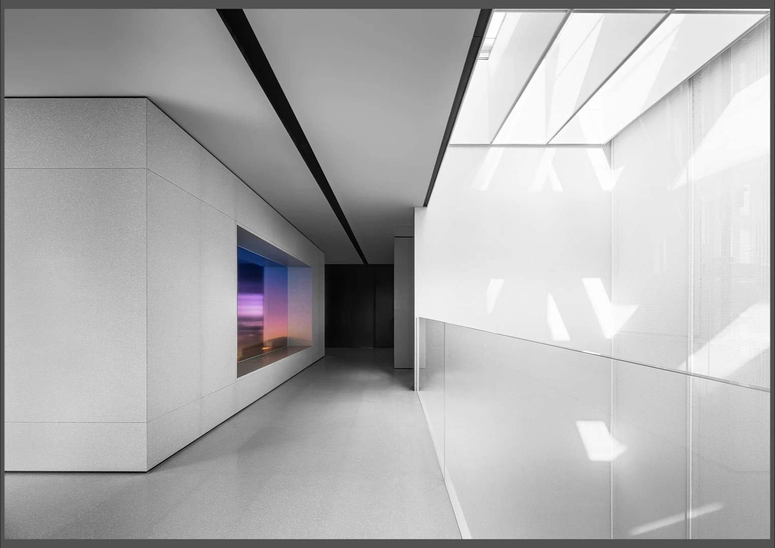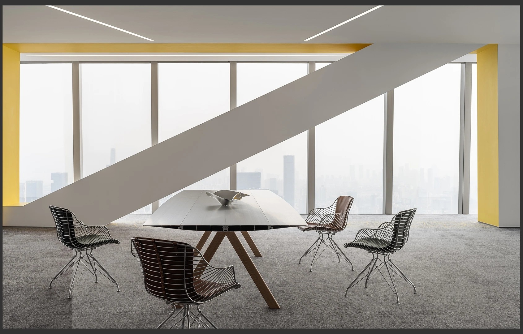 22楼的空中大堂为进入高层职能办公区主要入口,并新增了楼梯连接23楼顶层,在大堂入口处迎接访客的是取代常规LOGO的水景,由水景将人引向窗外景色。