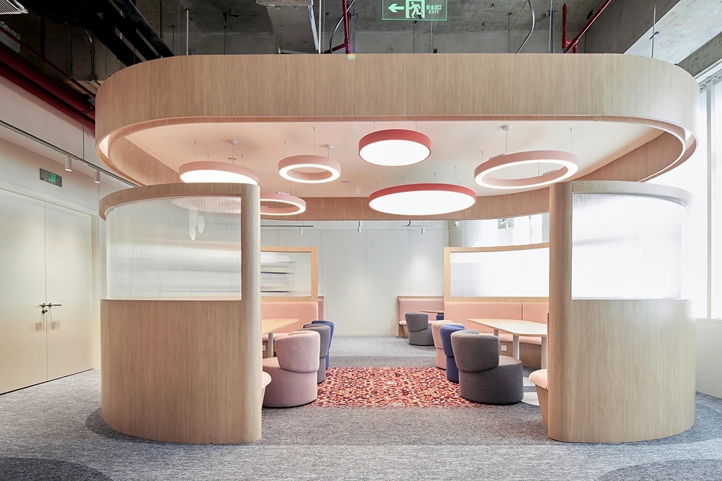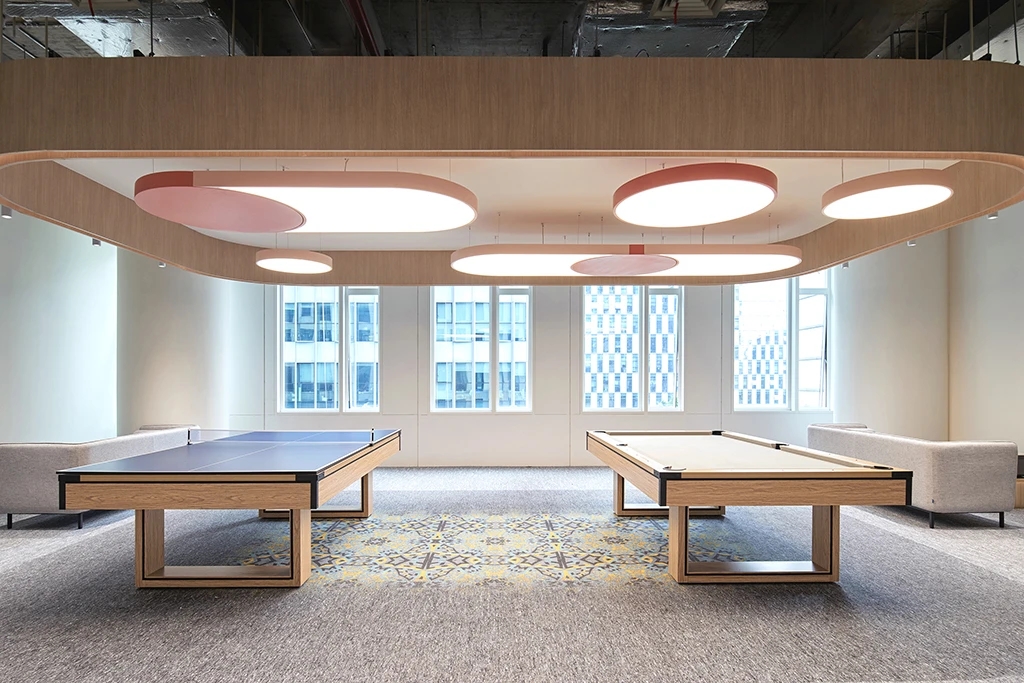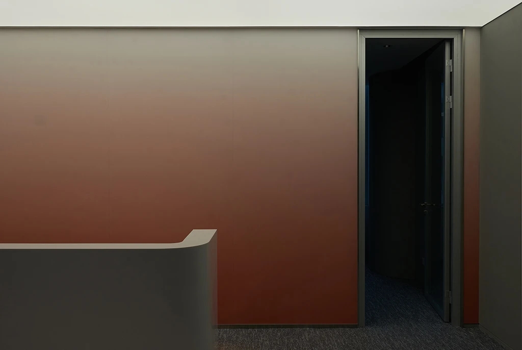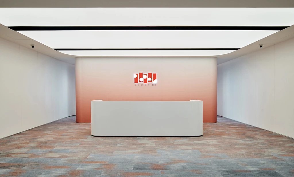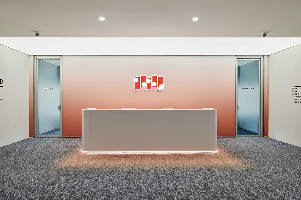 前台后方背景墙使用了粉色渐变树脂玻璃,选择使用了亚光凹凸面增加空间肌理质感,同时与叠纸LOGO进行呼应,在进口处强化了品牌形象。在地毯图案选择上,标准层与高区楼层做了一个差异性设计,强化了高区作为主要接待楼层的重要性。