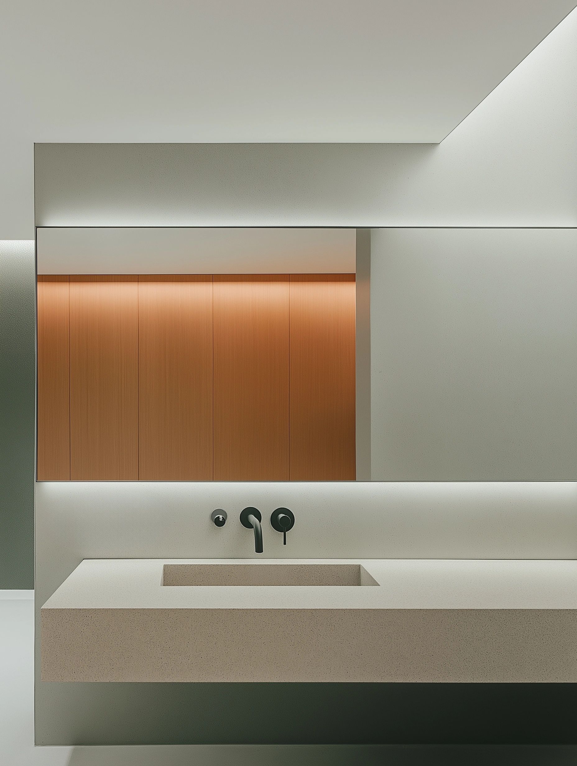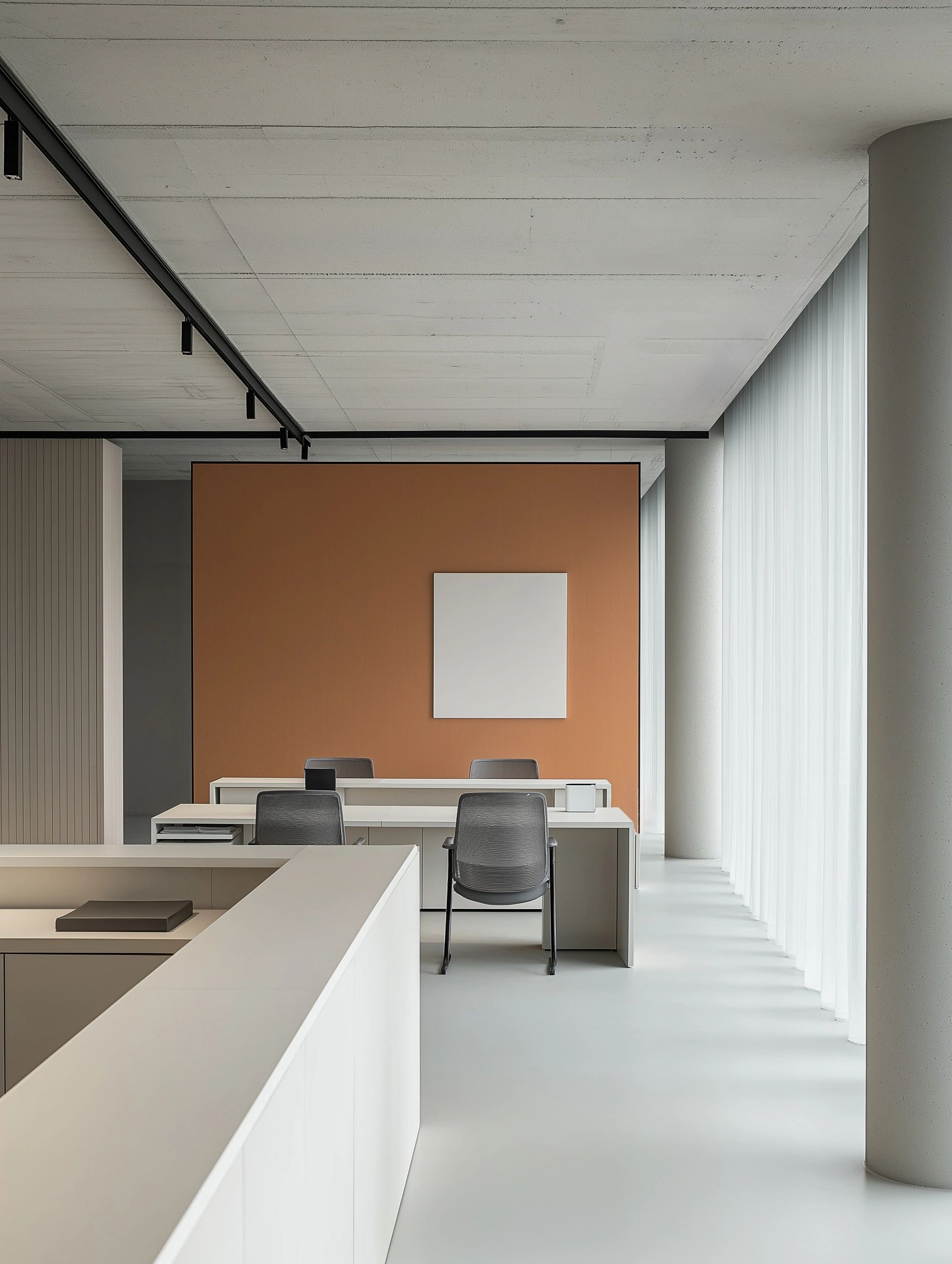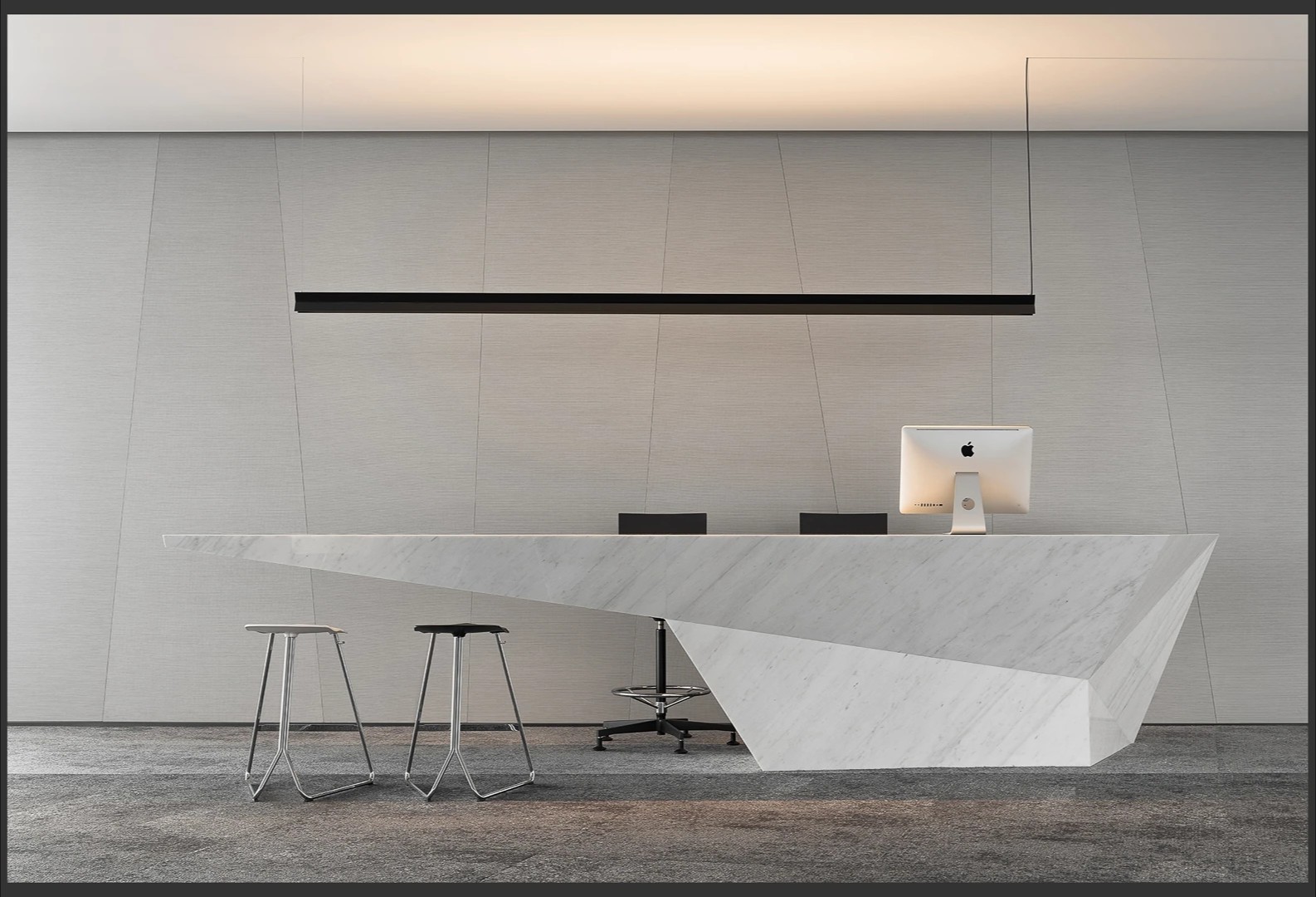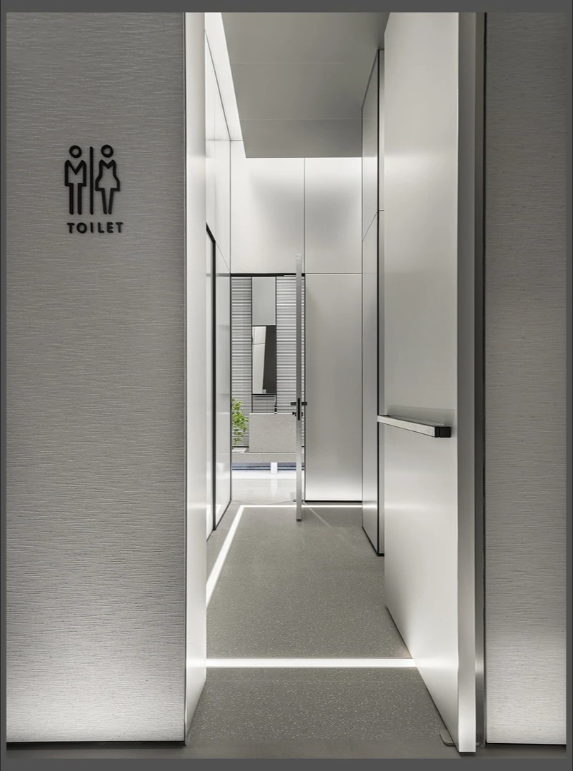 大堂选材与配色简约,以白灰色调为主,灰砖、米白贴膜与白色人造石的搭配,不拘泥于印象中的粉色,同时彰显了品牌的气质与未来发展的多元性。