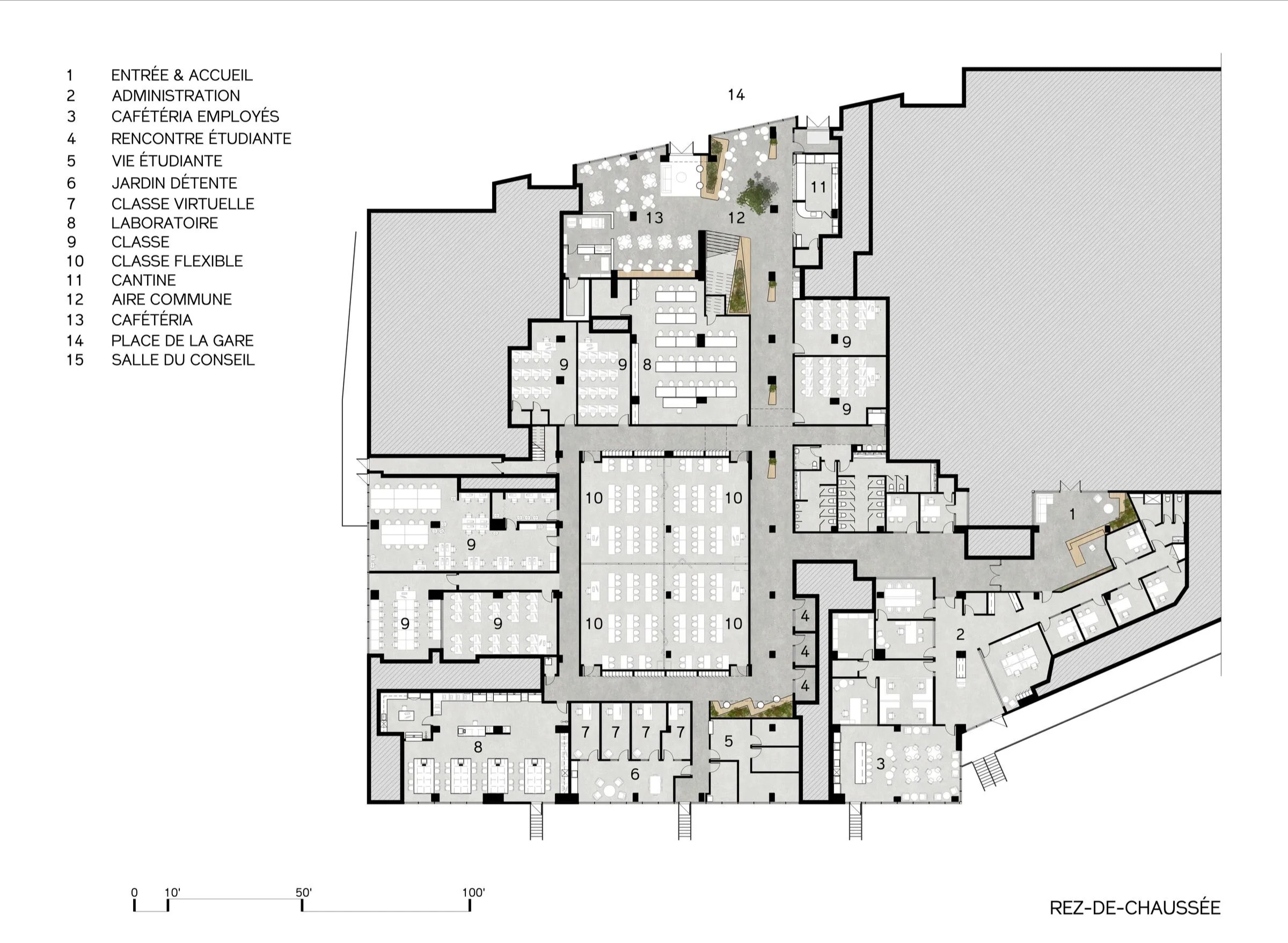 自助餐厅是新校园学生生活的中心。而夹层则由浅白色的走道组成。楼梯的建筑构图融合了这两种形式语言,金属栏杆与木块形成鲜明对比。楼梯展示了自助餐厅及其与一棵树的关系,这棵树利用双层高的空间,将树干展开超过 14 英尺高。