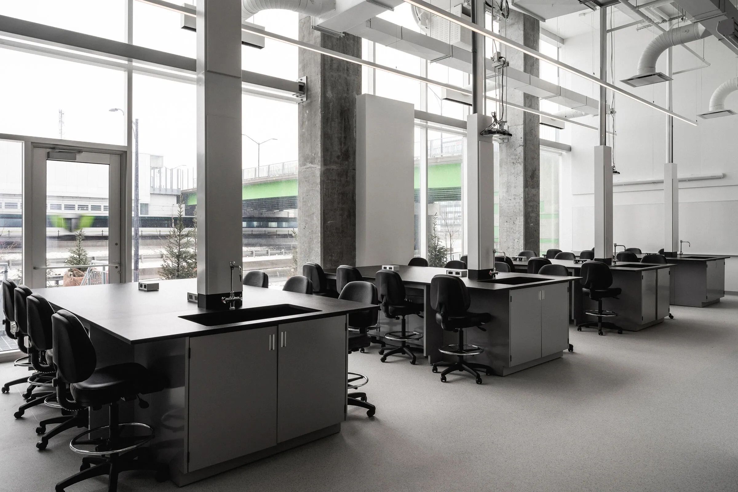 学校被设计成一座混凝土柱森林,教室像白色盒子一样插入,中间点缀着木块。这些白色盒子引导流通,并允许自然光穿过建筑物周围的幕墙进入。