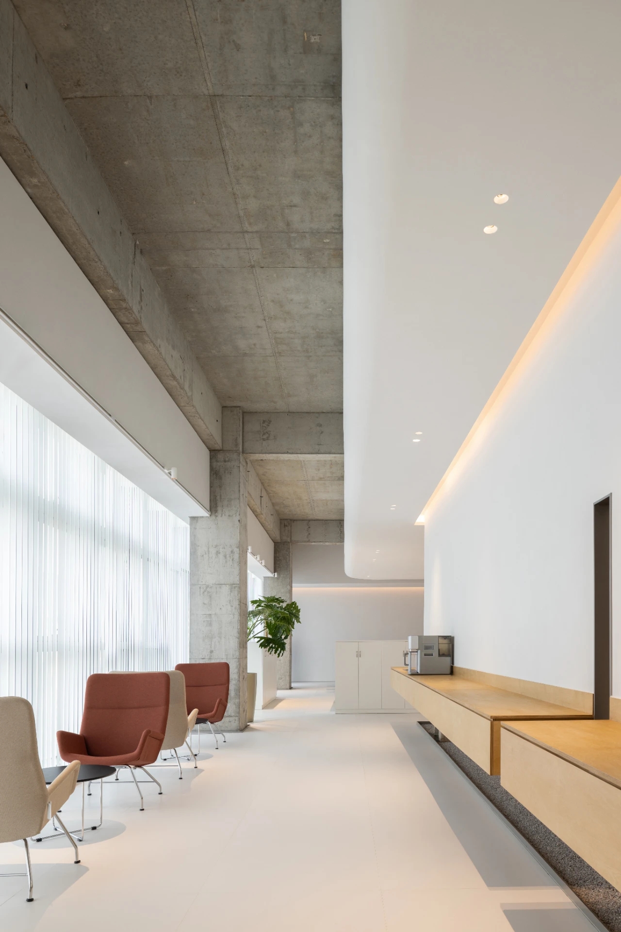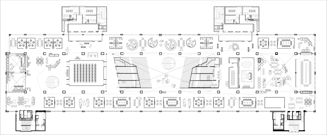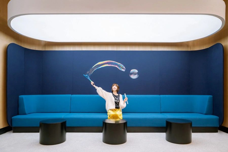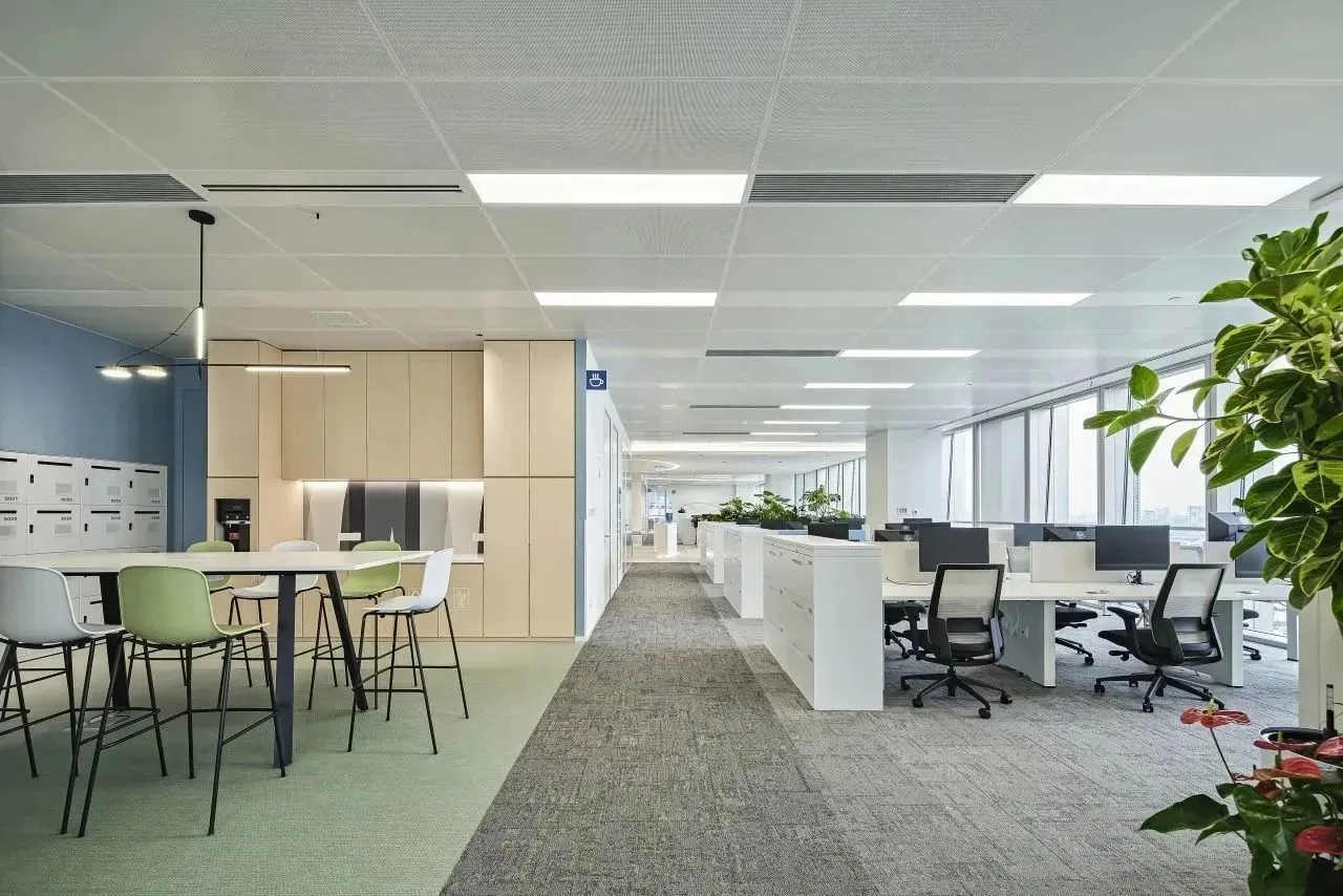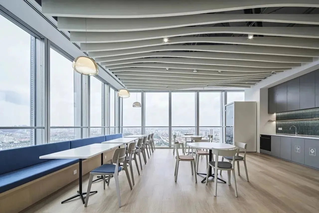 “自由”的概念,不局限于实体行为的无拘,更侧重心理层面放下戒备。洽谈区融入茶水间功能,规划在前台背侧,利用背墙透景、借景,充盈人的感官体验。几何界面呼应现代设计工业感的桌椅,流露简约、利落的干练气质;“一体两面”式结构运用,自由地完成空间“并合”无缝衔接。