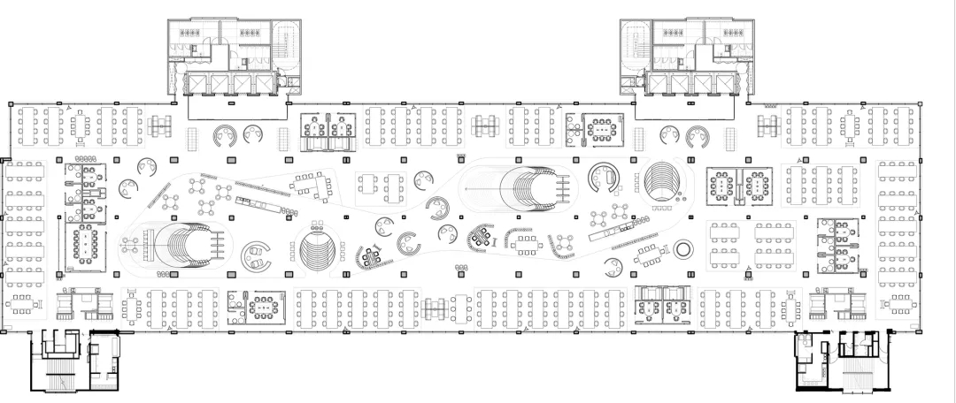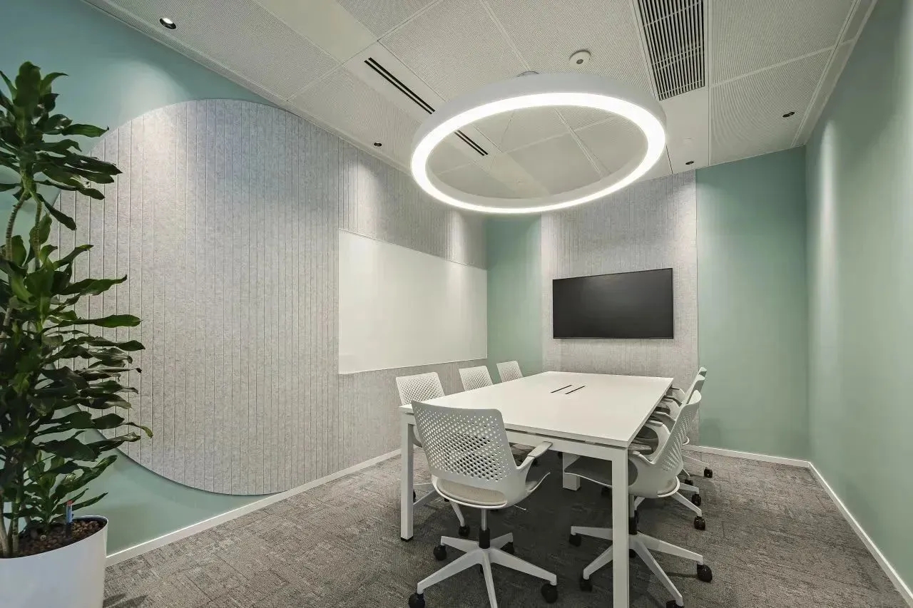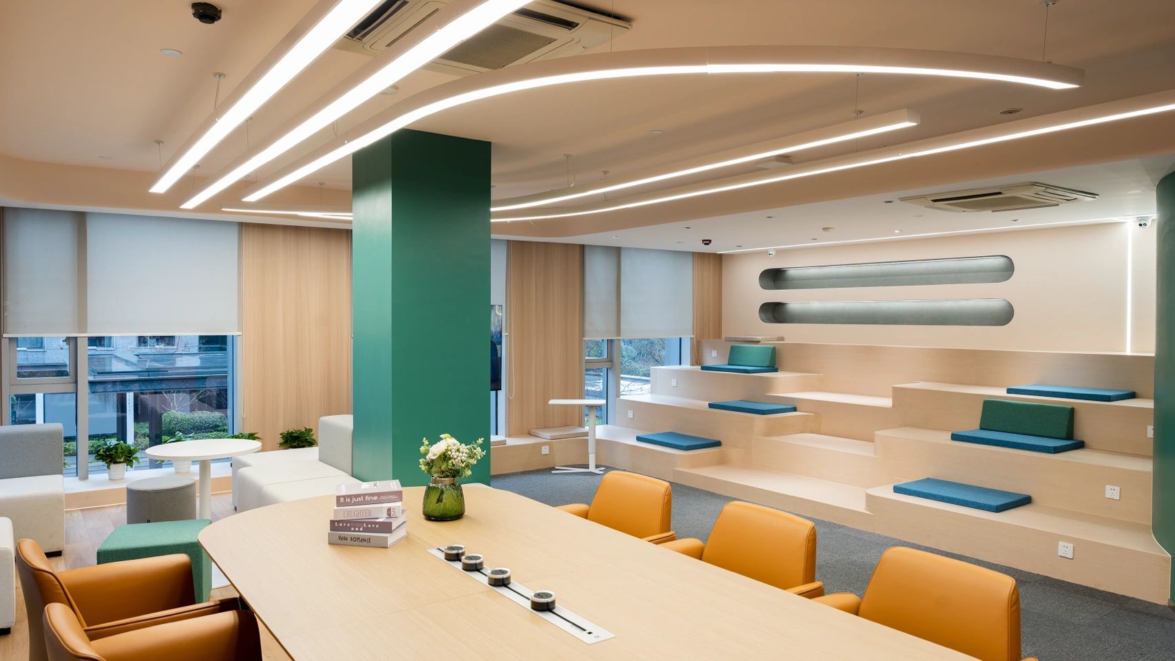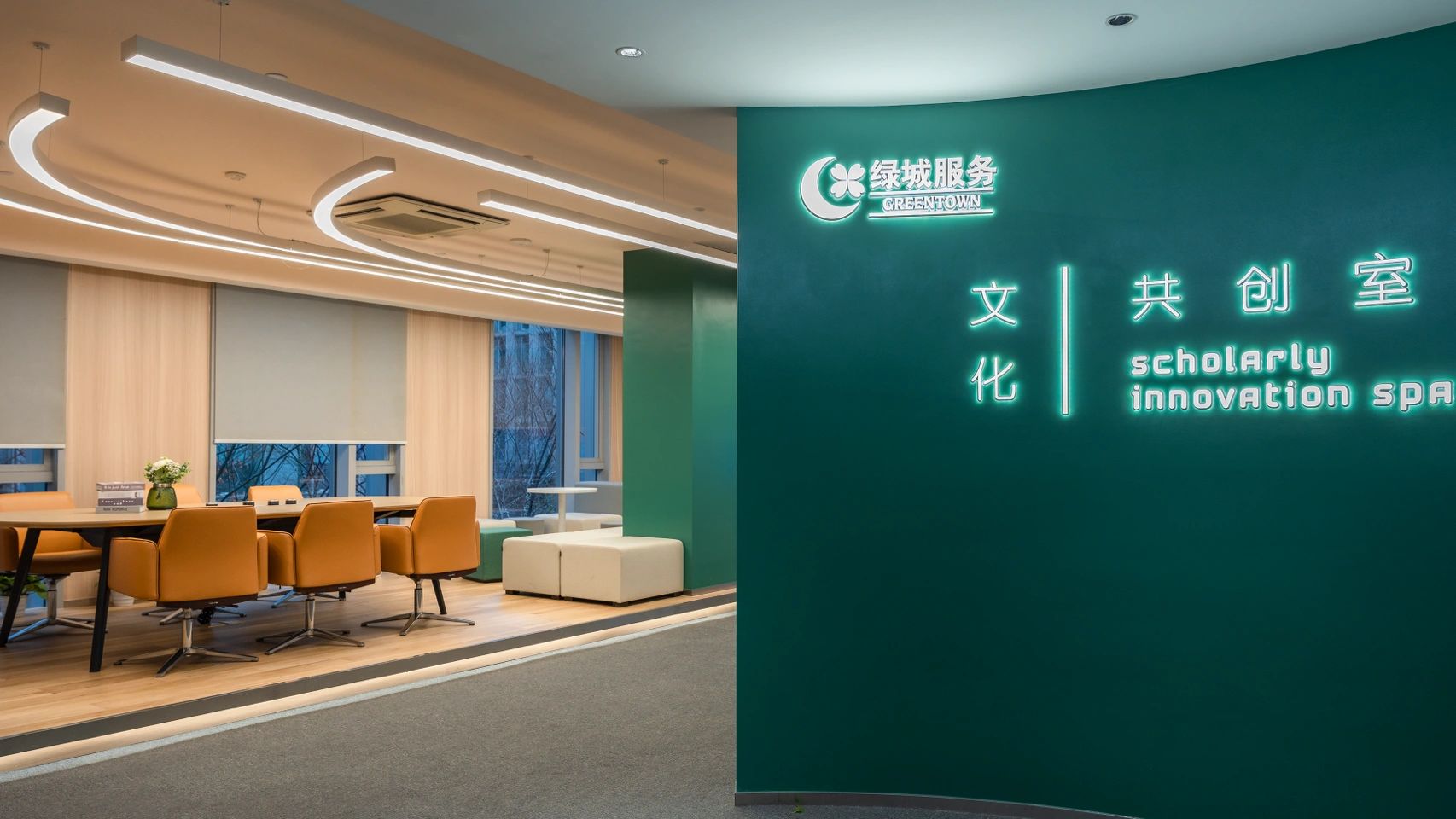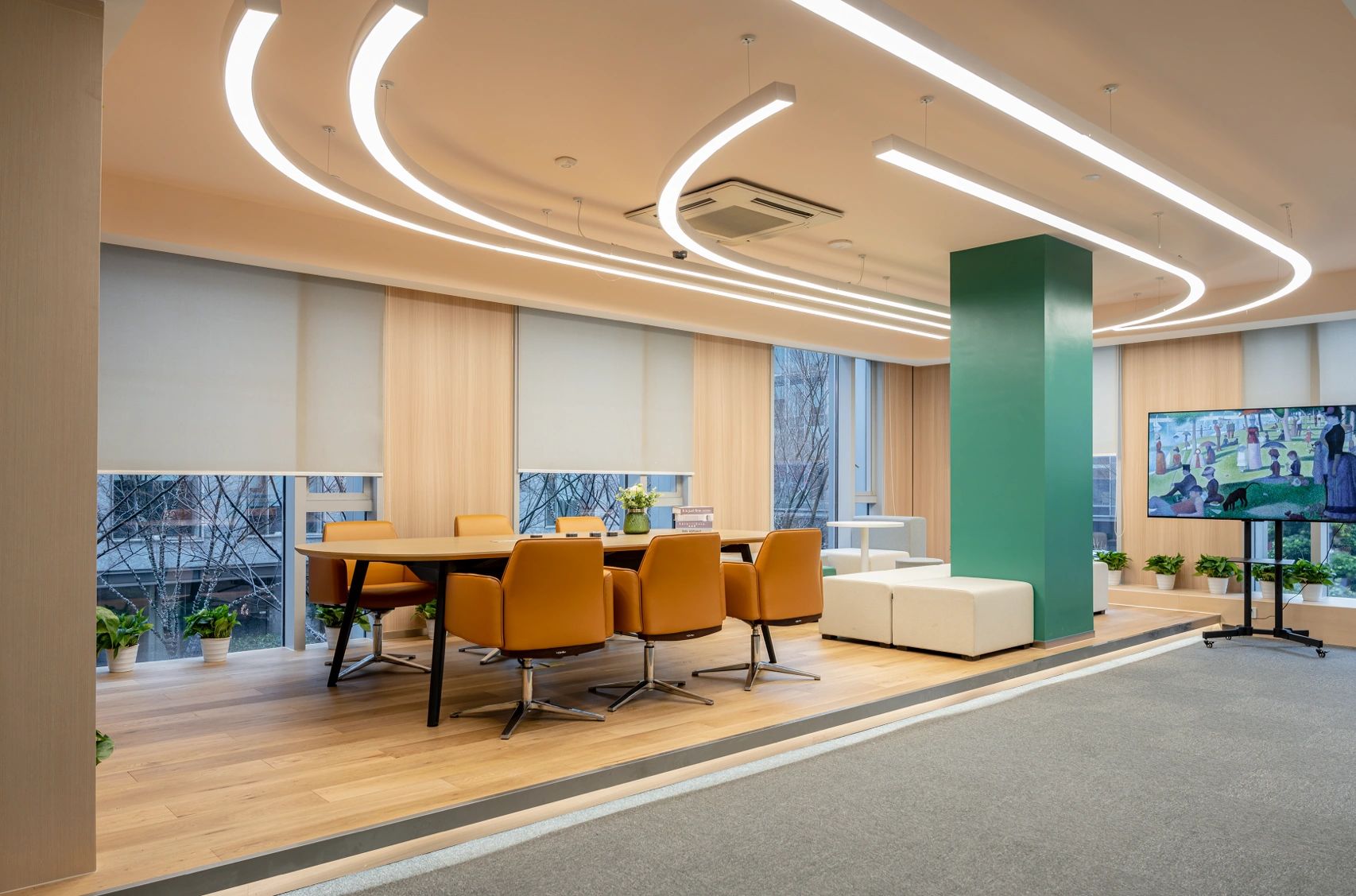 “自由”的概念,不局限于实体行为的无拘,更侧重心理层面放下戒备。洽谈区融入茶水间功能,规划在前台背侧,利用背墙透景、借景,充盈人的感官体验。几何界面呼应现代设计工业感的桌椅,流露简约、利落的干练气质;“一体两面”式结构运用,自由地完成空间“并合”无缝衔接。