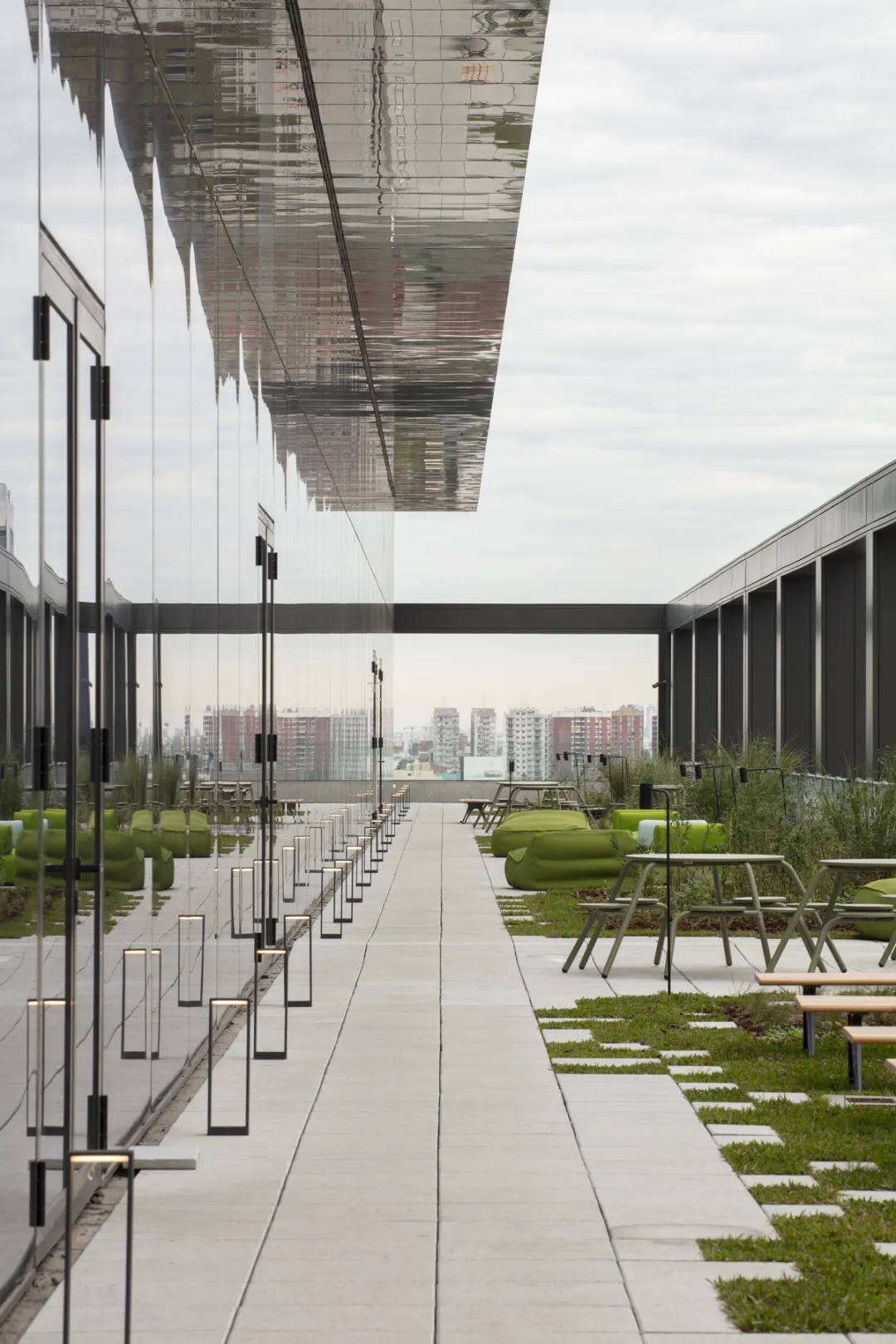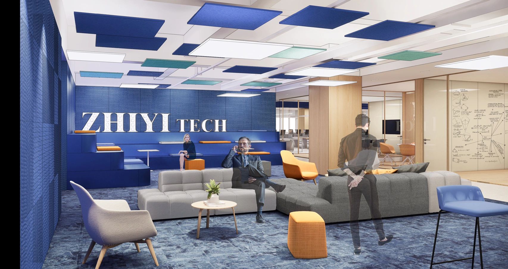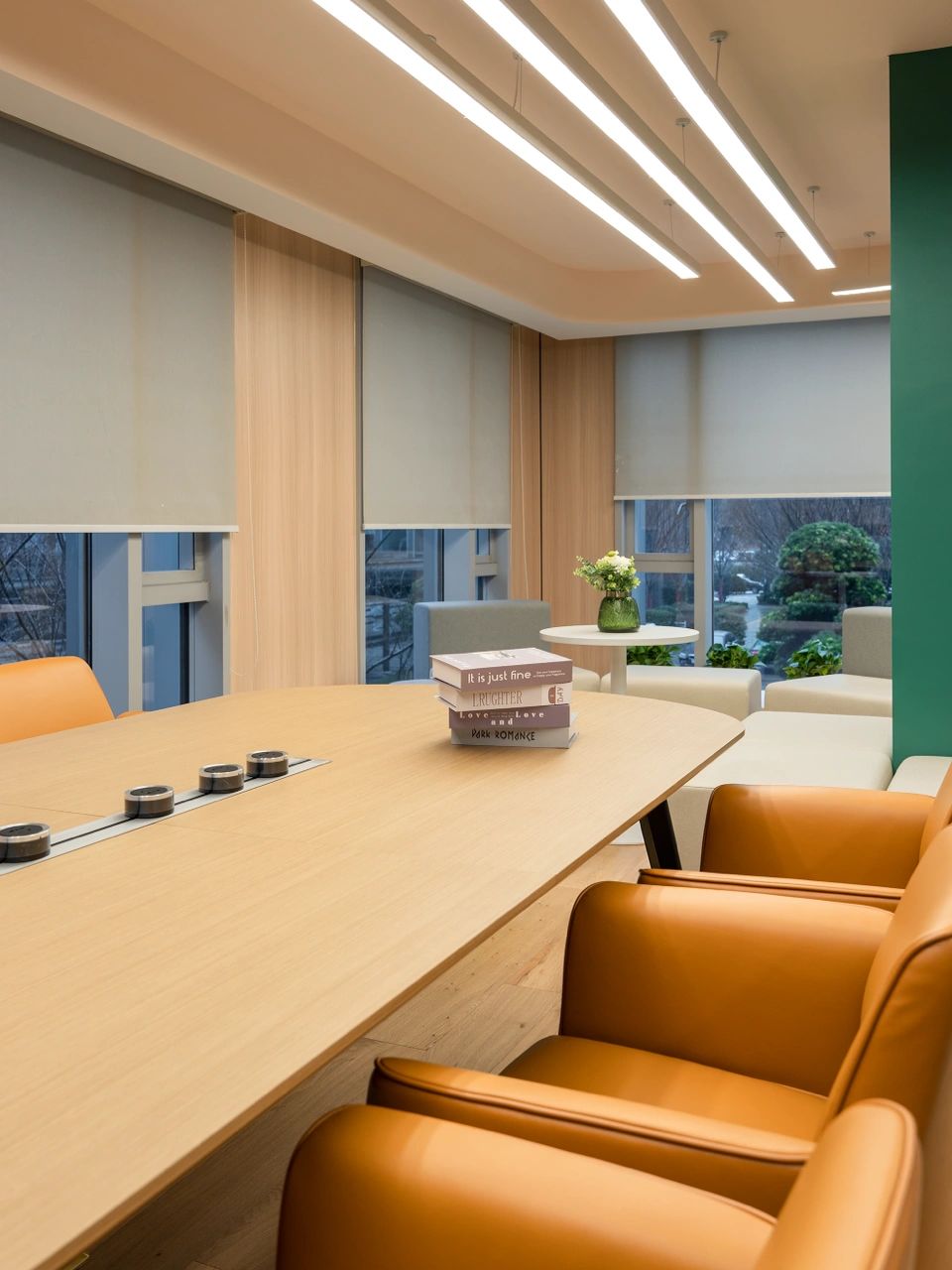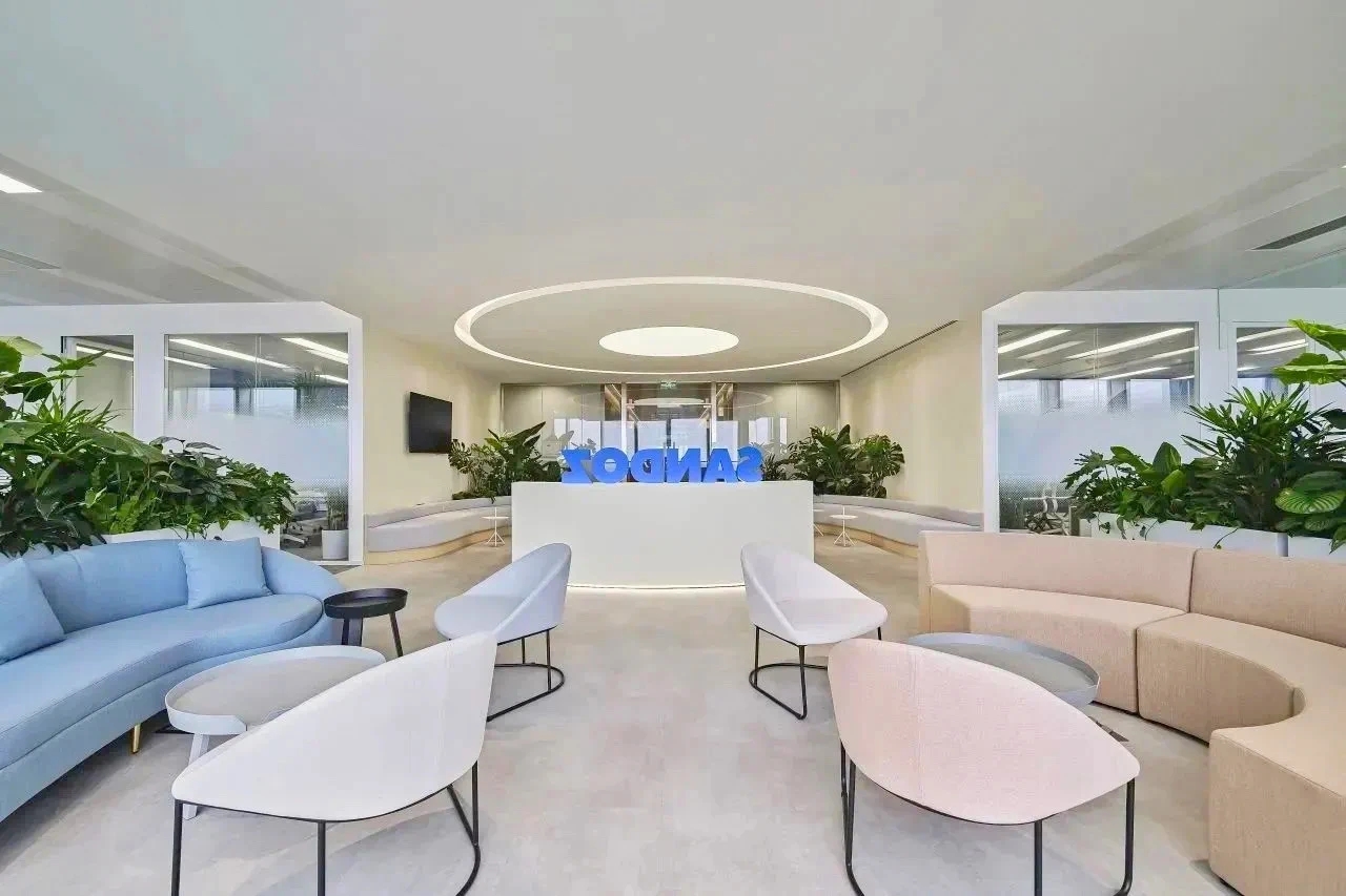 “自由”的概念,不局限于实体行为的无拘,更侧重心理层面放下戒备。洽谈区融入茶水间功能,规划在前台背侧,利用背墙透景、借景,充盈人的感官体验。几何界面呼应现代设计工业感的桌椅,流露简约、利落的干练气质;“一体两面”式结构运用,自由地完成空间“并合”无缝衔接。