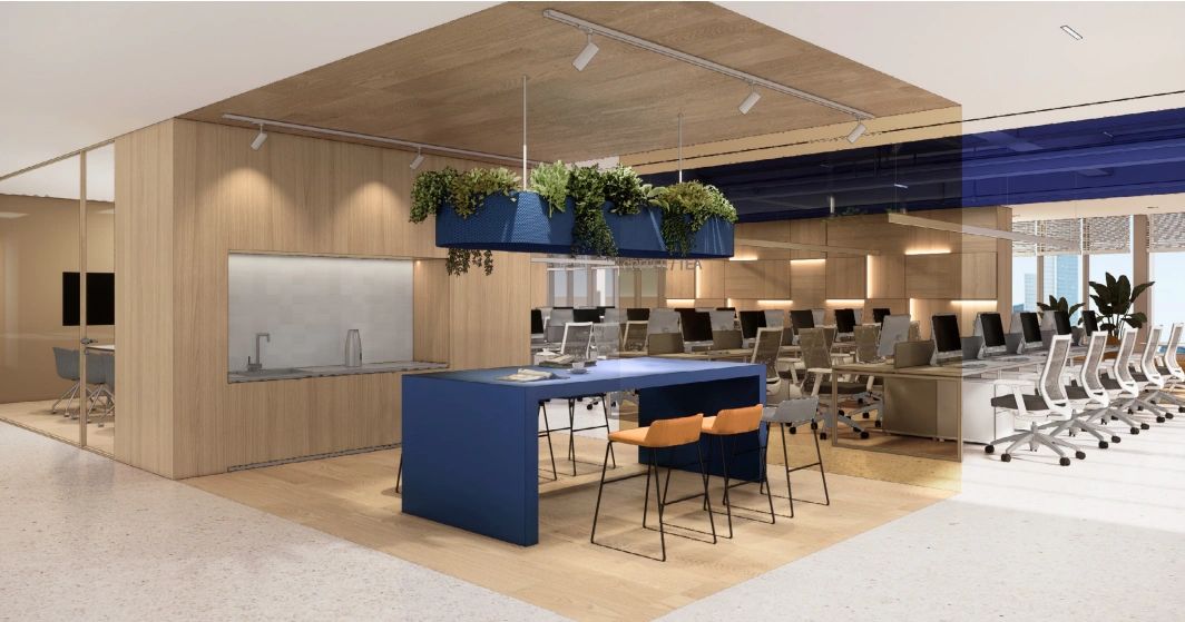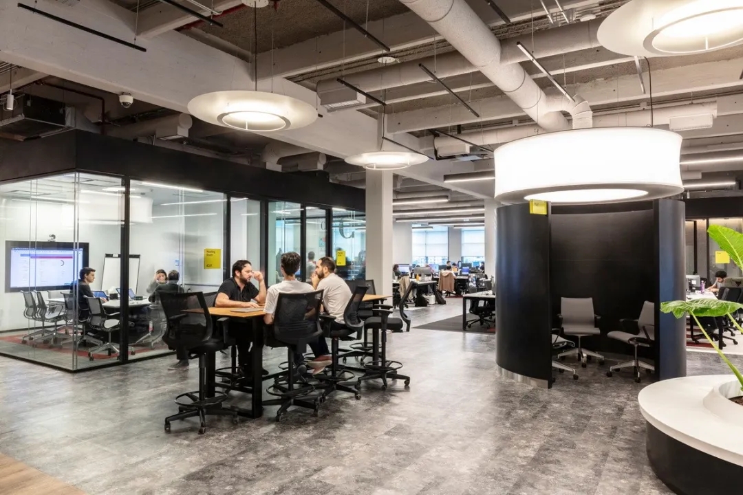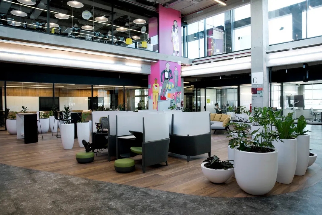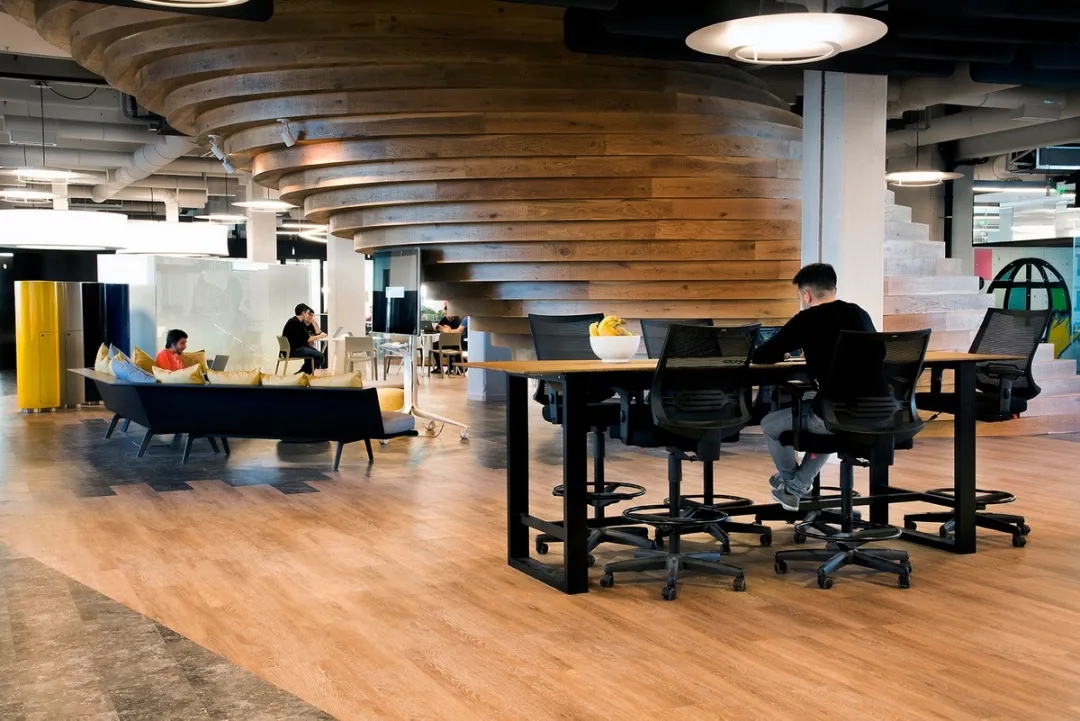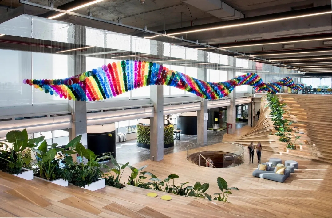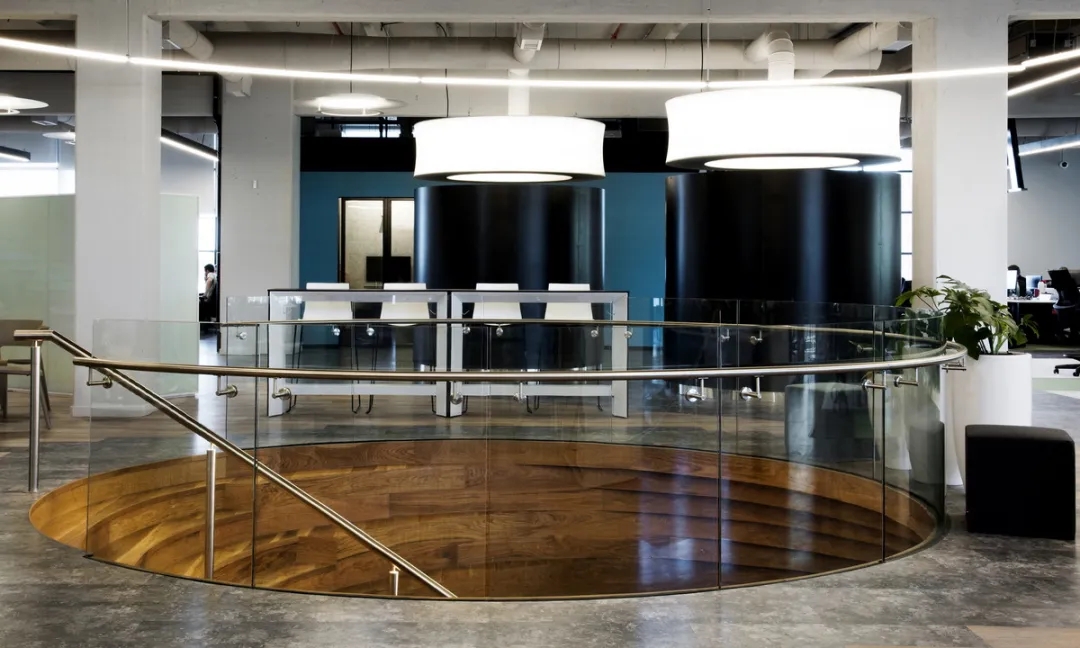 室内设计的材料配色主要是用木材、玻璃、植物和艺术品,营造出一个舒适温暖的工作场所。使用玻璃作为隔板使得整个室内空间更加流畅,增进了人们视线的交流,并能够充分地采光。地板设计采用了塑胶地板与天然木质地板,同时模块化地毯与独特的定制设计相结合,共同创造了舒适的办公空间。设计的核心要点是实现楼层之间的快速转换和达到节约能源的目的。该办公楼已被认证为LEED白金级绿色建筑认证,与此同时在建筑楼,办公空间也融入了可持续的设计理念。全新的使用方式,创造了一个标志性空间,而这一切要得益于一个增加员工归属感的流动空间的初步设想。