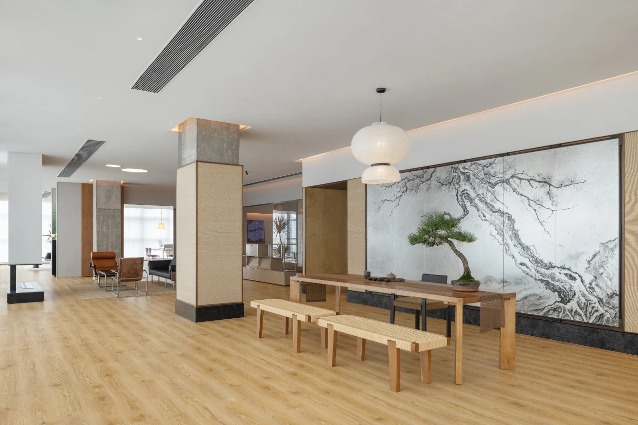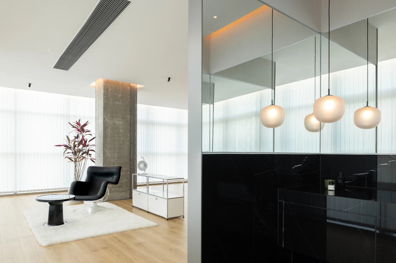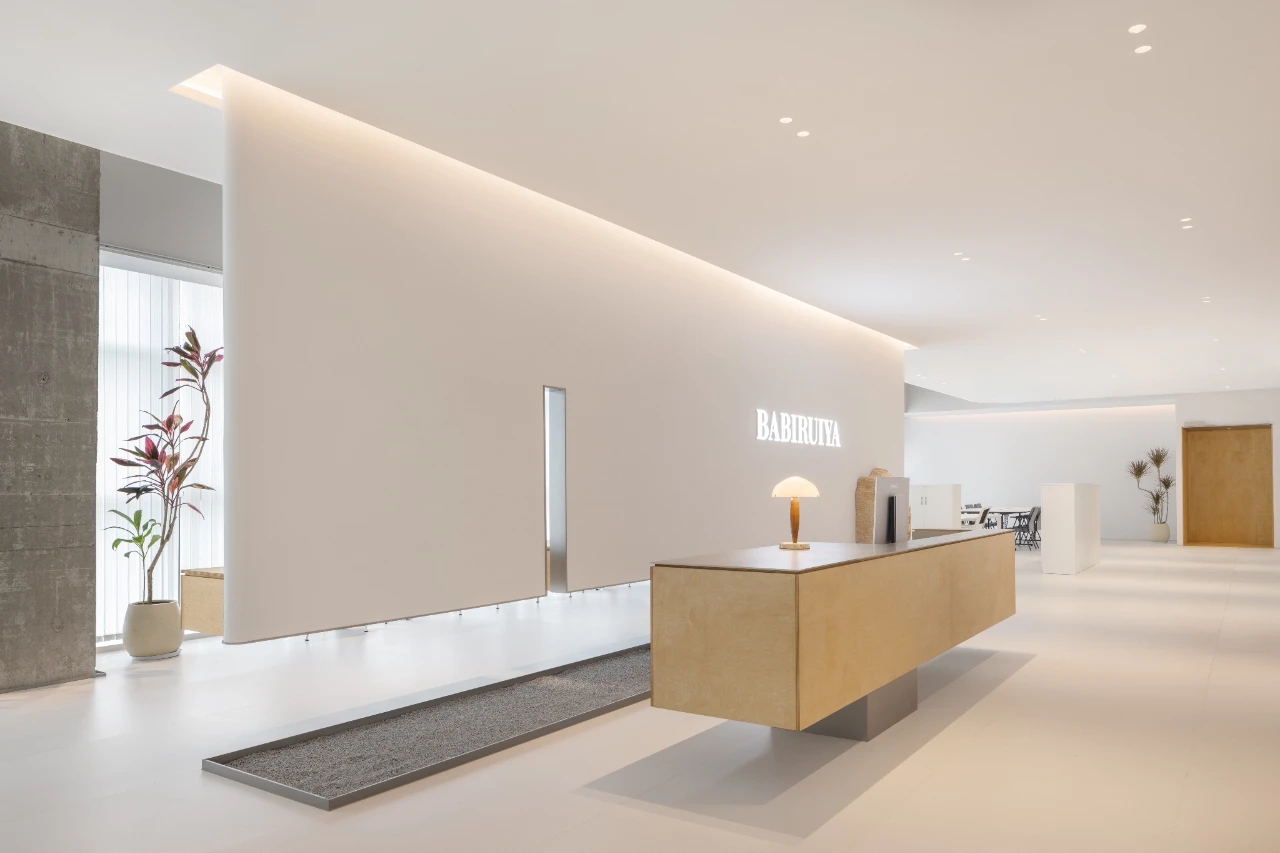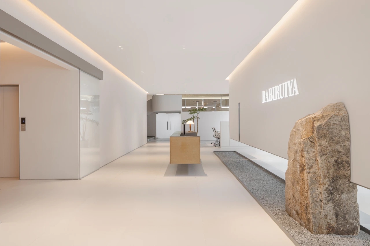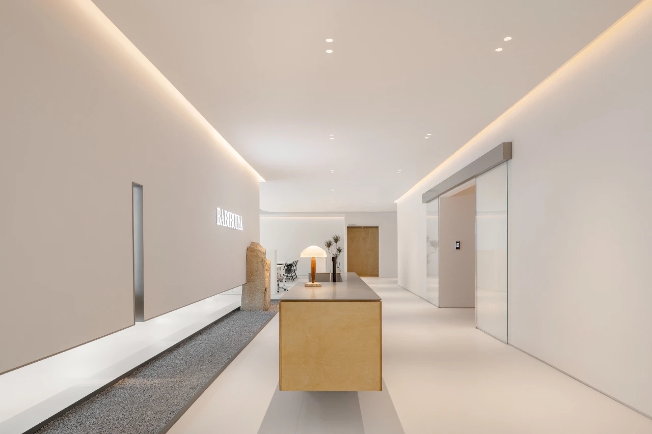 项目集办公、接洽、展示、设计等多元用途为一体,复合的功能需求在约1500㎡空间内有序规划。视电梯厅为“轴”铺展洄游动线,串联对外的接待、洽谈、展示区与对内的工作、管理、设计打样场所。品牌墙悬而不落,一侧角倚石嶙峋,面素白有狭门透景;其下留空,底铺细石,无水而用“光”拟水波静谧;LOGO衍光,自成现代设计与东方写意神合。衍其韵,以“白”寓“简”,其实丰沛,克制地在理性逻辑下既实现了品牌识别性外观的表达,亦满足空间不同风格的有机整合。