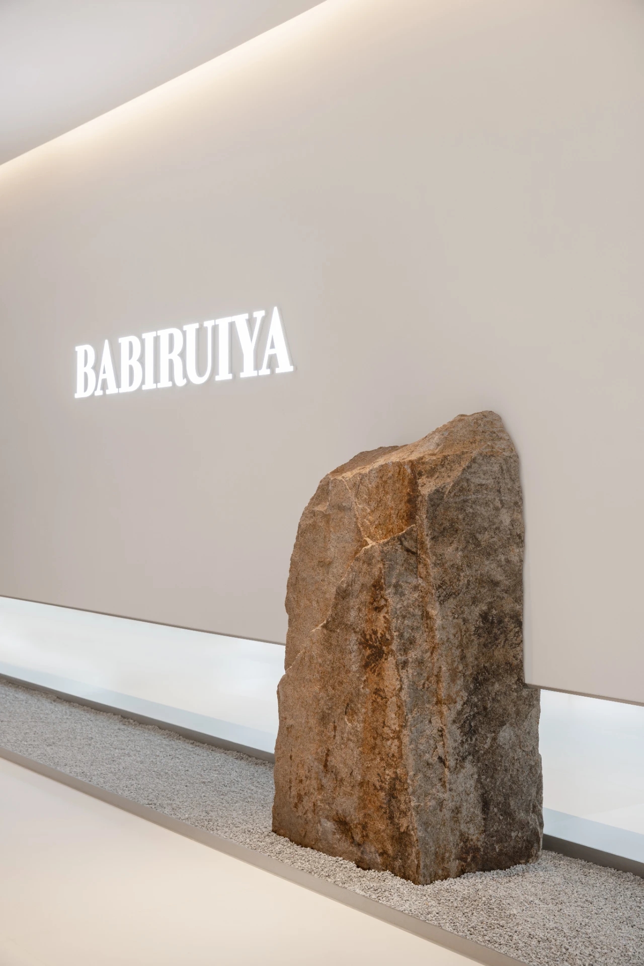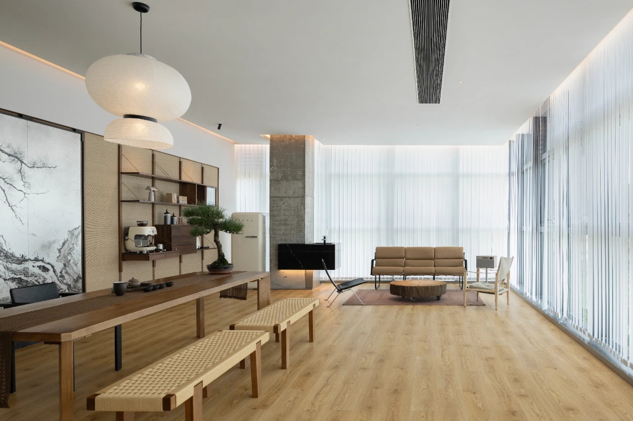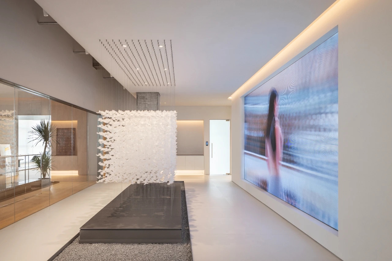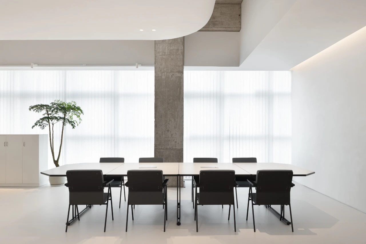 项目集办公、接洽、展示、设计等多元用途为一体,复合的功能需求在约1500㎡空间内有序规划。视电梯厅为“轴”铺展洄游动线,串联对外的接待、洽谈、展示区与对内的工作、管理、设计打样场所。品牌墙悬而不落,一侧角倚石嶙峋,面素白有狭门透景;其下留空,底铺细石,无水而用“光”拟水波静谧;LOGO衍光,自成现代设计与东方写意神合。衍其韵,以“白”寓“简”,其实丰沛,克制地在理性逻辑下既实现了品牌识别性外观的表达,亦满足空间不同风格的有机整合。