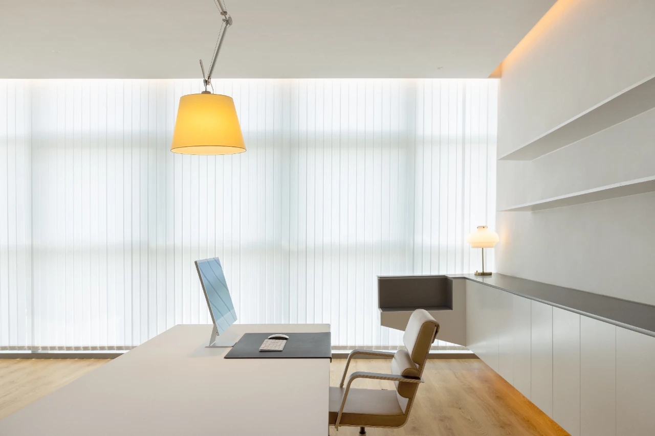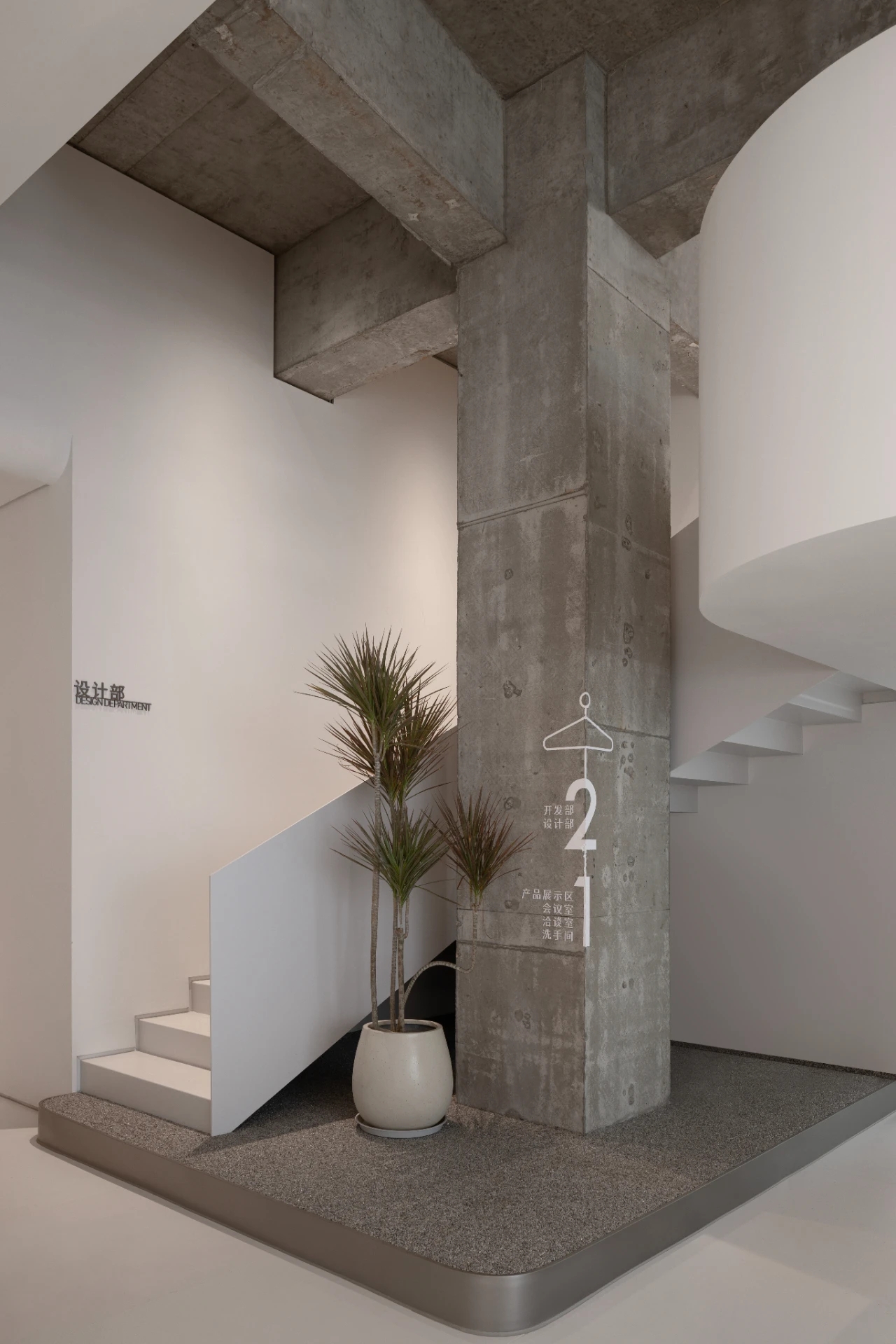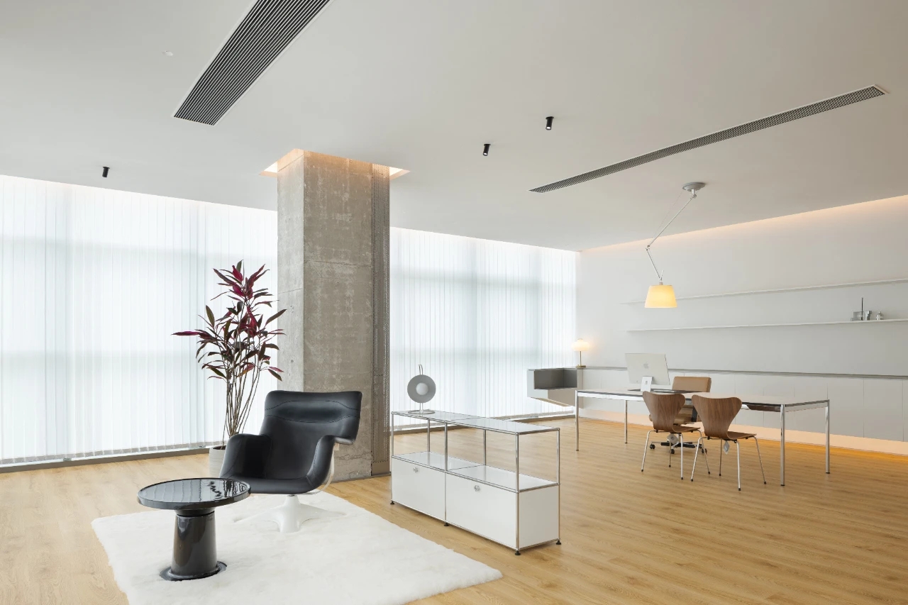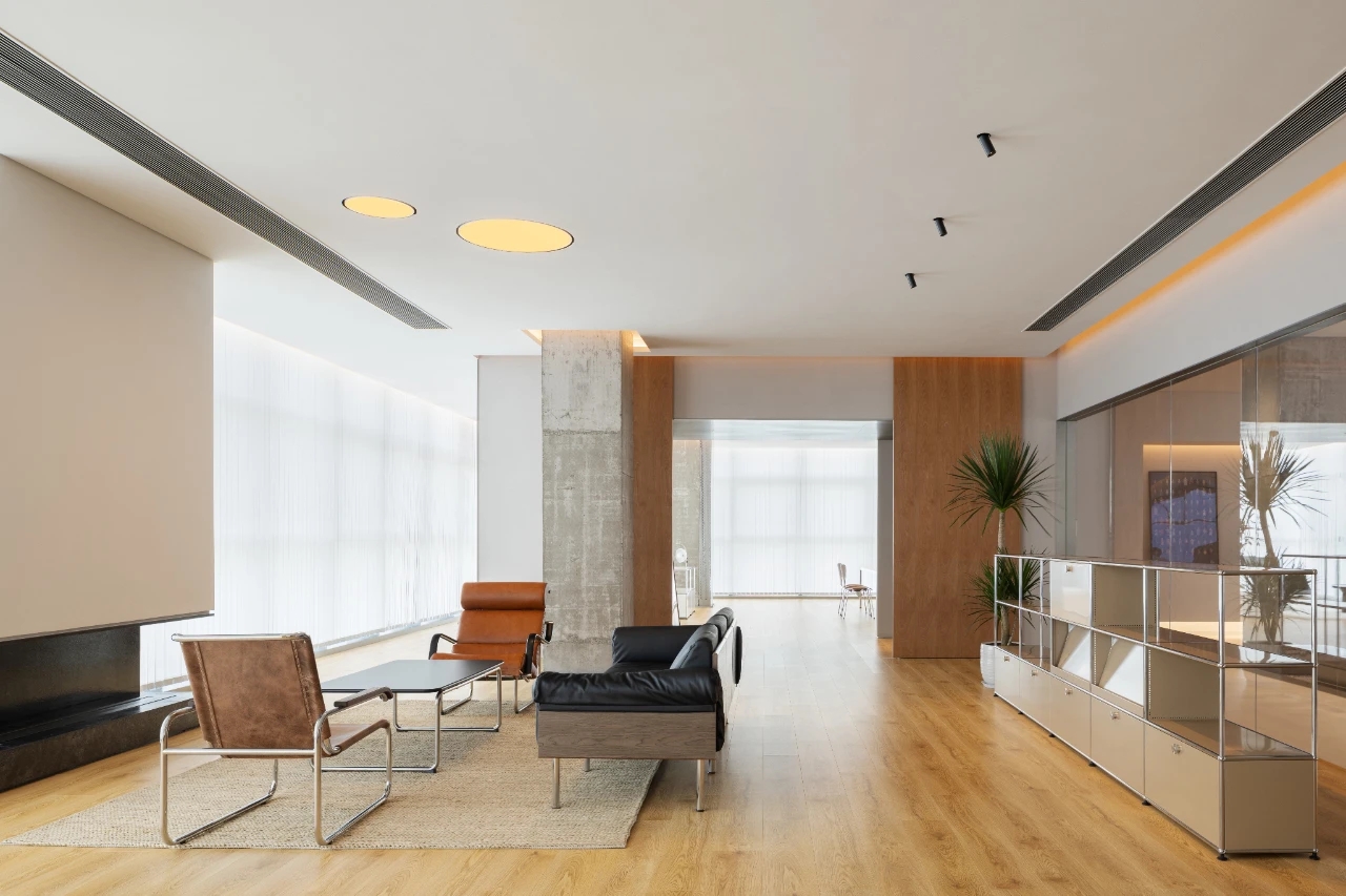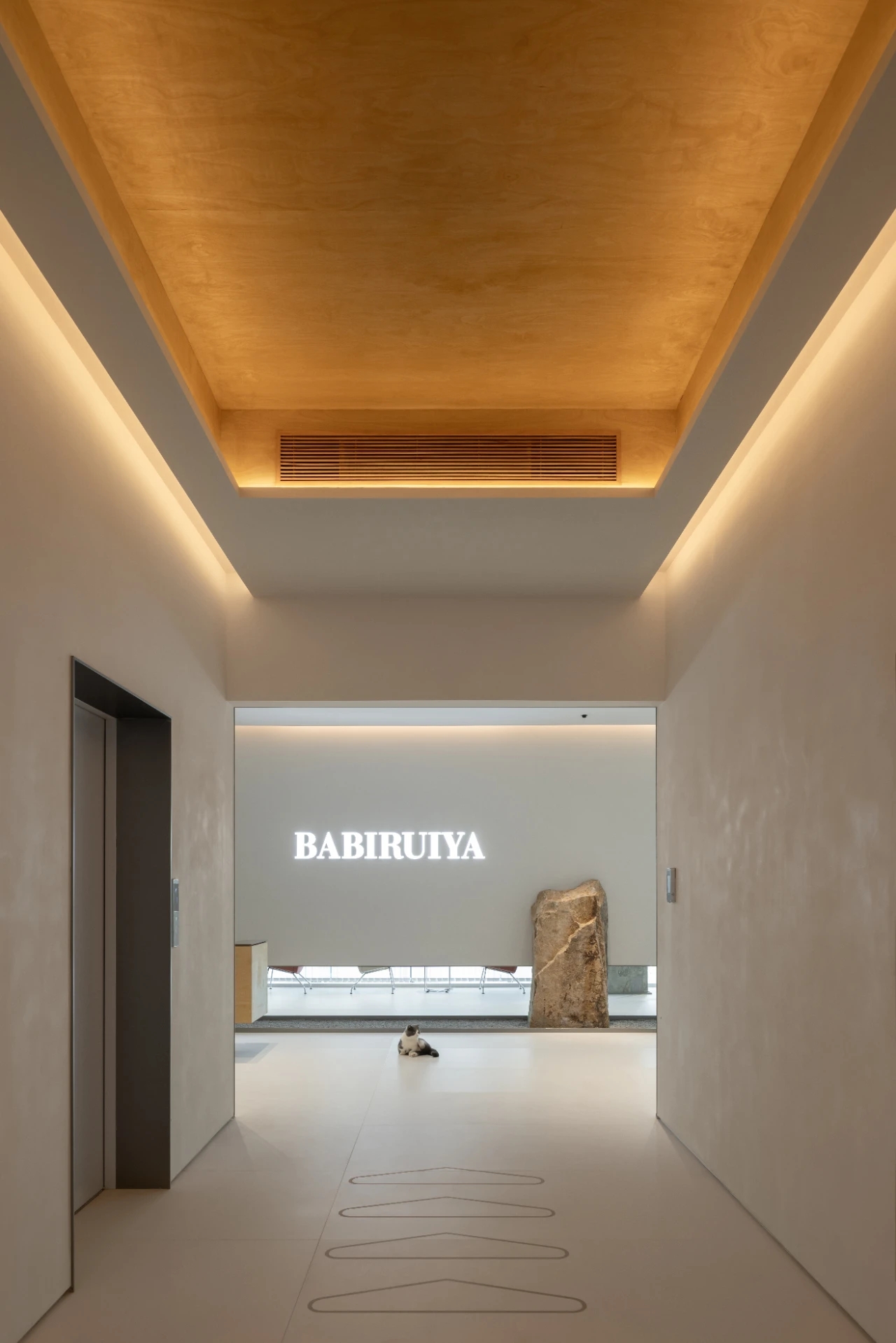 项目集办公、接洽、展示、设计等多元用途为一体,复合的功能需求在约1500㎡空间内有序规划。视电梯厅为“轴”铺展洄游动线,串联对外的接待、洽谈、展示区与对内的工作、管理、设计打样场所。品牌墙悬而不落,一侧角倚石嶙峋,面素白有狭门透景;其下留空,底铺细石,无水而用“光”拟水波静谧;LOGO衍光,自成现代设计与东方写意神合。衍其韵,以“白”寓“简”,其实丰沛,克制地在理性逻辑下既实现了品牌识别性外观的表达,亦满足空间不同风格的有机整合。