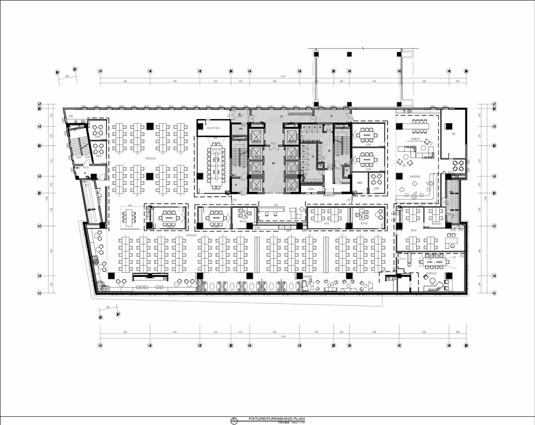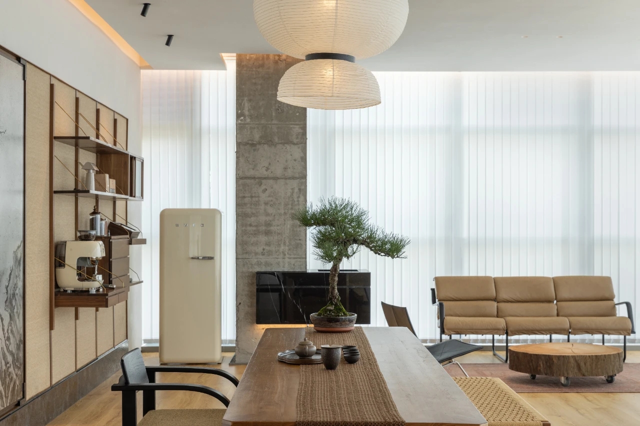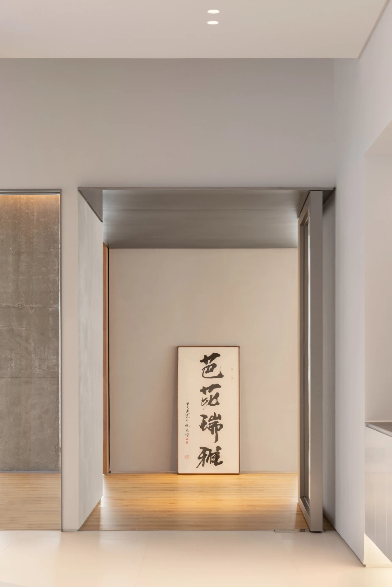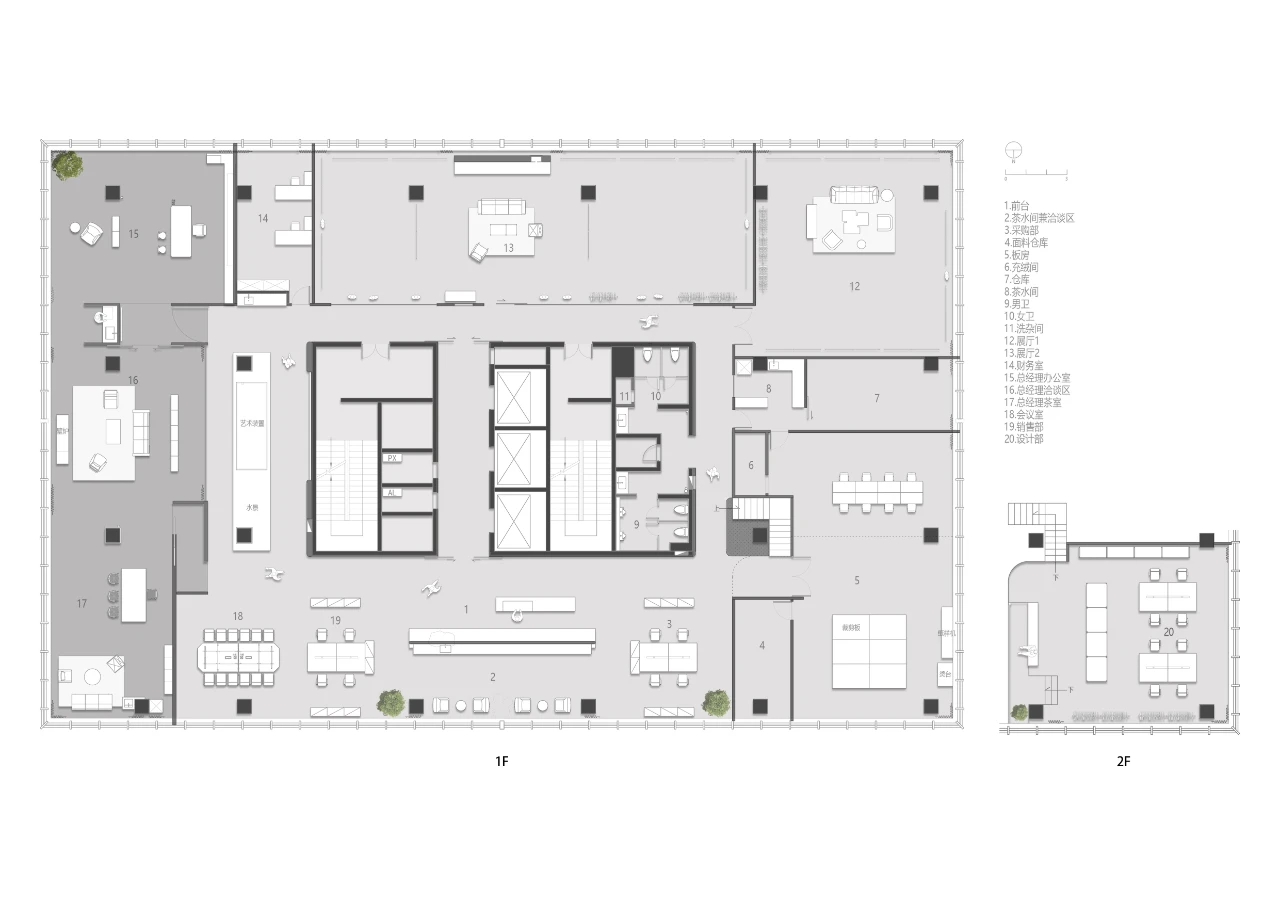 项目集办公、接洽、展示、设计等多元用途为一体,复合的功能需求在约1500㎡空间内有序规划。视电梯厅为“轴”铺展洄游动线,串联对外的接待、洽谈、展示区与对内的工作、管理、设计打样场所。品牌墙悬而不落,一侧角倚石嶙峋,面素白有狭门透景;其下留空,底铺细石,无水而用“光”拟水波静谧;LOGO衍光,自成现代设计与东方写意神合。衍其韵,以“白”寓“简”,其实丰沛,克制地在理性逻辑下既实现了品牌识别性外观的表达,亦满足空间不同风格的有机整合。