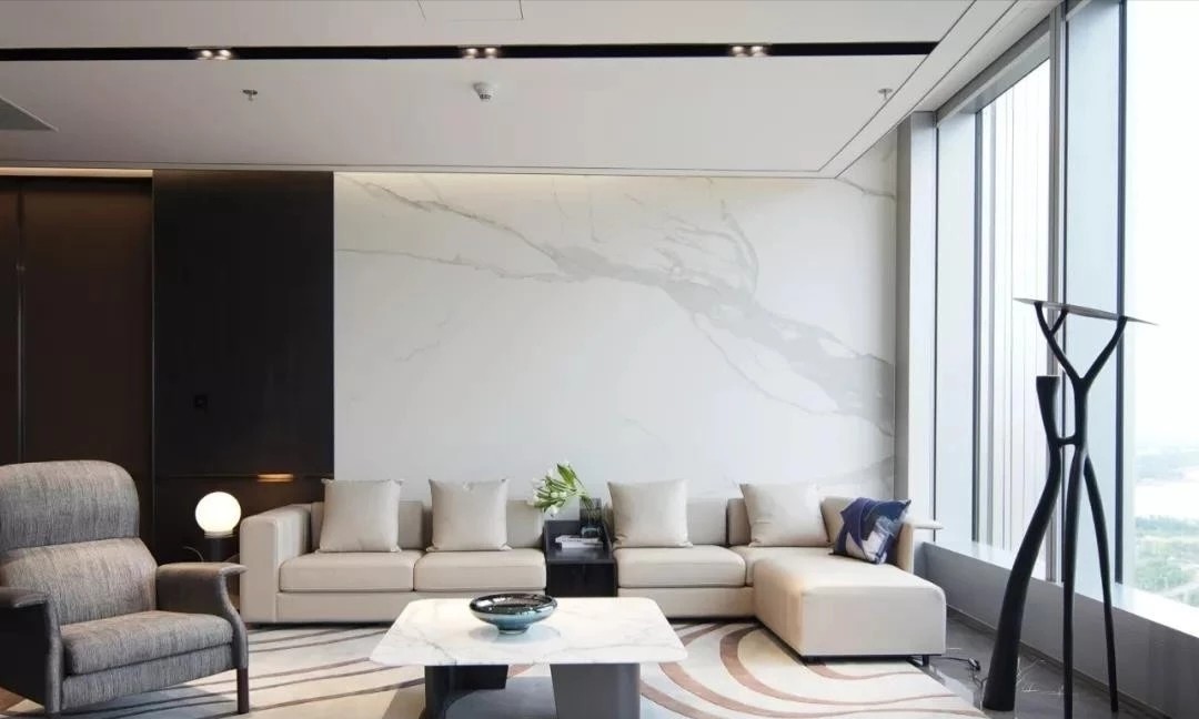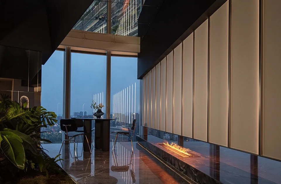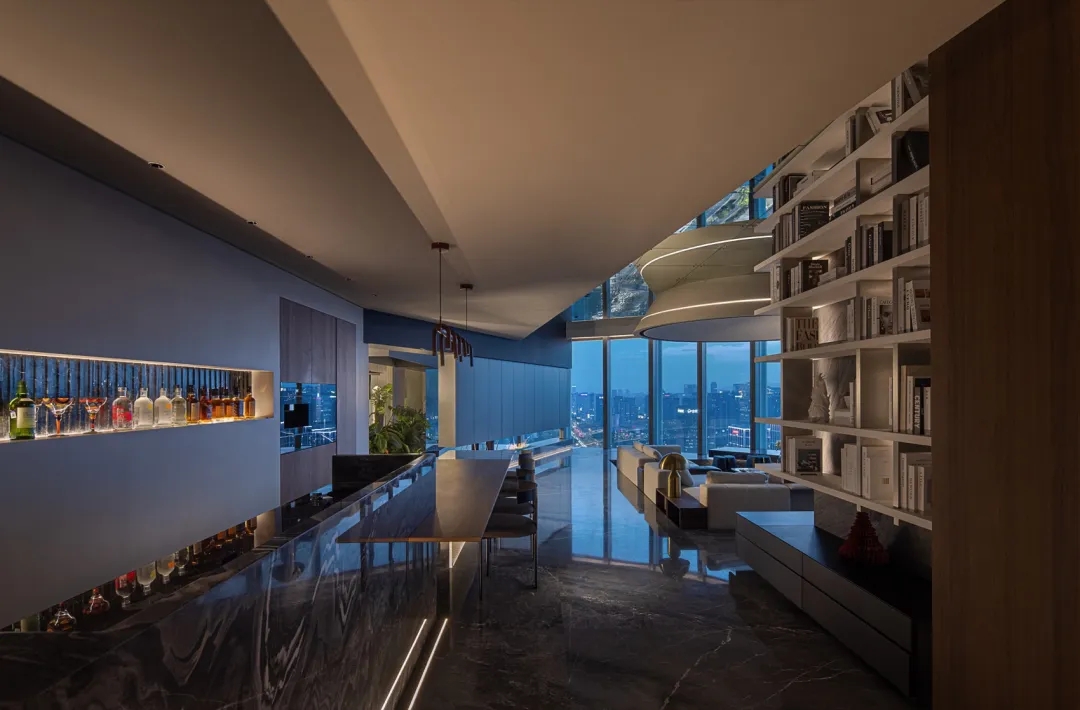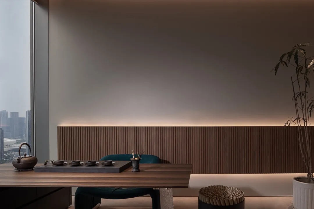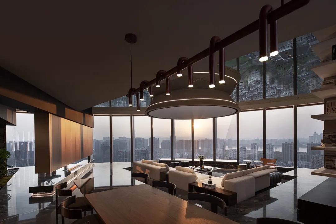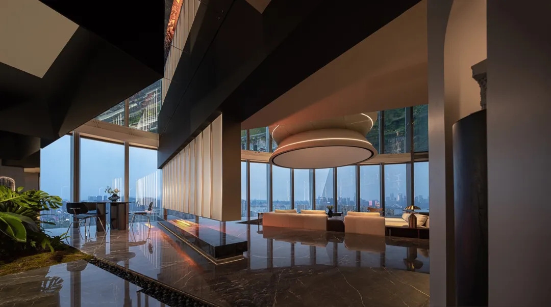 设计师在空间的中心区域打造了一个下沉式会客区,与门口抬高处完美衔接。顶部镜面设计在视觉上实现纵向延伸,为减轻眩晕感,下沉式沙发区域采用圆形顶面造型,营造安全舒适的氛围。收纳吊柜作为空间区分的一环,位于下沉式区域旁。室内造景则营造出室内花园的氛围,将自然景色引入室内。长方形灯罩的吊顶设计,结合灯膜照明技术,呈现自然天光的光线效果。靠近窗户处设置的休闲桌椅,成为一处放松区域,让人在品茗观景中享受自然风光。
