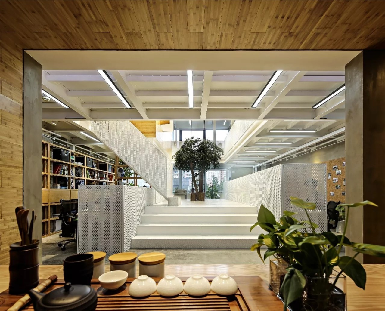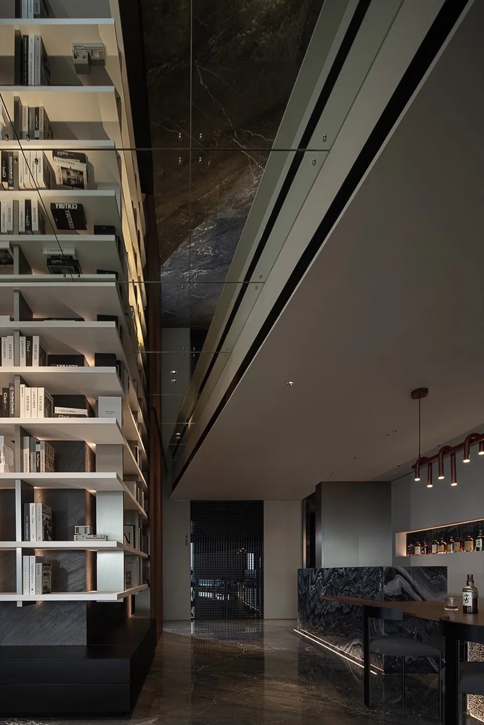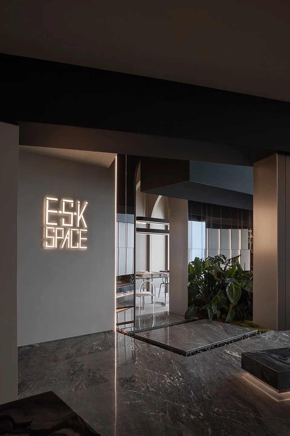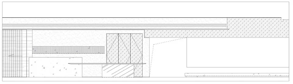 设计师在空间的中心区域打造了一个下沉式会客区,与门口抬高处完美衔接。顶部镜面设计在视觉上实现纵向延伸,为减轻眩晕感,下沉式沙发区域采用圆形顶面造型,营造安全舒适的氛围。收纳吊柜作为空间区分的一环,位于下沉式区域旁。室内造景则营造出室内花园的氛围,将自然景色引入室内。长方形灯罩的吊顶设计,结合灯膜照明技术,呈现自然天光的光线效果。靠近窗户处设置的休闲桌椅,成为一处放松区域,让人在品茗观景中享受自然风光。