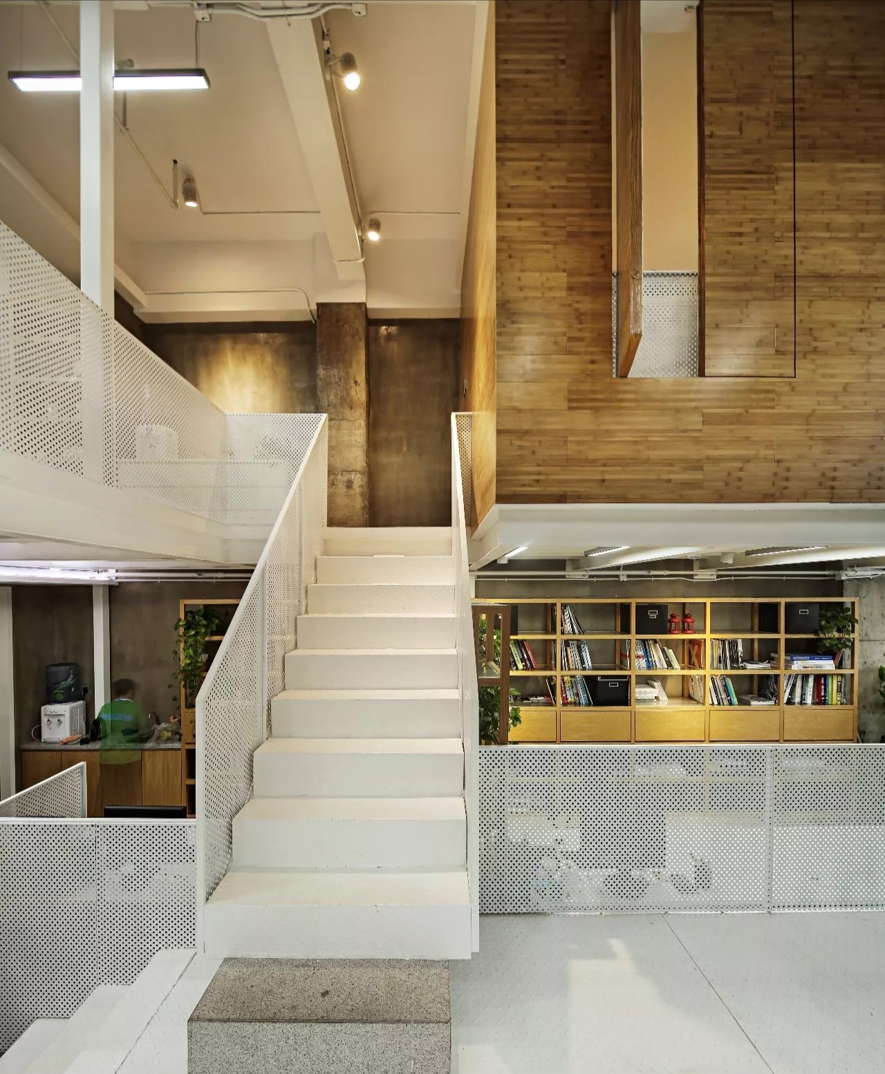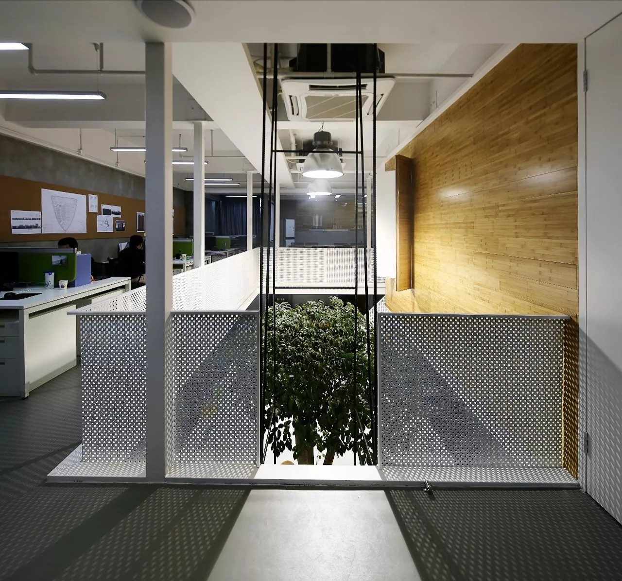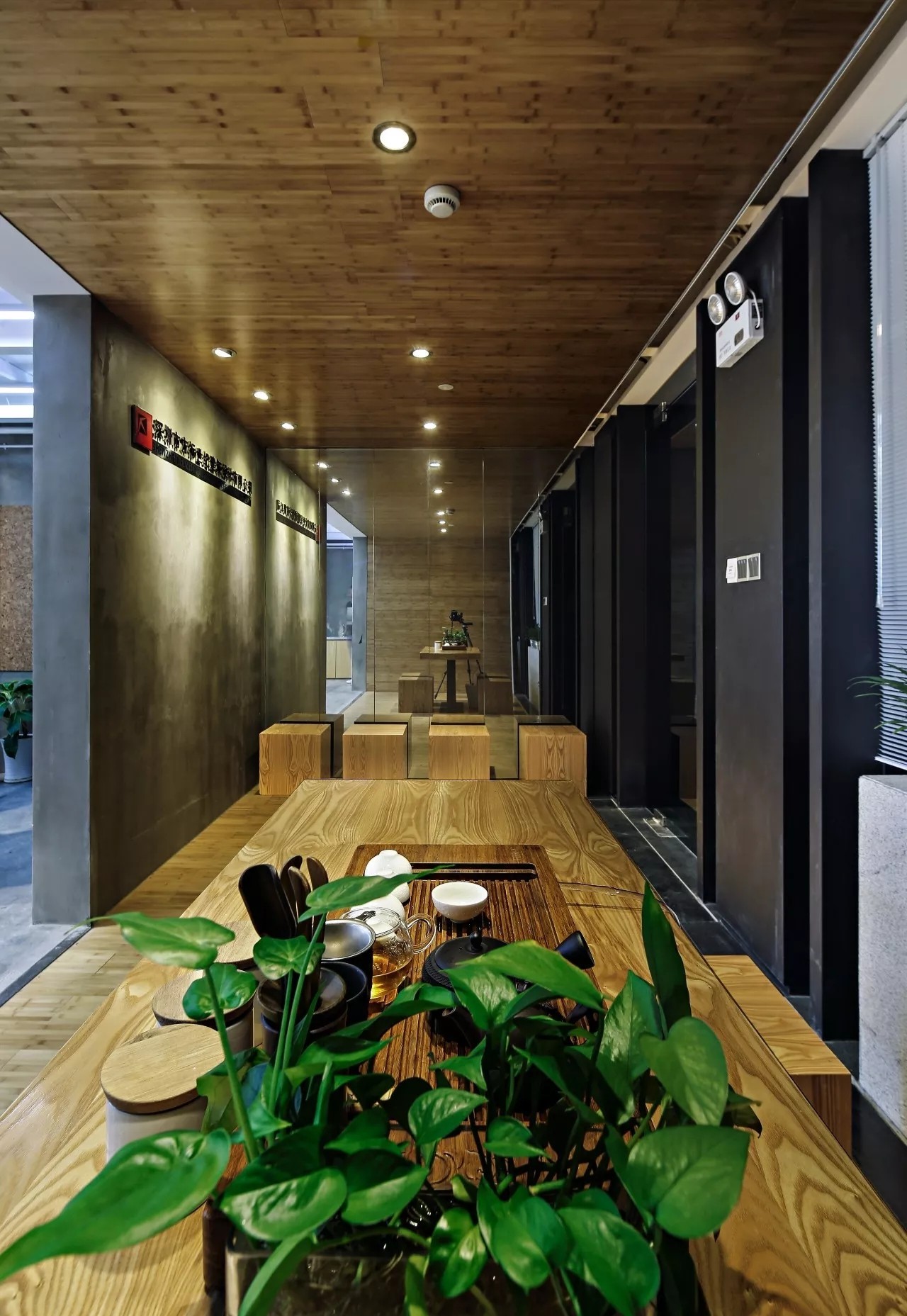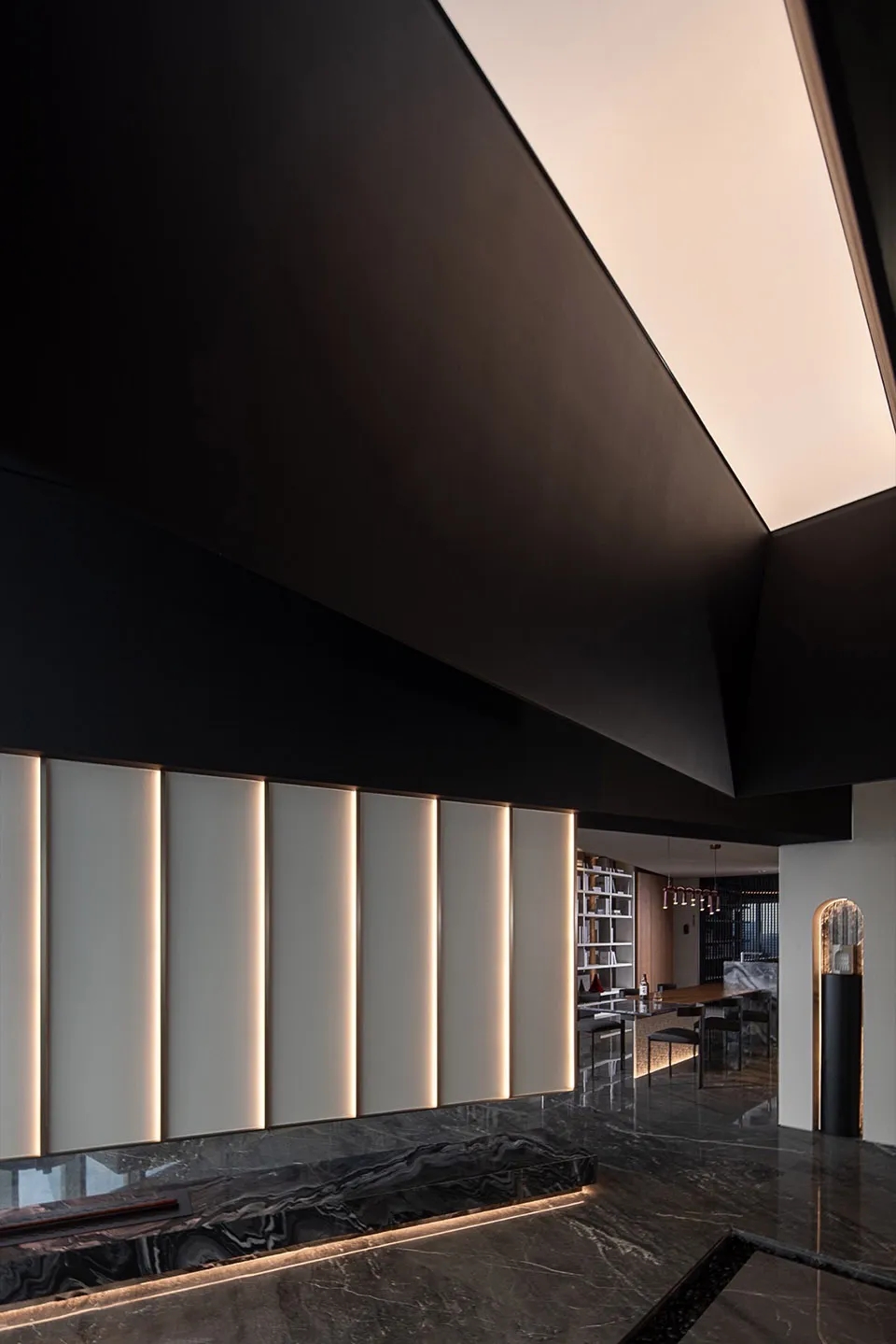 设计师在空间的中心区域打造了一个下沉式会客区,与门口抬高处完美衔接。顶部镜面设计在视觉上实现纵向延伸,为减轻眩晕感,下沉式沙发区域采用圆形顶面造型,营造安全舒适的氛围。收纳吊柜作为空间区分的一环,位于下沉式区域旁。室内造景则营造出室内花园的氛围,将自然景色引入室内。长方形灯罩的吊顶设计,结合灯膜照明技术,呈现自然天光的光线效果。靠近窗户处设置的休闲桌椅,成为一处放松区域,让人在品茗观景中享受自然风光。