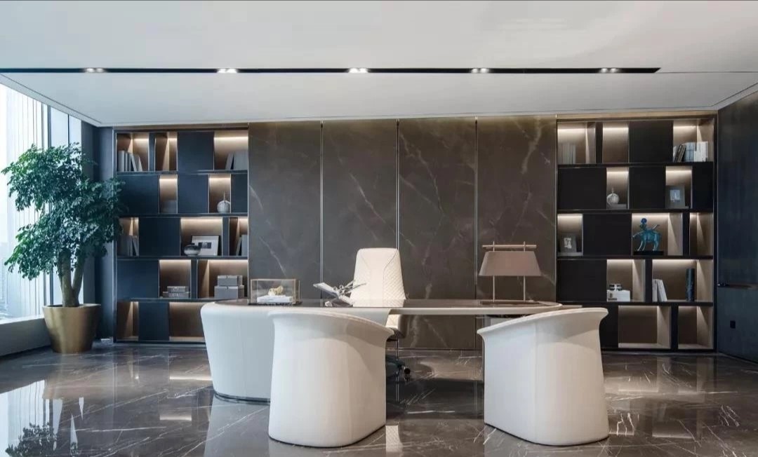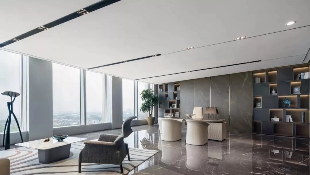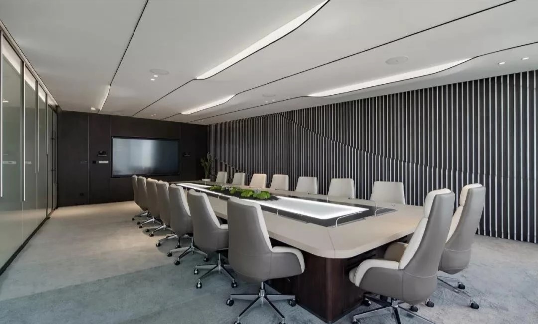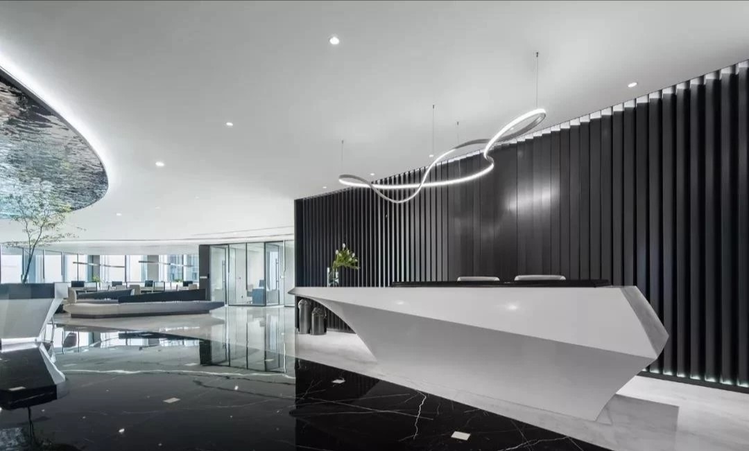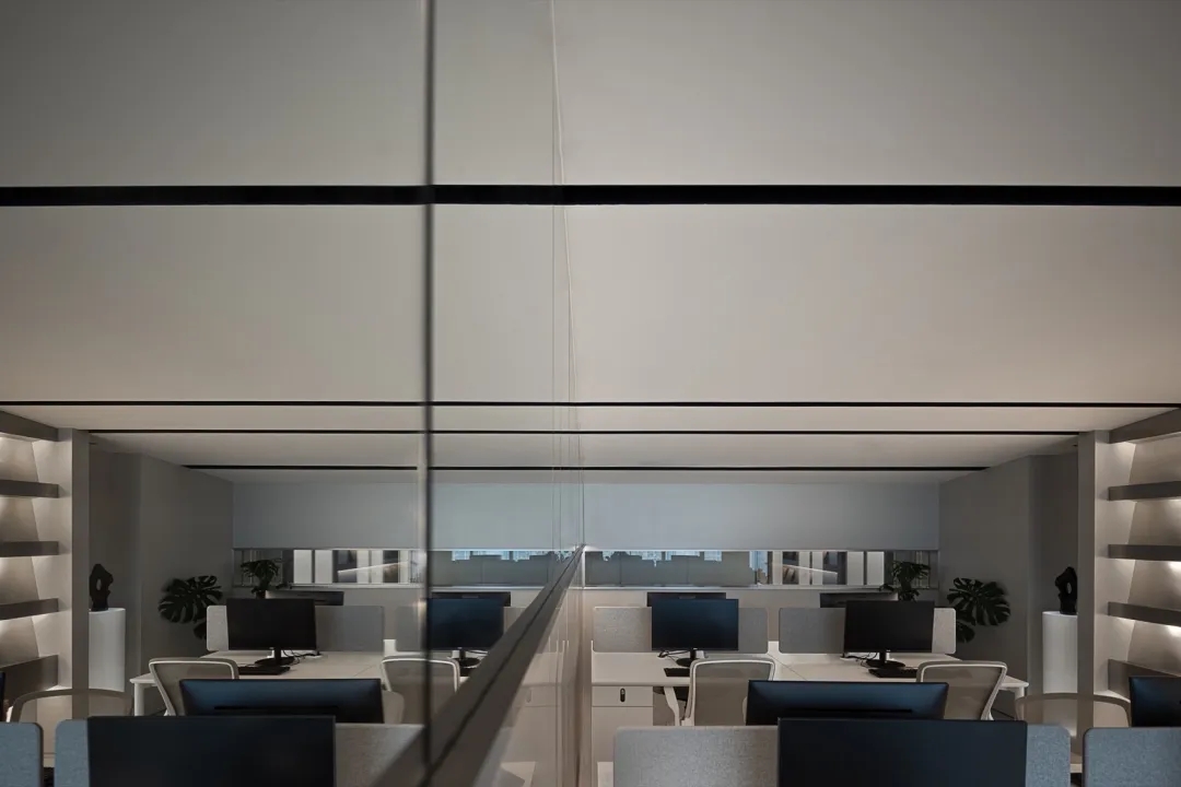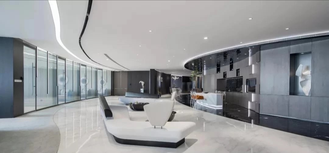 软装办公区作为整个空间的重要组成部分,包括软装选样区、办公室等区域。在材质和造型上注重细节处理,通过墙面镜面材质实现空间过渡。软装选样区采用层层圆弧造型,结合线性光源和镜面衬托,强化空间的视觉延伸感。