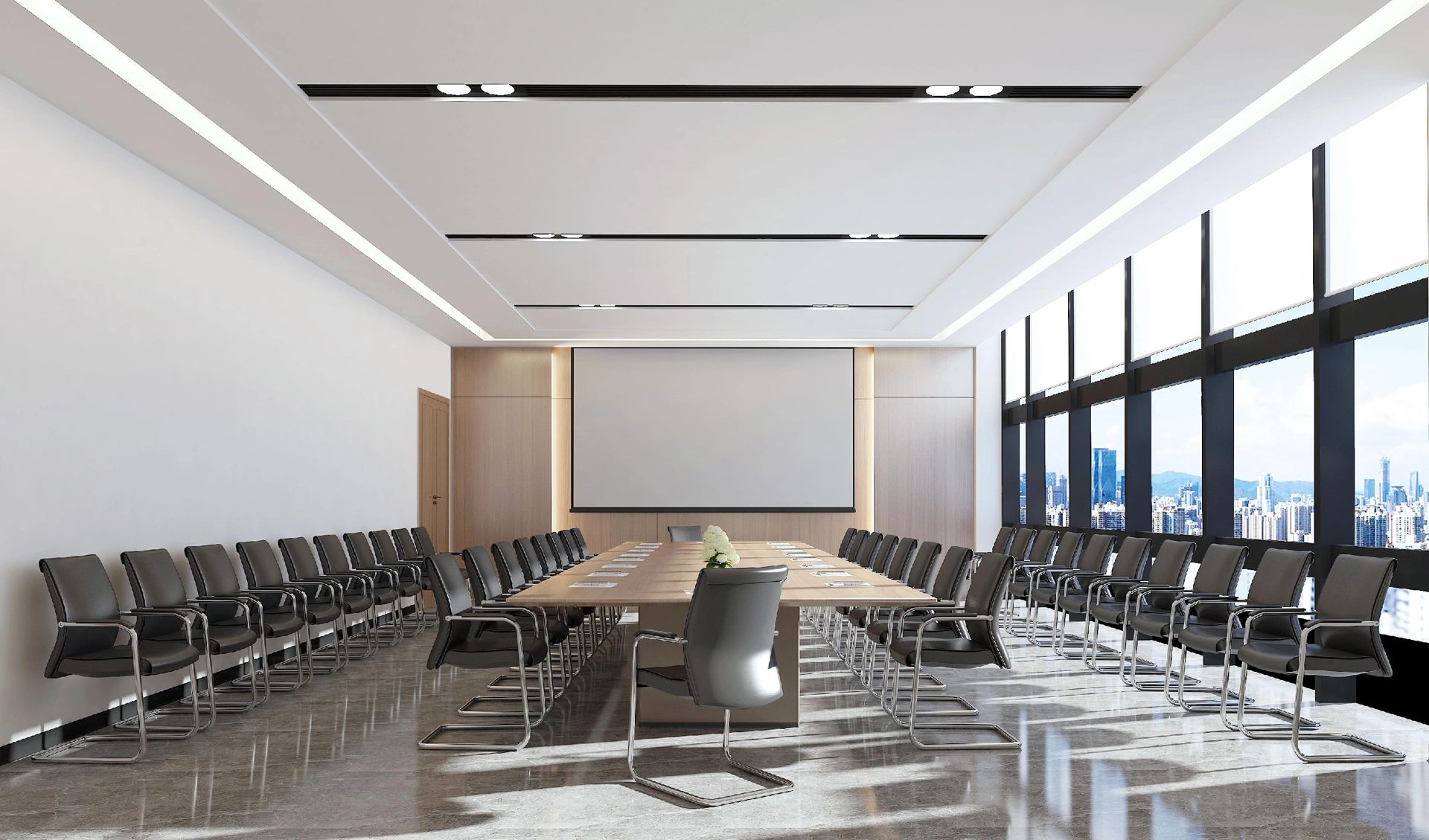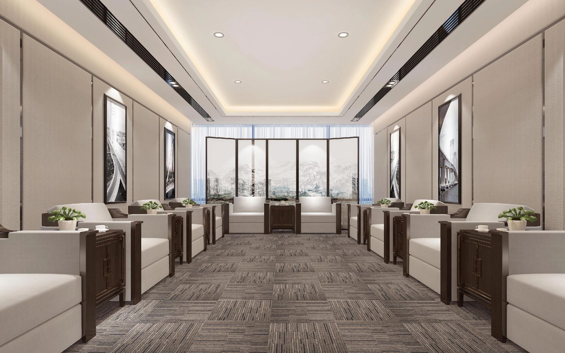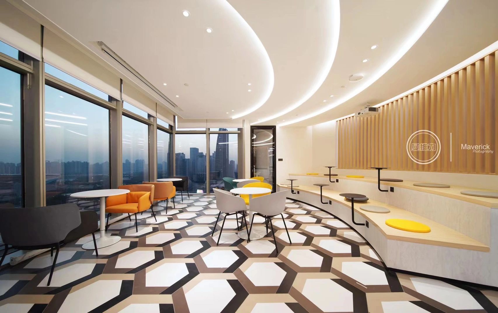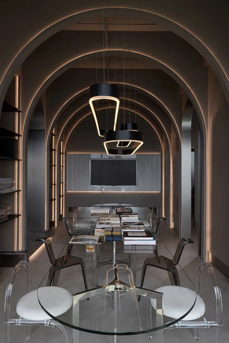 软装办公区作为整个空间的重要组成部分,包括软装选样区、办公室等区域。在材质和造型上注重细节处理,通过墙面镜面材质实现空间过渡。软装选样区采用层层圆弧造型,结合线性光源和镜面衬托,强化空间的视觉延伸感。