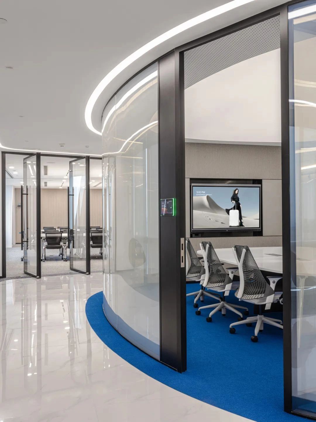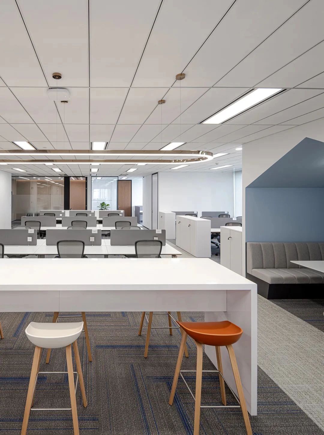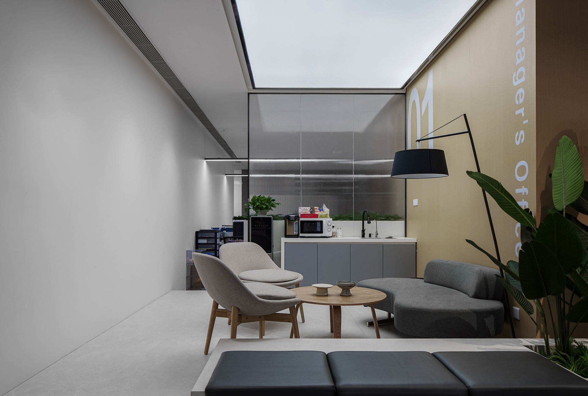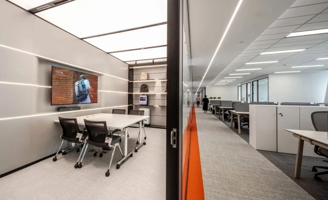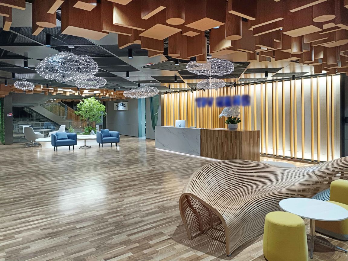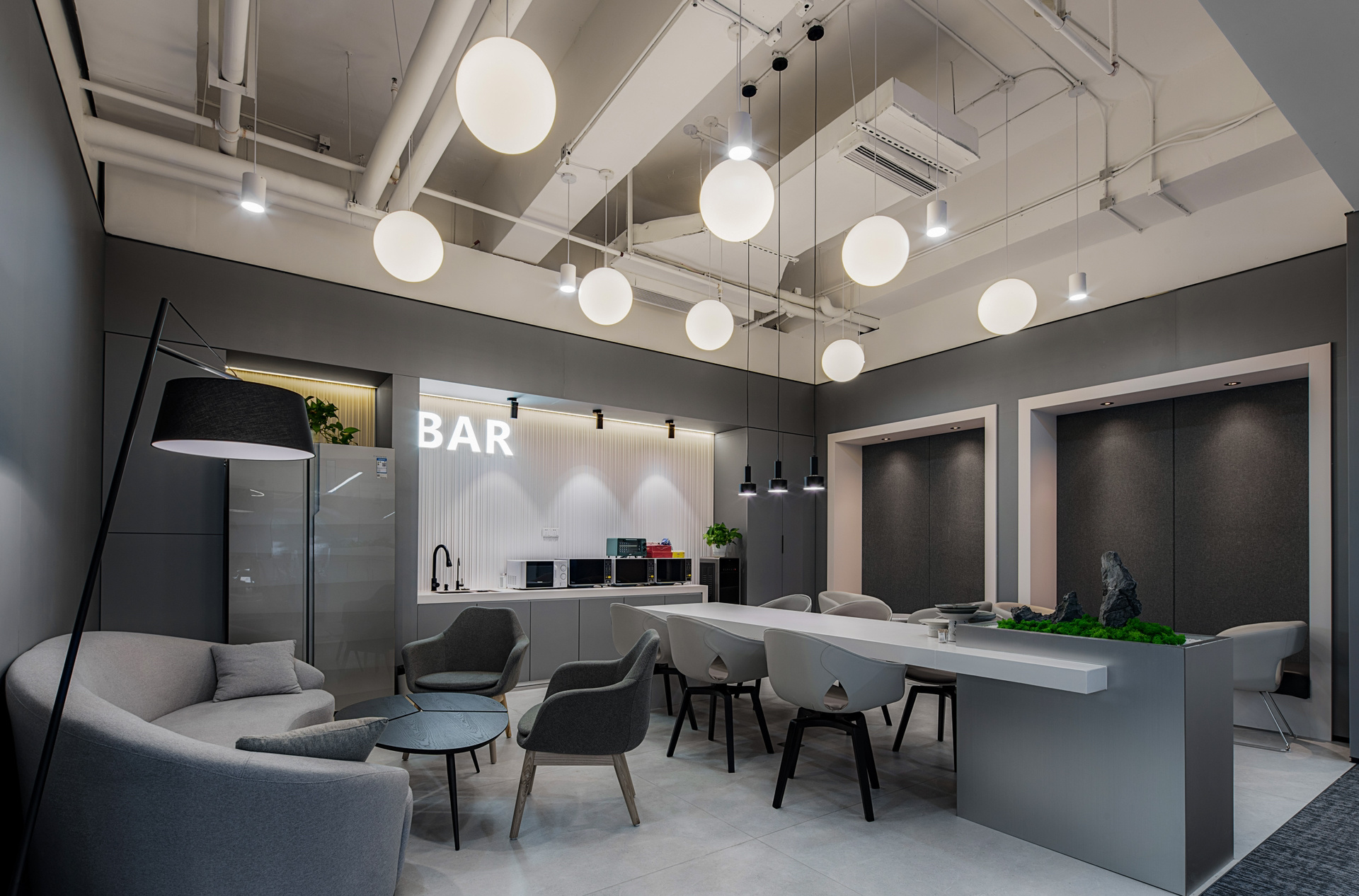 一楼前台 | 接待区以醒目的名称和灯光作为引导,人们依照自己的期待赋予专属的记忆空间,进入一个充满朝气的工作世界。开放式办公区域设计师将开放式办公区域、会议室,接待室办公元素打通集合一起,这样在整体办公的环境下,也有着高效独立的高层办公组合空间。在空间与空间之间不仅仅是利用设计媒介分割,而且利用具有空透、连通性的元素进行分隔,即空间的分割合理。