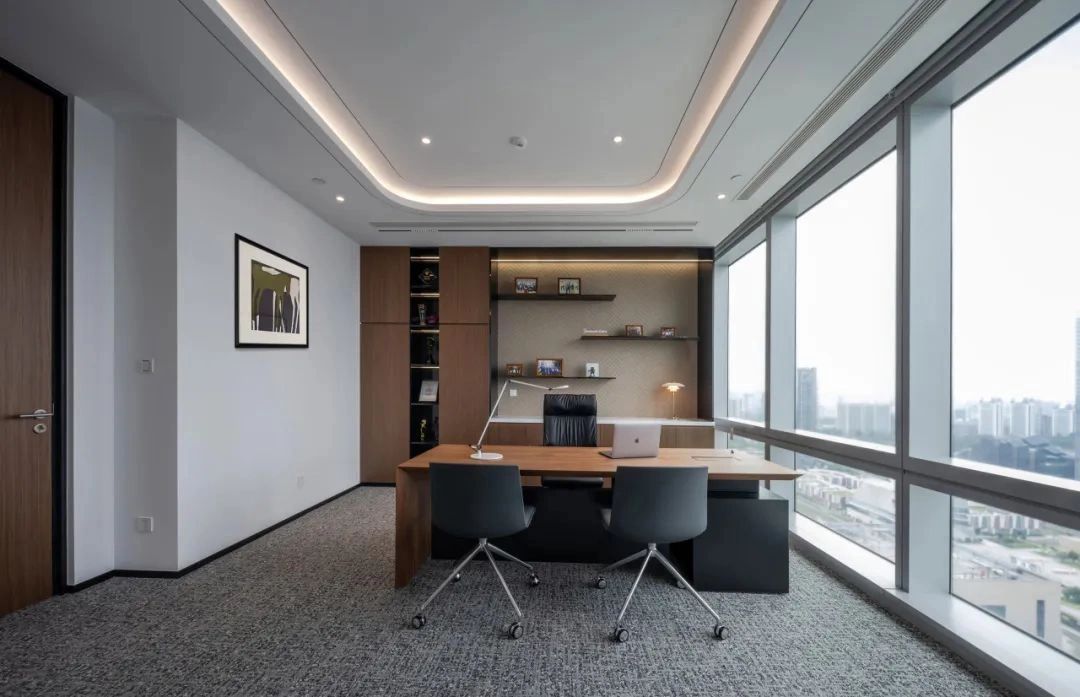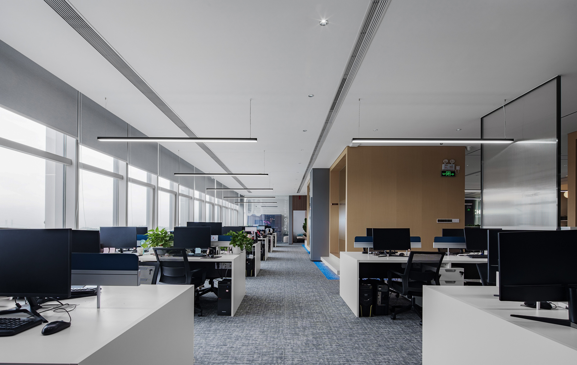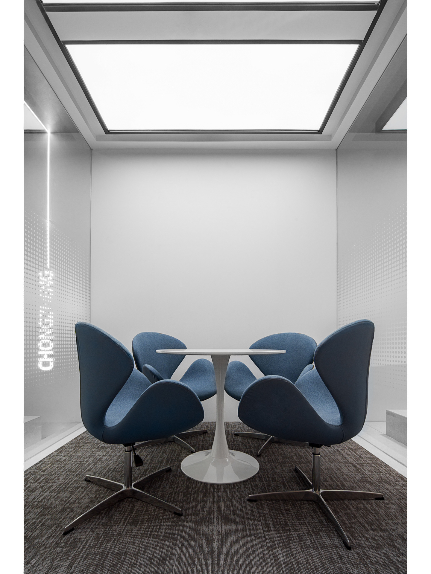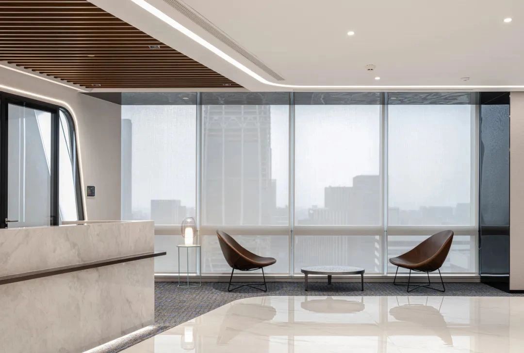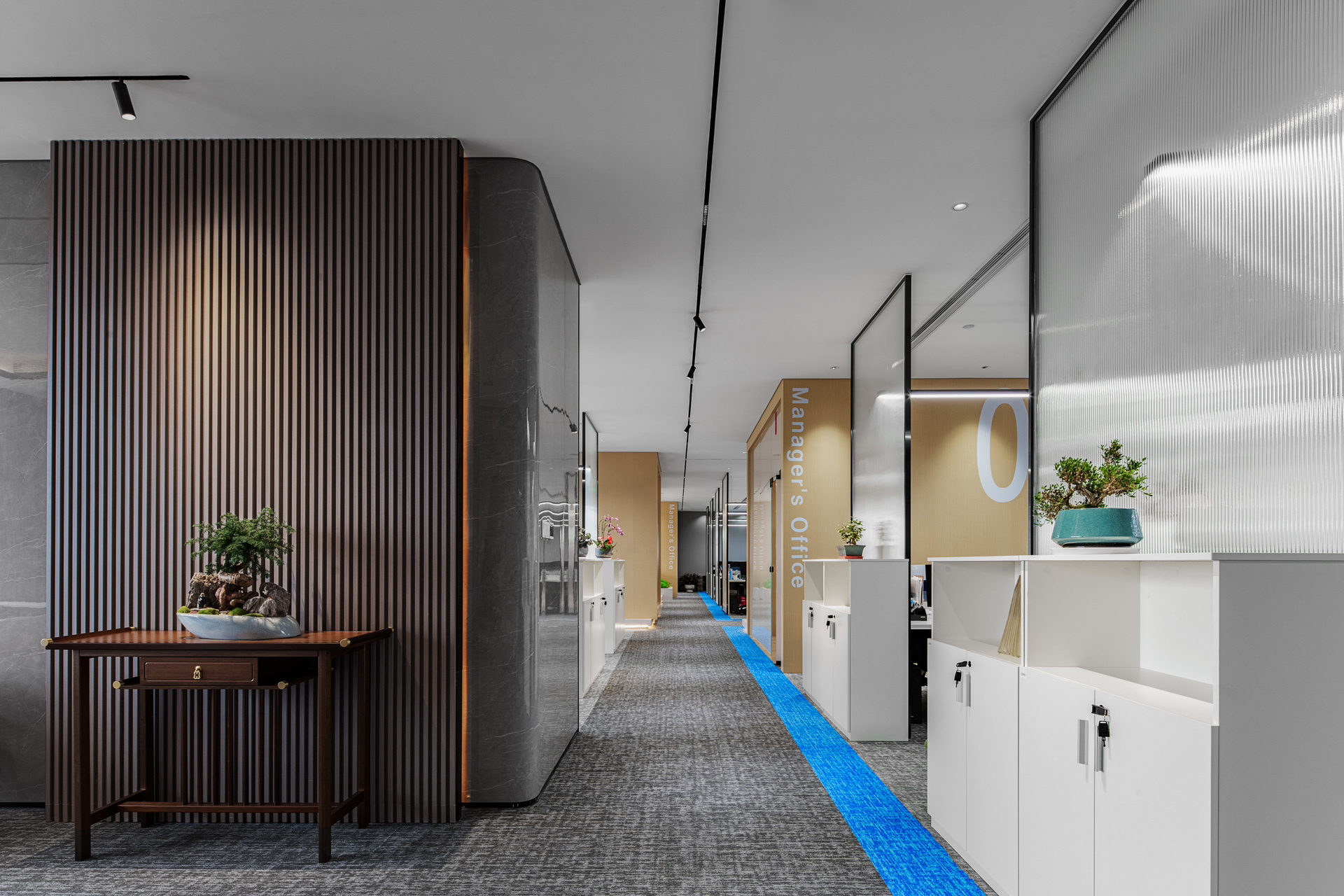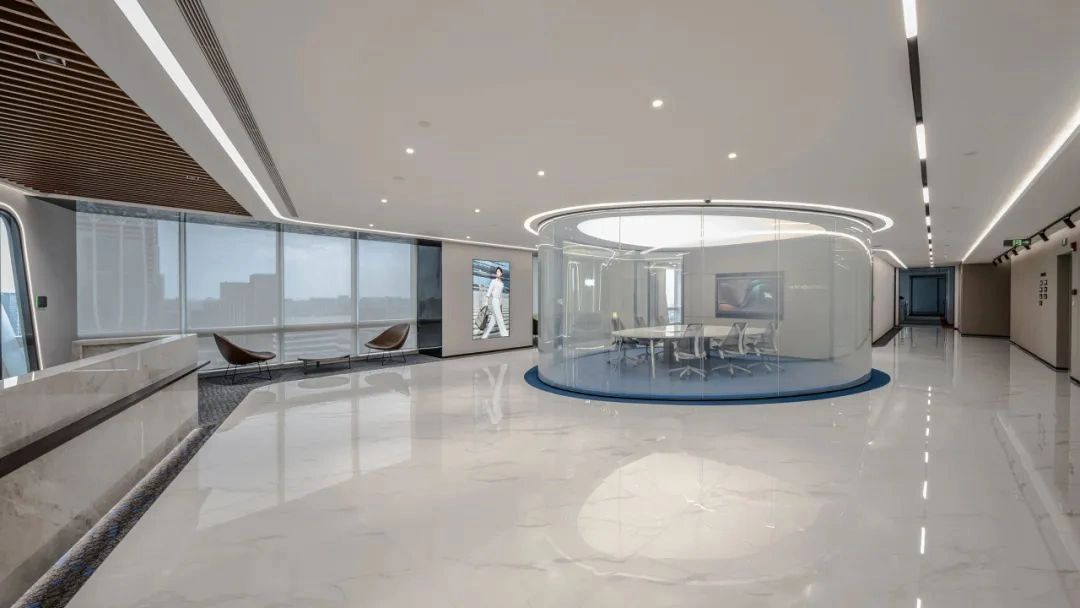 一楼前台 | 接待区以醒目的名称和灯光作为引导,人们依照自己的期待赋予专属的记忆空间,进入一个充满朝气的工作世界。开放式办公区域设计师将开放式办公区域、会议室,接待室办公元素打通集合一起,这样在整体办公的环境下,也有着高效独立的高层办公组合空间。在空间与空间之间不仅仅是利用设计媒介分割,而且利用具有空透、连通性的元素进行分隔,即空间的分割合理。
