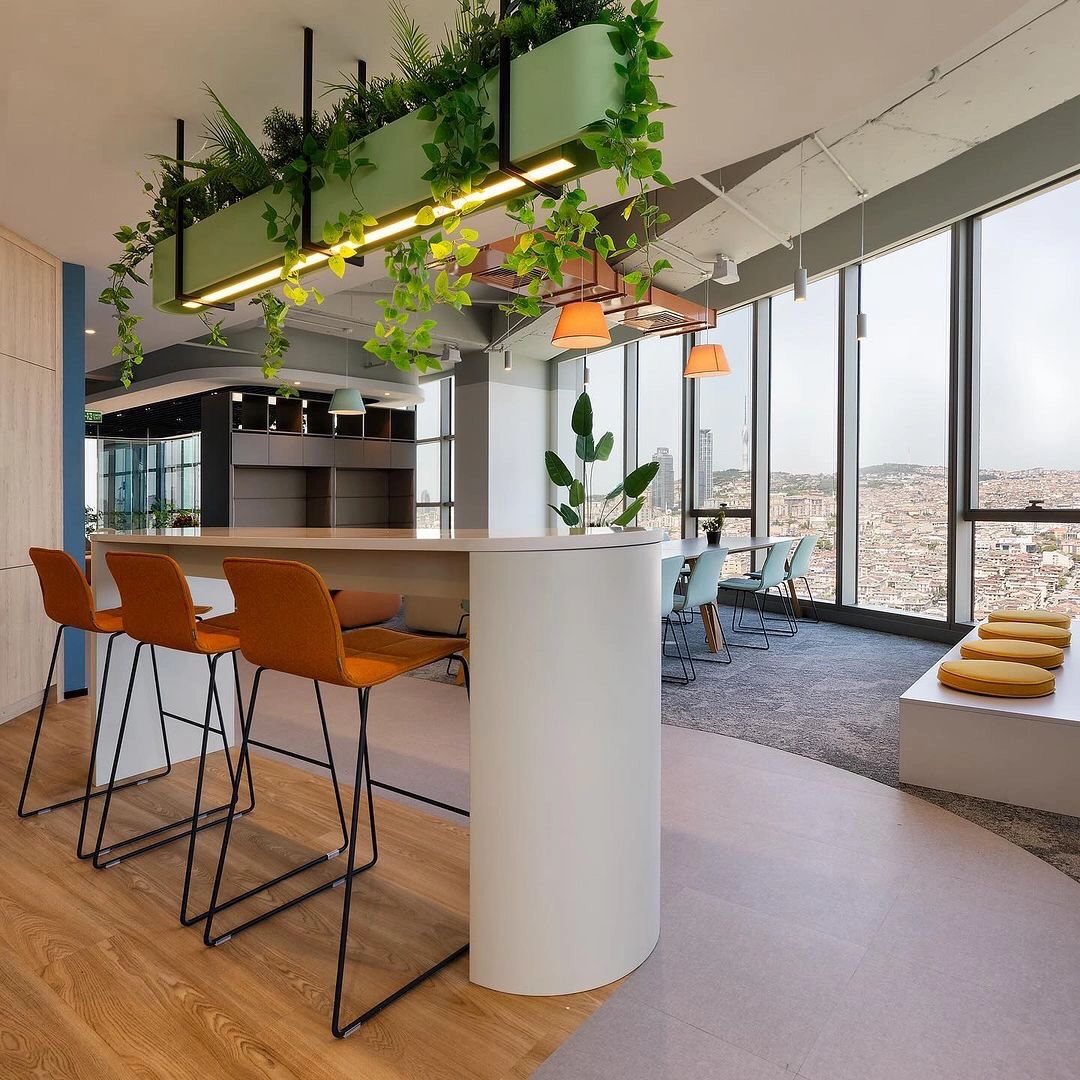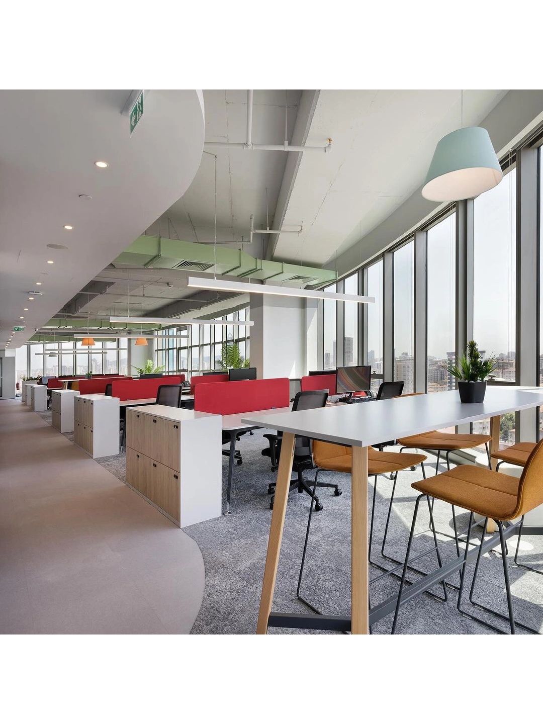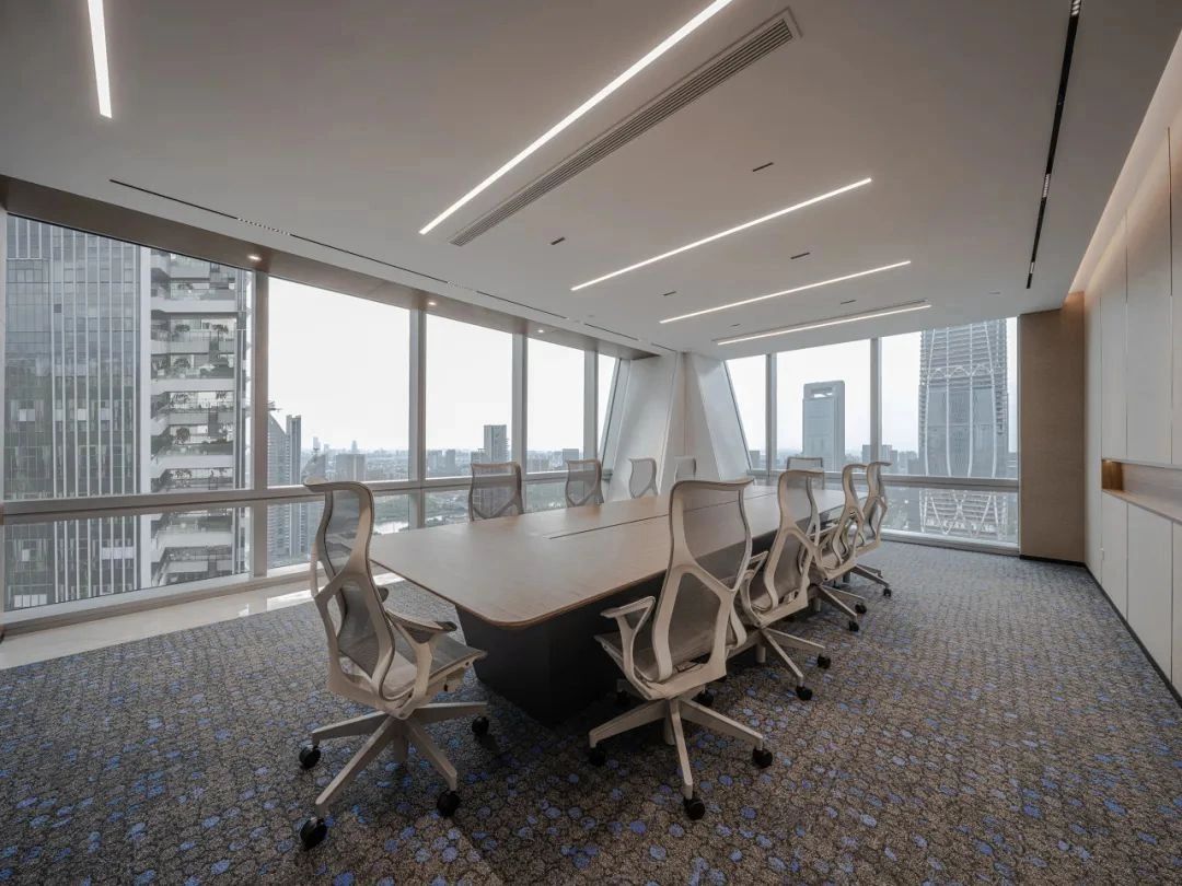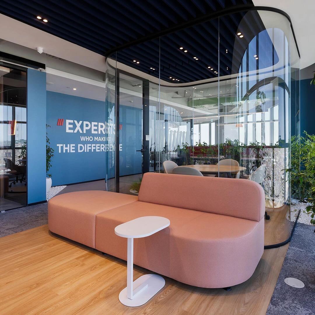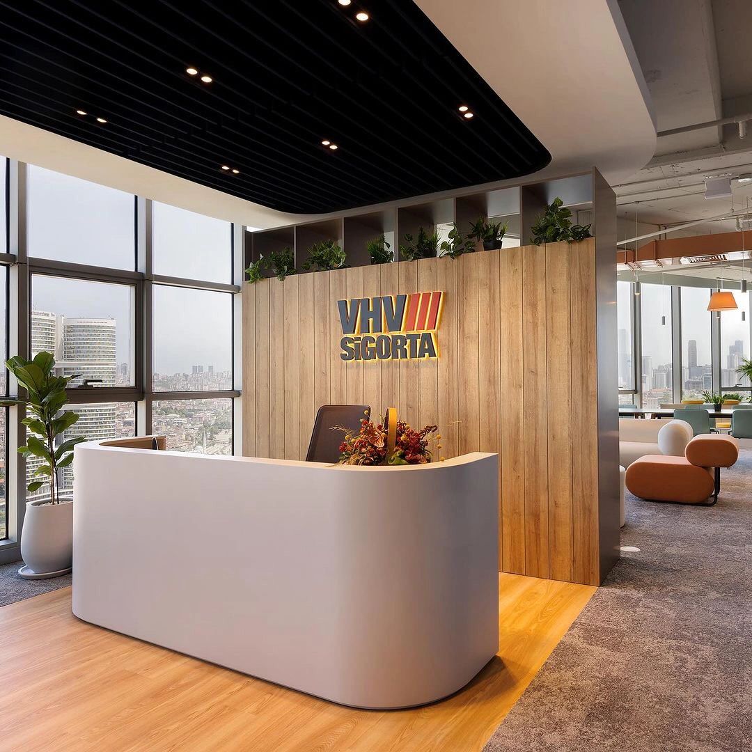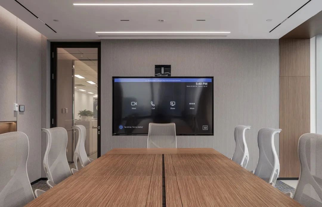 一楼前台 | 接待区以醒目的名称和灯光作为引导,人们依照自己的期待赋予专属的记忆空间,进入一个充满朝气的工作世界。开放式办公区域设计师将开放式办公区域、会议室,接待室办公元素打通集合一起,这样在整体办公的环境下,也有着高效独立的高层办公组合空间。在空间与空间之间不仅仅是利用设计媒介分割,而且利用具有空透、连通性的元素进行分隔,即空间的分割合理。