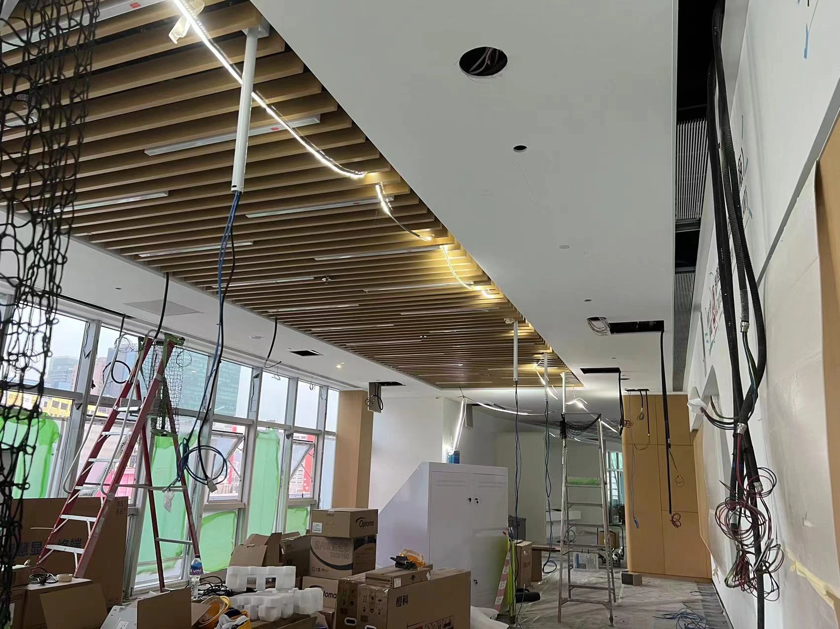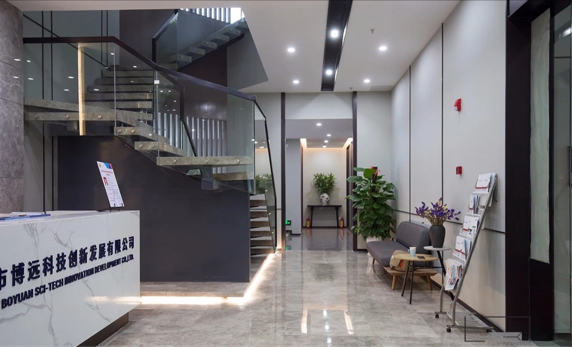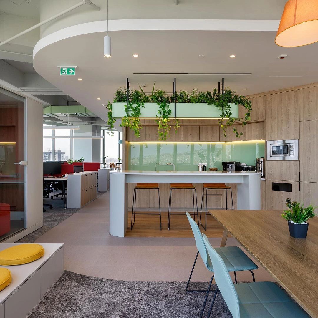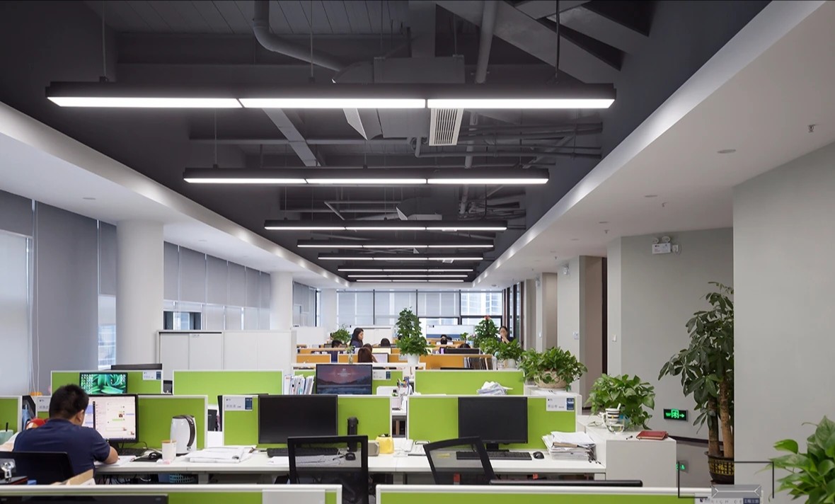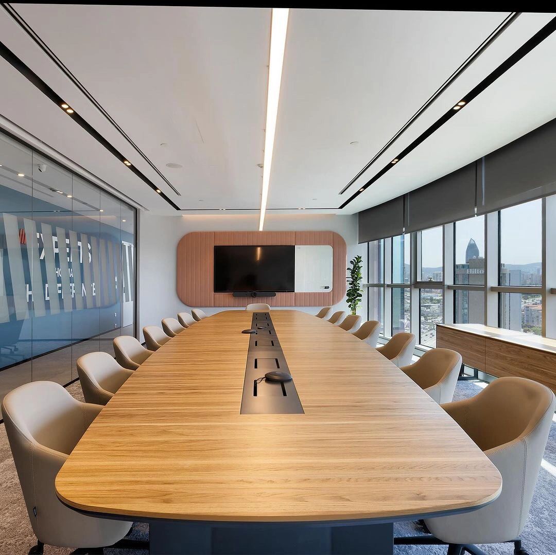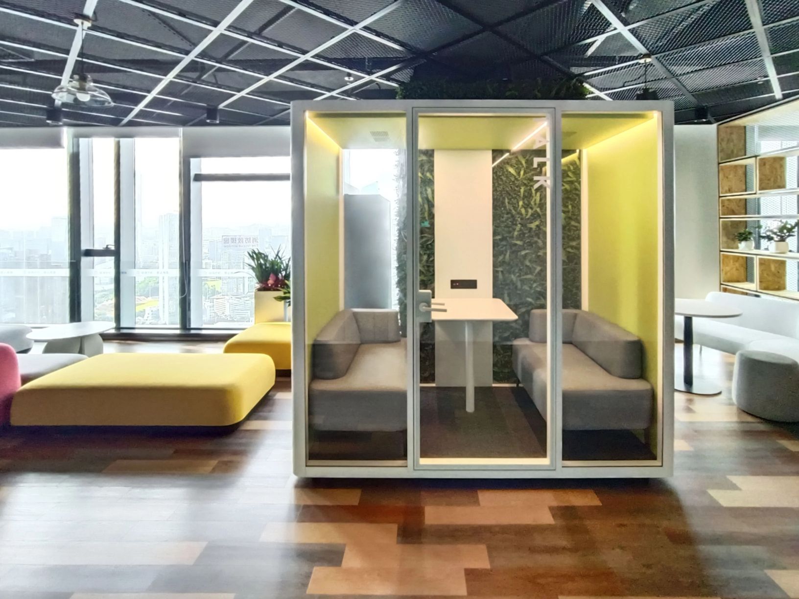 一楼前台 | 接待区以醒目的名称和灯光作为引导,人们依照自己的期待赋予专属的记忆空间,进入一个充满朝气的工作世界。开放式办公区域设计师将开放式办公区域、会议室,接待室办公元素打通集合一起,这样在整体办公的环境下,也有着高效独立的高层办公组合空间。在空间与空间之间不仅仅是利用设计媒介分割,而且利用具有空透、连通性的元素进行分隔,即空间的分割合理。
