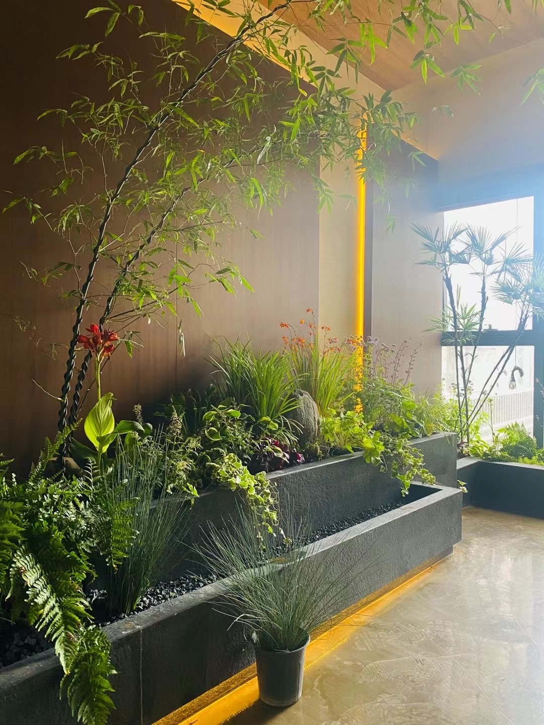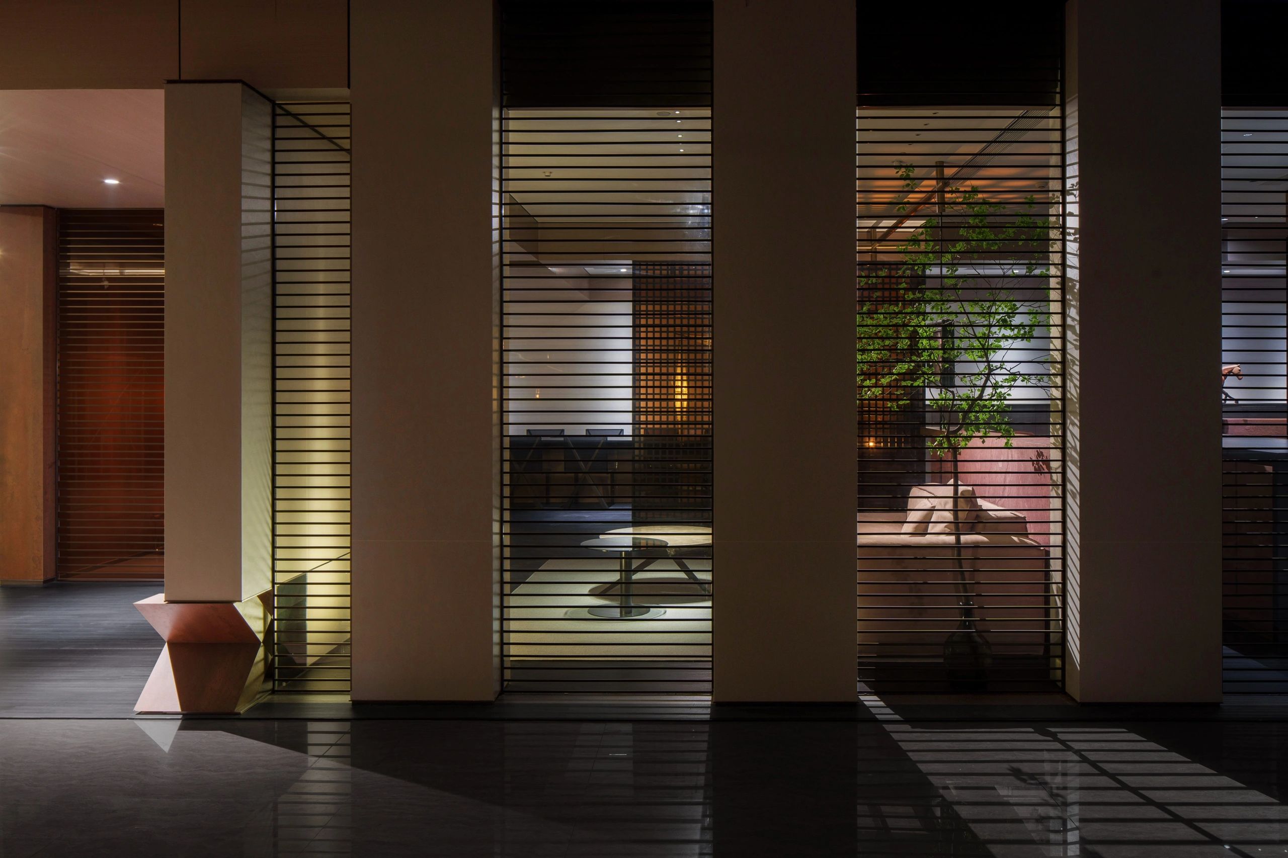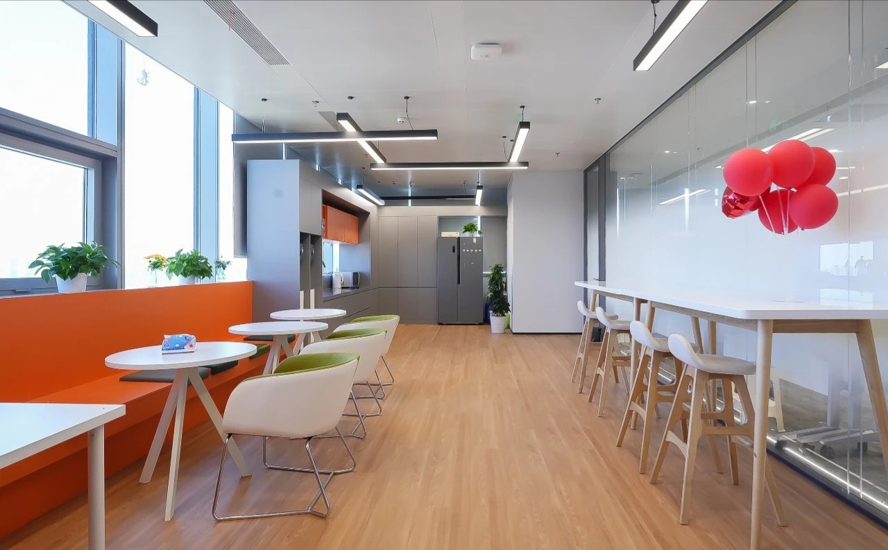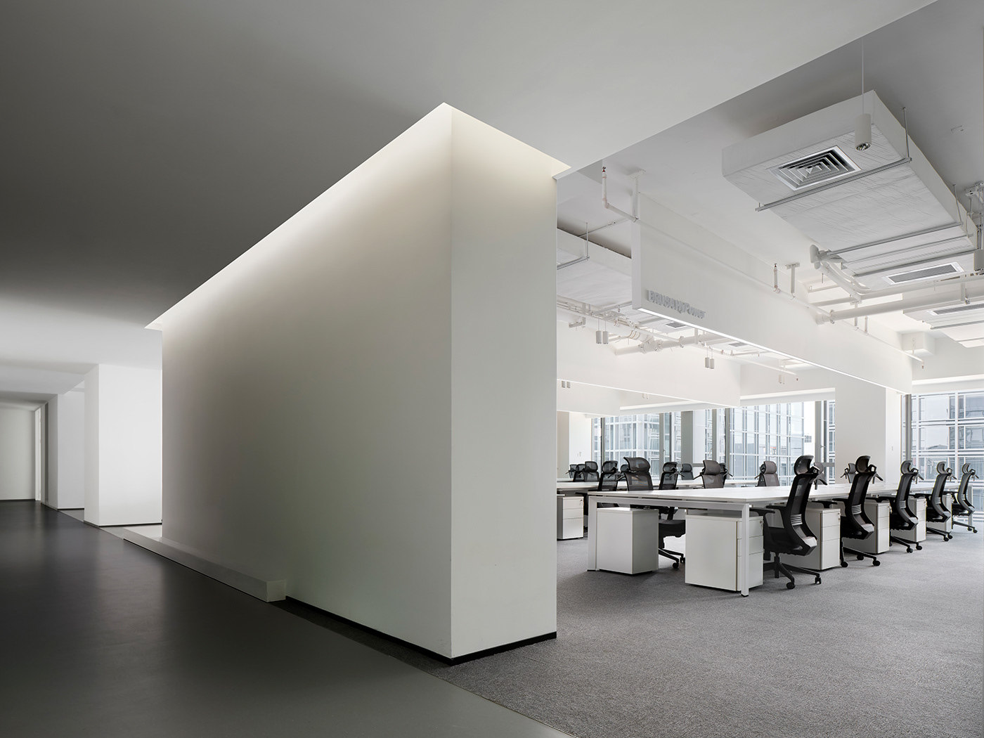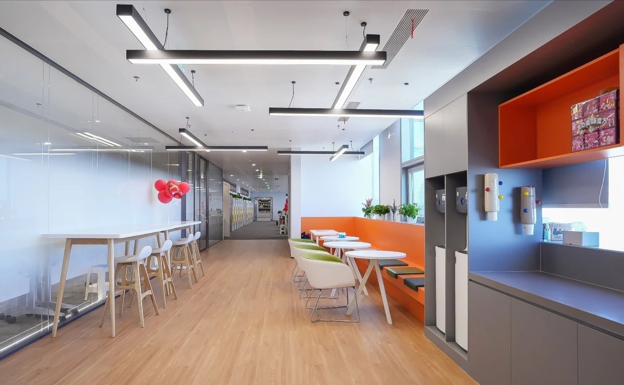 进入前厅,银灰色阳极氧化铝板打造的背景墙,流露出自然柔和的金属质感,通过设计手段将品牌文化可视化,创造出科技元素与自然融合的场景体验,延展空间的科技感与品牌的无限想象力。前厅的造景意蕴深厚,流光无声,浮沉错落,树影与灯光相对应,勾勒出雅致的诗意之美。立面删繁就简而成的轻盈感,让光影的明暗、重叠都有序可循。茶水休闲区,以最大的容纳度阅览万象,原木风包裹的返璞归真之境,传统审美法则,在潮流生活中被再造,渲染,办公群体在此转换成社交共享者。