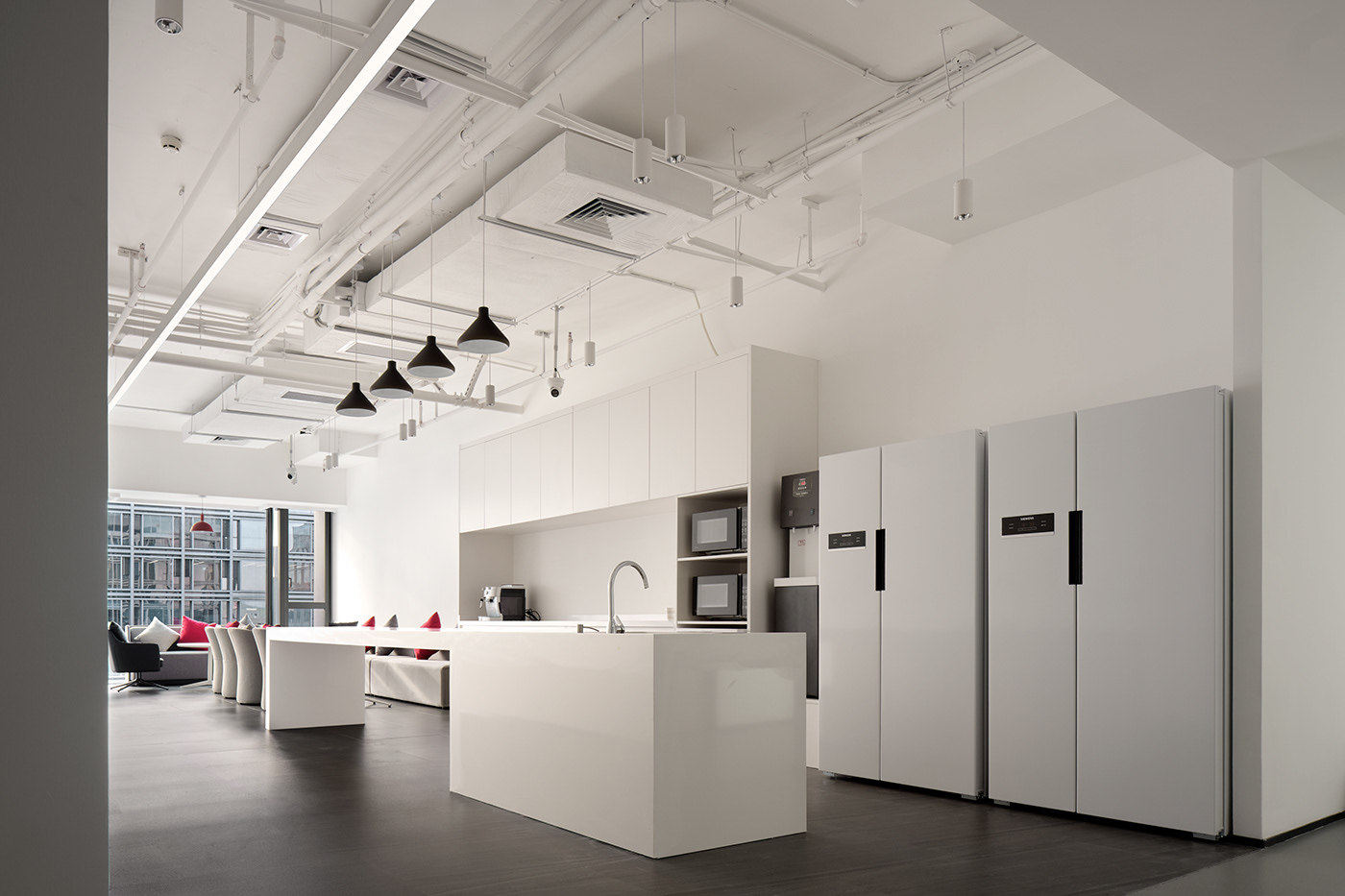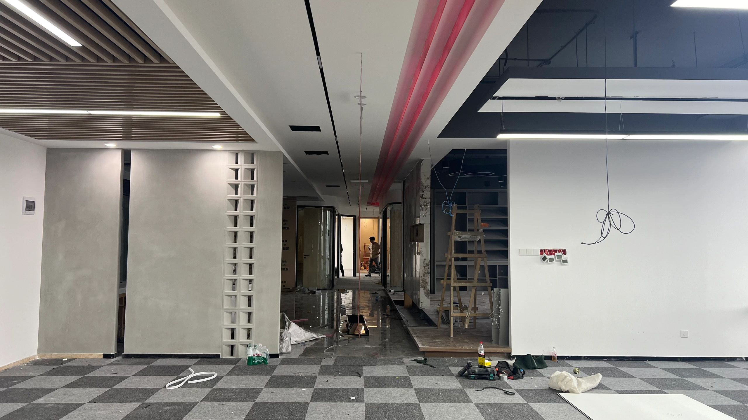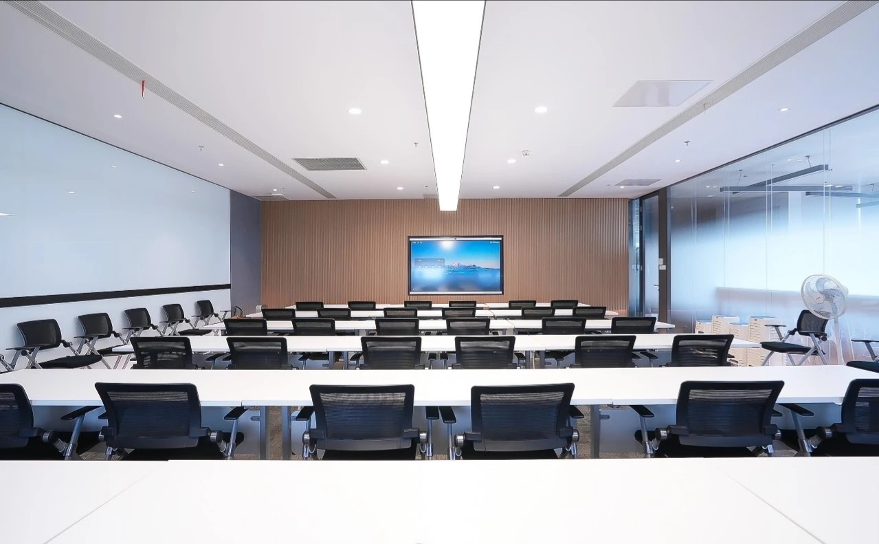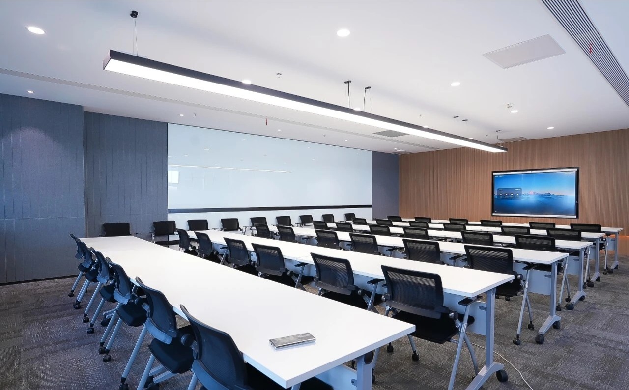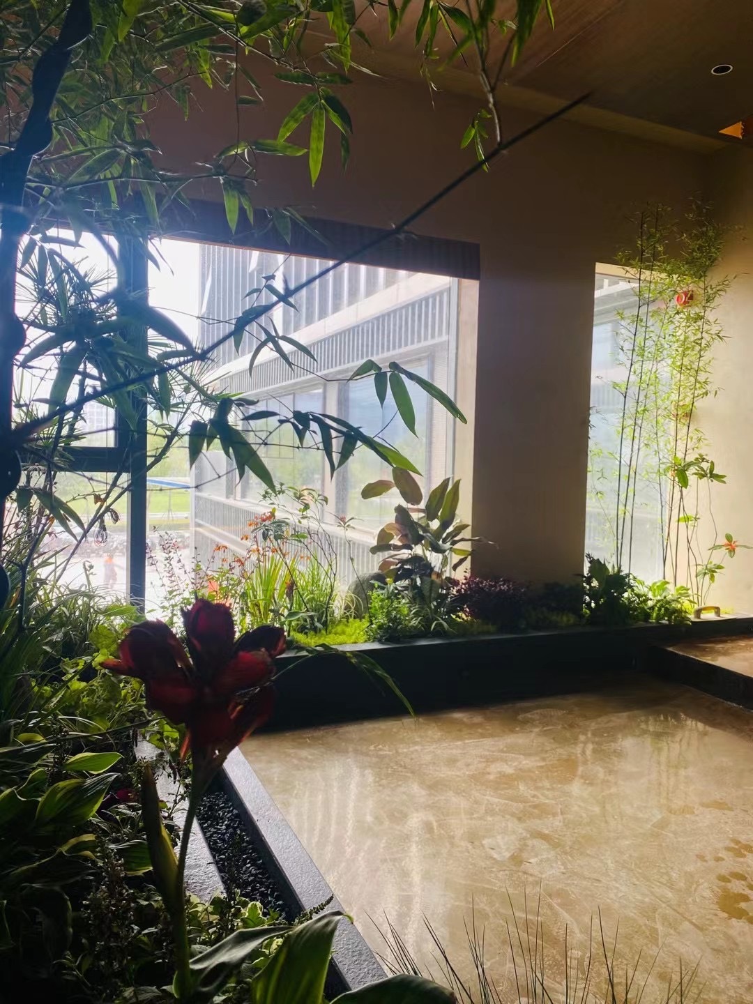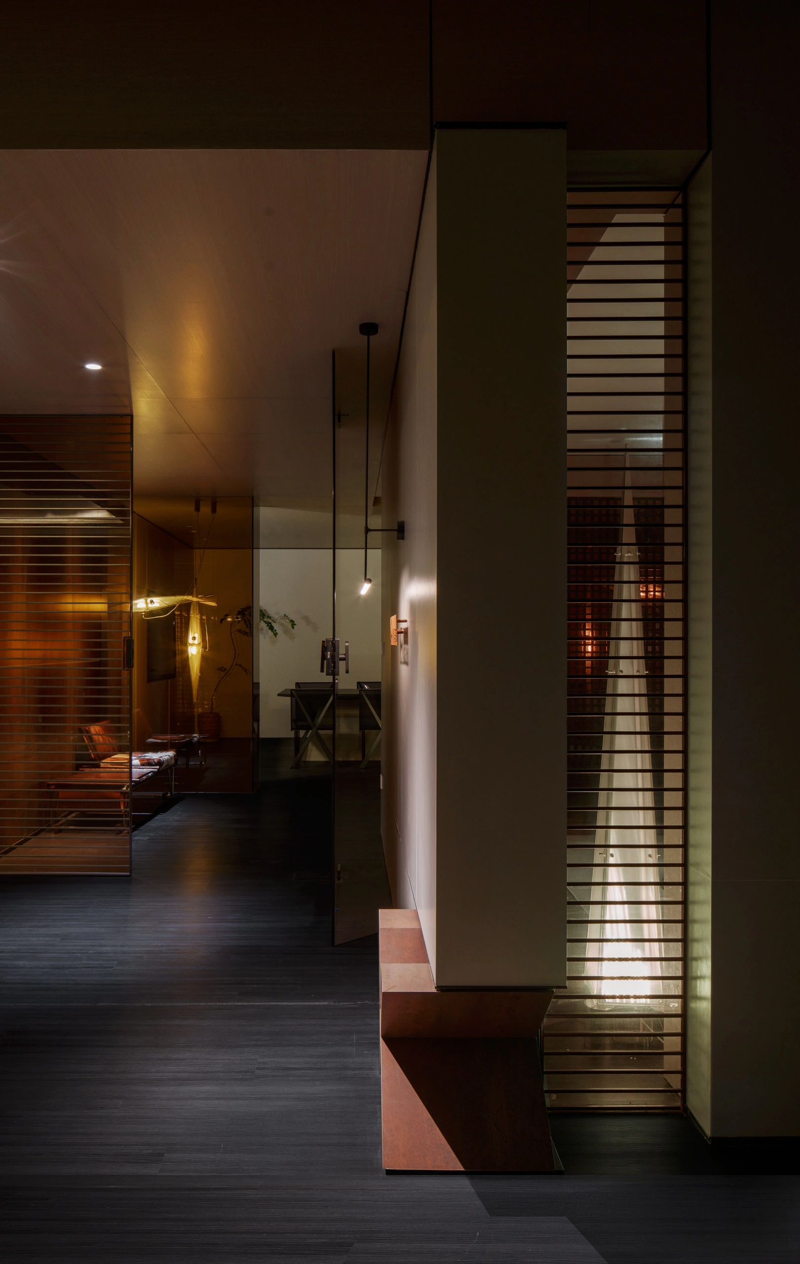 进入前厅,银灰色阳极氧化铝板打造的背景墙,流露出自然柔和的金属质感,通过设计手段将品牌文化可视化,创造出科技元素与自然融合的场景体验,延展空间的科技感与品牌的无限想象力。前厅的造景意蕴深厚,流光无声,浮沉错落,树影与灯光相对应,勾勒出雅致的诗意之美。立面删繁就简而成的轻盈感,让光影的明暗、重叠都有序可循。茶水休闲区,以最大的容纳度阅览万象,原木风包裹的返璞归真之境,传统审美法则,在潮流生活中被再造,渲染,办公群体在此转换成社交共享者。