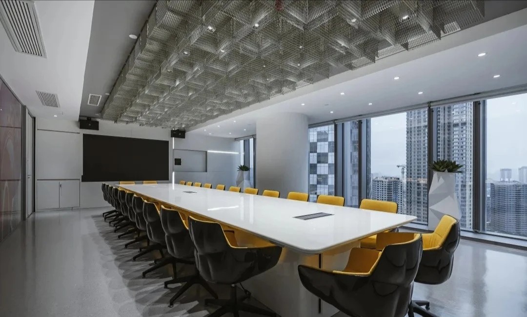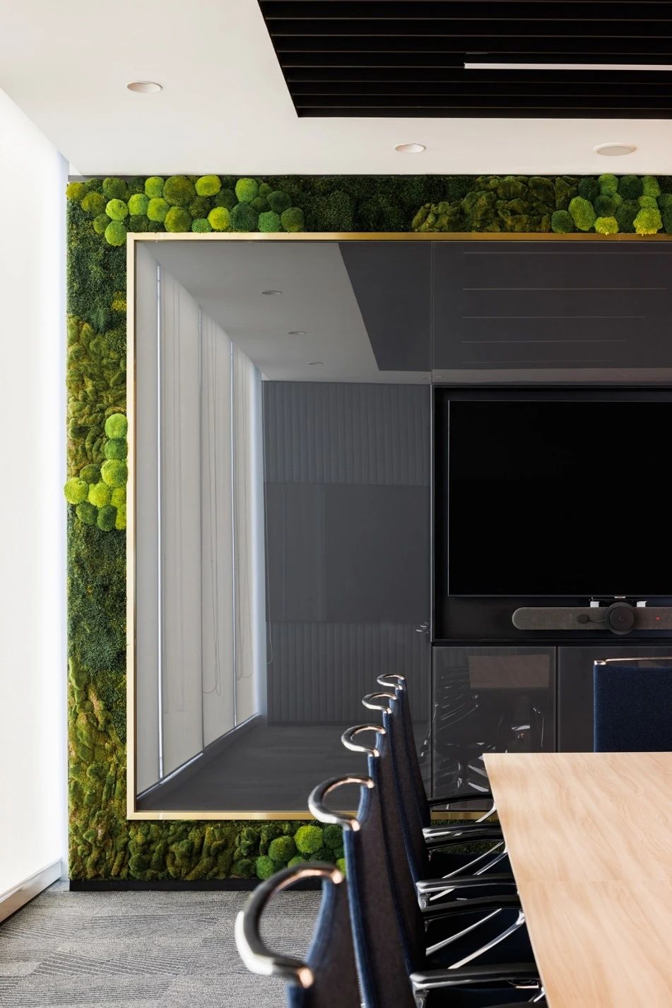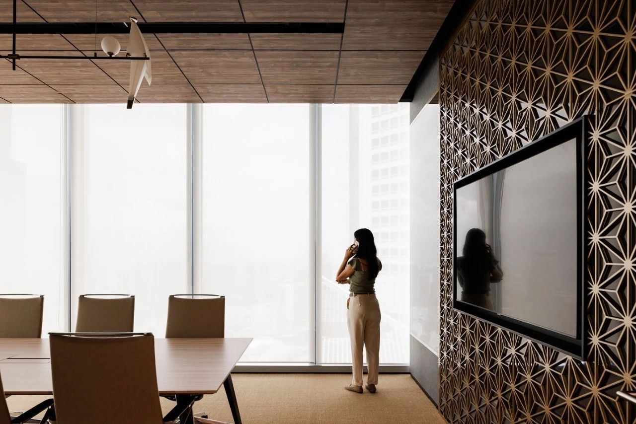 一踏进办公室,访客和员工们就会被头顶上一座令人印象深刻的建筑所吸引。这一系列同心圆的设计灵感来源于水波纹,并不断向外扩展,寓意公司业务范围更广,可持续发展能力更强。天花板的轮廓也反映在空间地板的选择上,巧妙地标出了礼宾区。为了使外观更加完美,在一面宽大的苔藓墙边,还设置了一个圆形的门房,上面铺设了固体表面,就像一块稳固的岩石,在绿树丛中矗立着。门房旁边的等候区雕刻着水景。流水声与全高窗边的植物相映成趣,为整个空间增添了几分禅意。员工和访客经过到达区时,会看到一系列供客人使用的会议室。所有会议室都配备了视频会议设施,可远程连接参加讨论的各方。为了展现亲自然元素,这间会议室的墙壁采用了苔藓框架,用来放置显示屏。其余房间的墙壁均采用凹槽吸音板,为空间增添了优雅和质感。