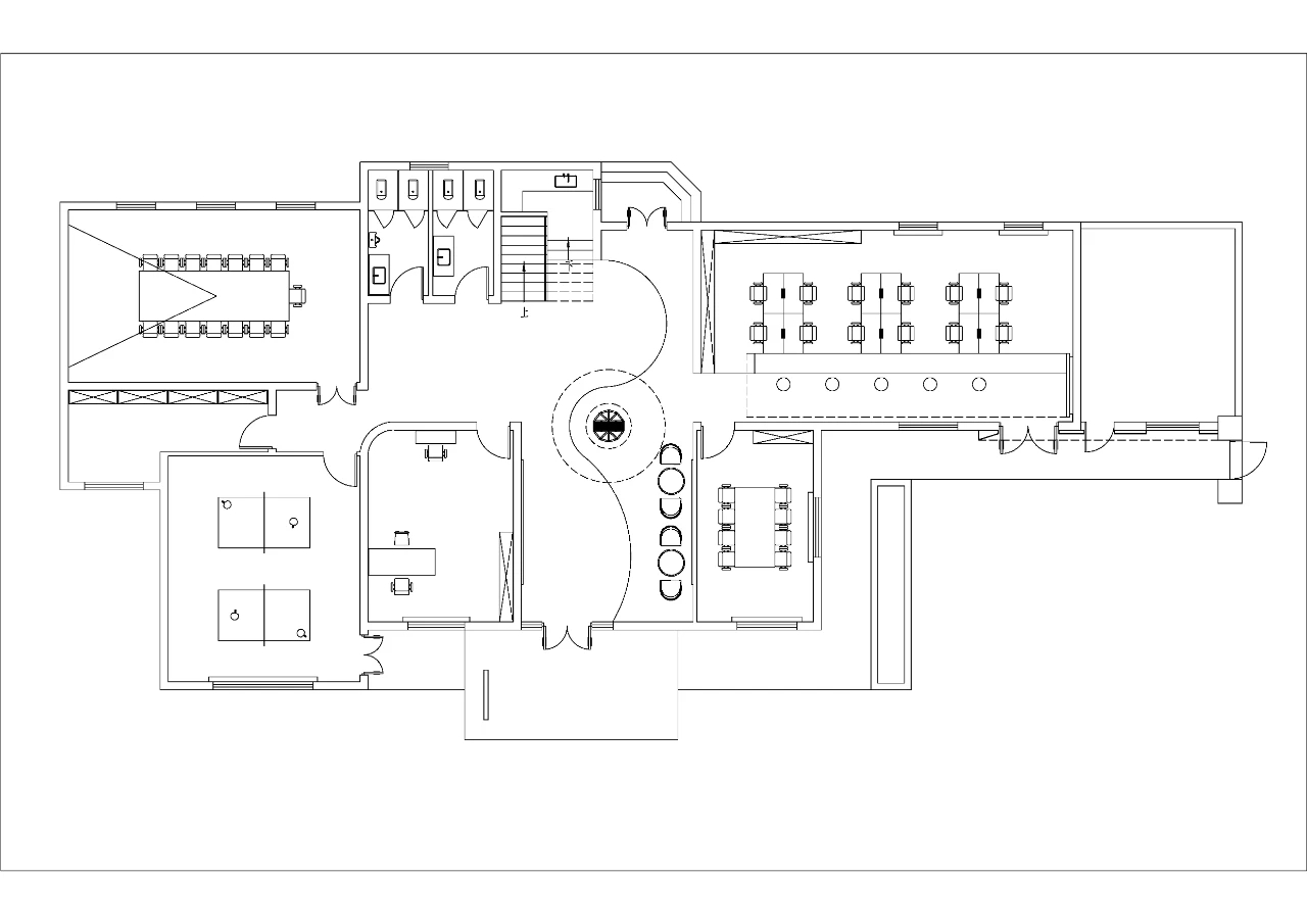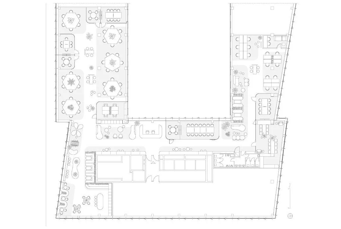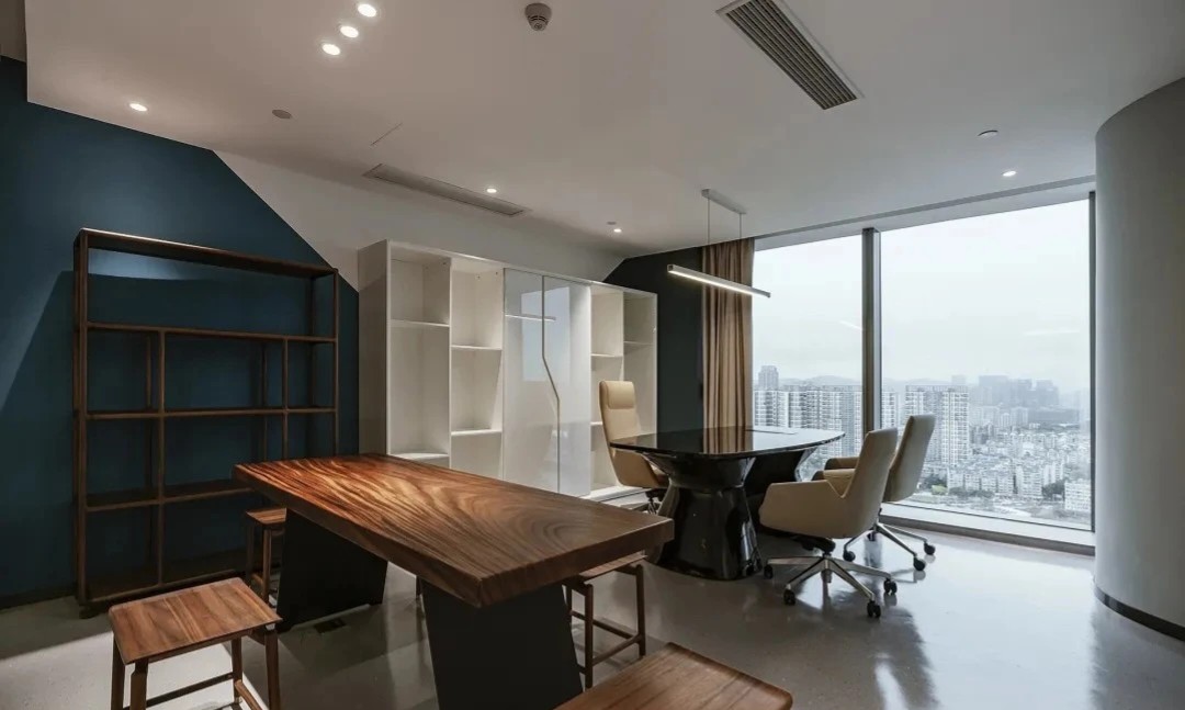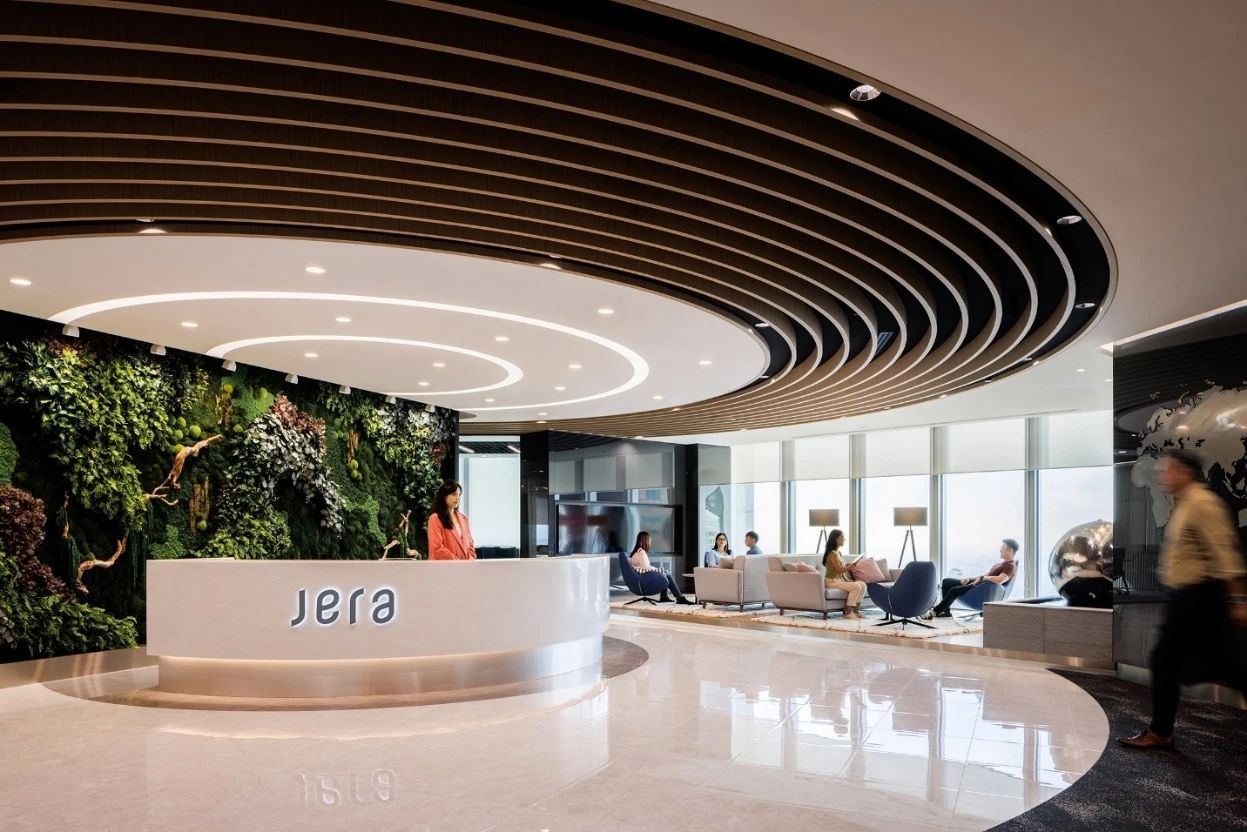 一踏进办公室,访客和员工们就会被头顶上一座令人印象深刻的建筑所吸引。这一系列同心圆的设计灵感来源于水波纹,并不断向外扩展,寓意公司业务范围更广,可持续发展能力更强。天花板的轮廓也反映在空间地板的选择上,巧妙地标出了礼宾区。为了使外观更加完美,在一面宽大的苔藓墙边,还设置了一个圆形的门房,上面铺设了固体表面,就像一块稳固的岩石,在绿树丛中矗立着。门房旁边的等候区雕刻着水景。流水声与全高窗边的植物相映成趣,为整个空间增添了几分禅意。员工和访客经过到达区时,会看到一系列供客人使用的会议室。所有会议室都配备了视频会议设施,可远程连接参加讨论的各方。为了展现亲自然元素,这间会议室的墙壁采用了苔藓框架,用来放置显示屏。其余房间的墙壁均采用凹槽吸音板,为空间增添了优雅和质感。
