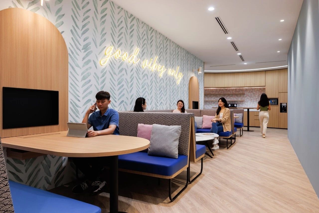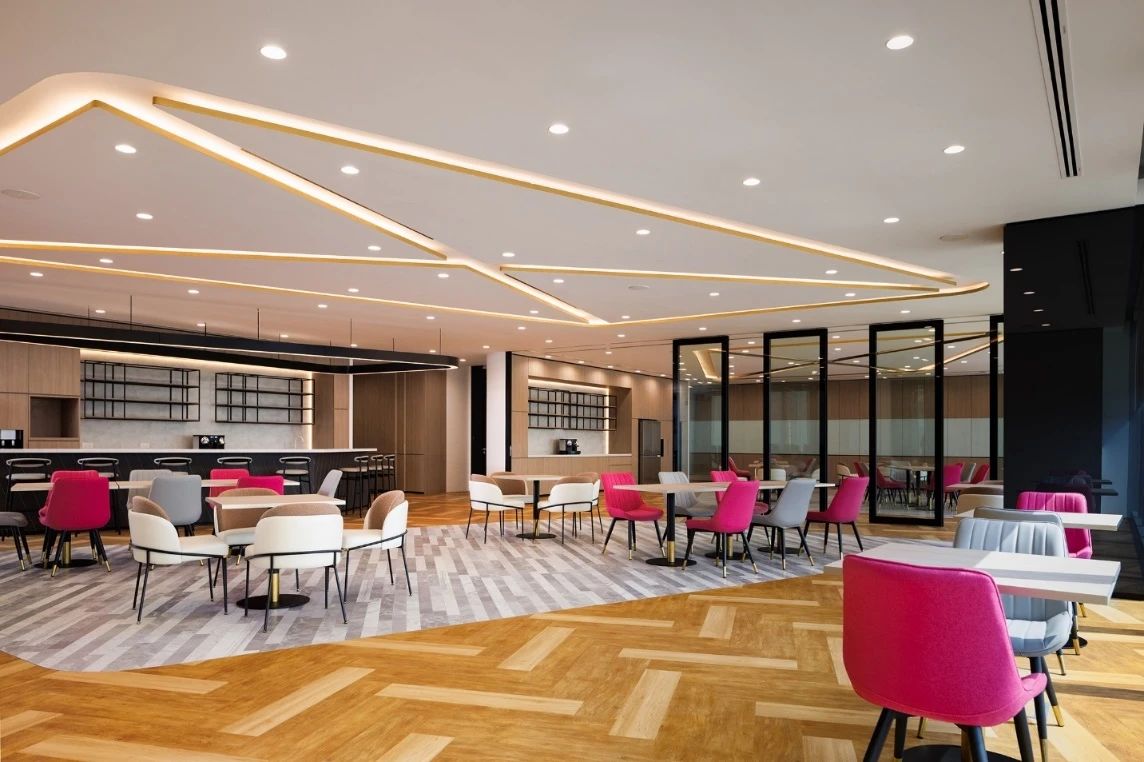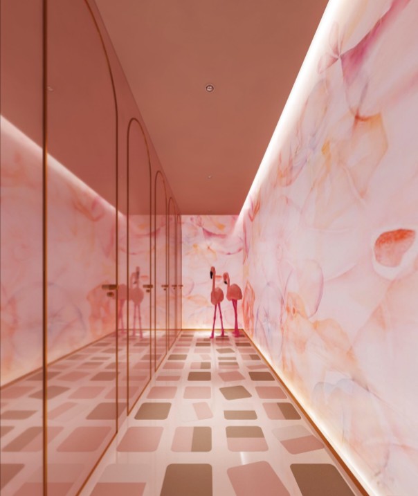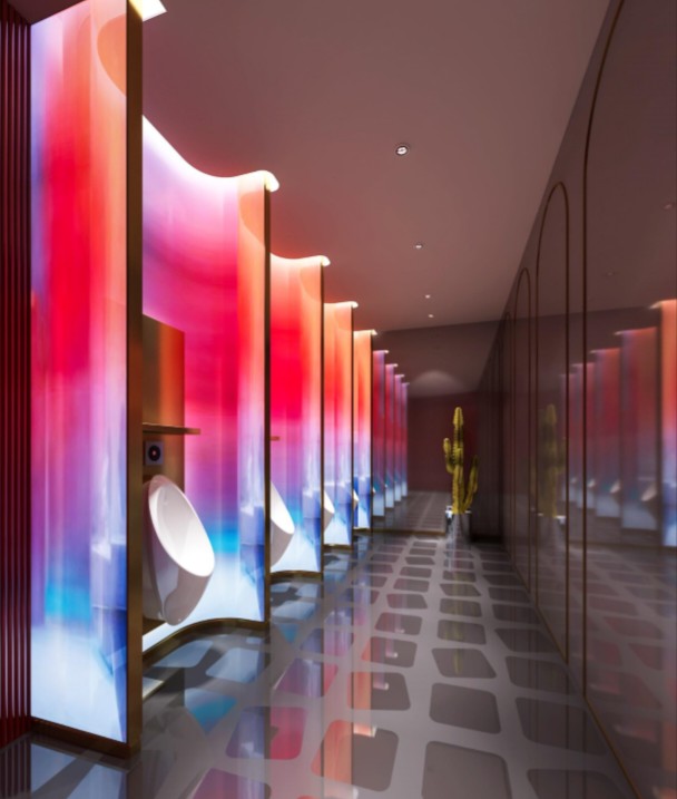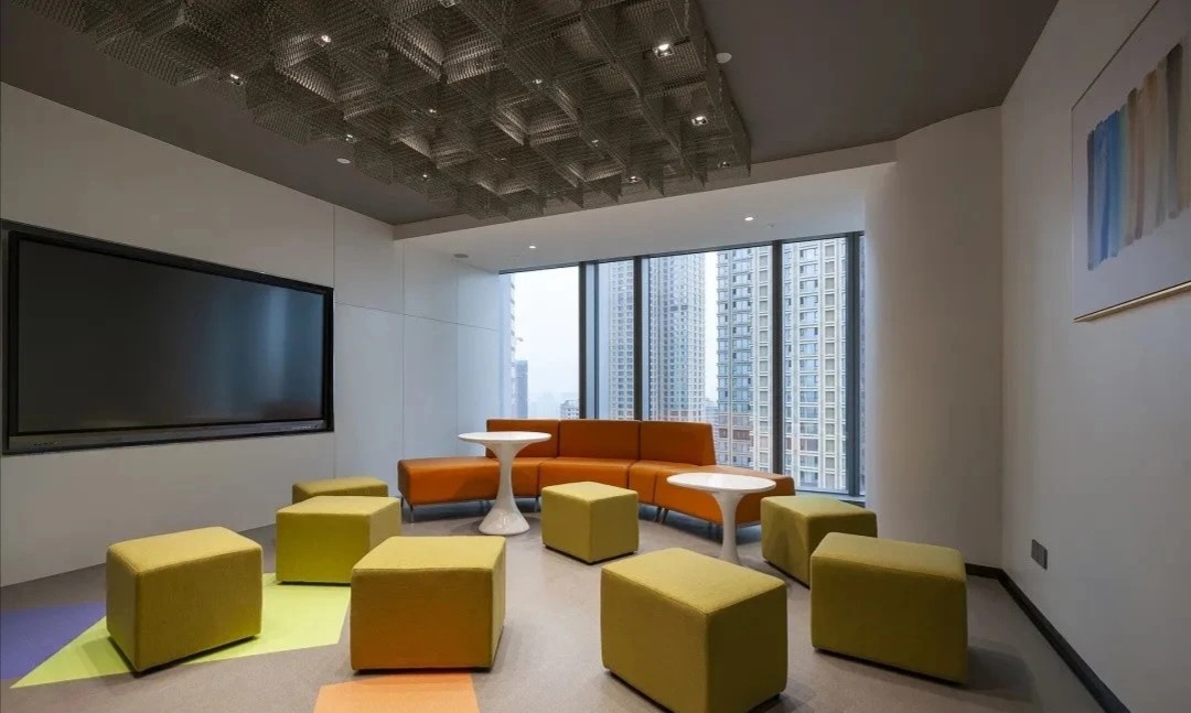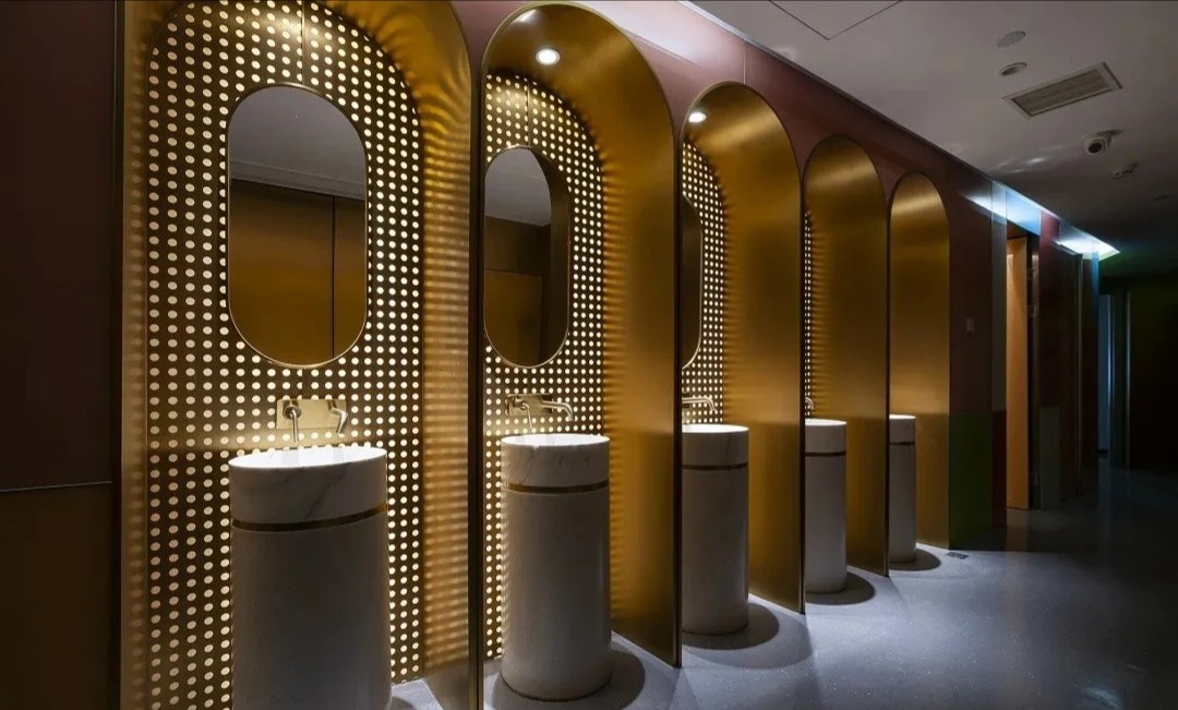 由於公司85%以上的員工都是女性,所以我們在休閑區特地做了 一個黃色的瑜伽球,球體的內部是 一個專門為女性員工設計的更衣化妝的解壓空間。位於核心筒另外 一邊的公共洗手間,原來建築設計馬桶的位置特別少,洗手臺分別在兩個衛生間的裏面,設計師把洗手臺做到外面公共的區域,內部的馬桶位增加了70%。洗手臺獨立形成了 一個圍合的小空間,墻面用企業色做了 一些數碼噴印玻璃,再用金屬分塊,讓這個封閉的小空間跳躍起來。 設計師在男女衛生間分別做了不同色彩的區分,希望能用設計改變人對舊有空間環境的認知,增加特殊空間的體驗感,從而改變人的行為。