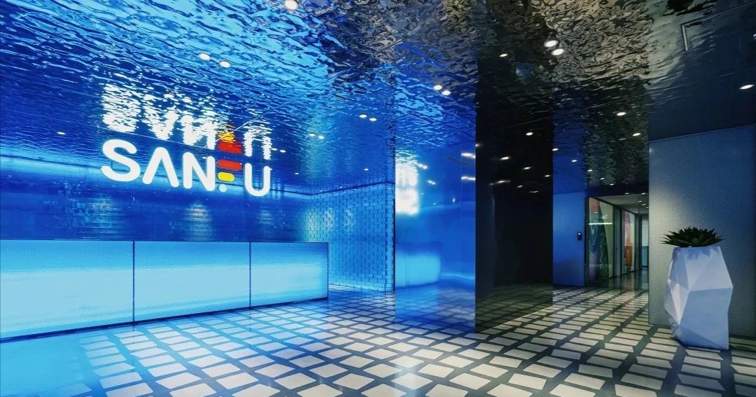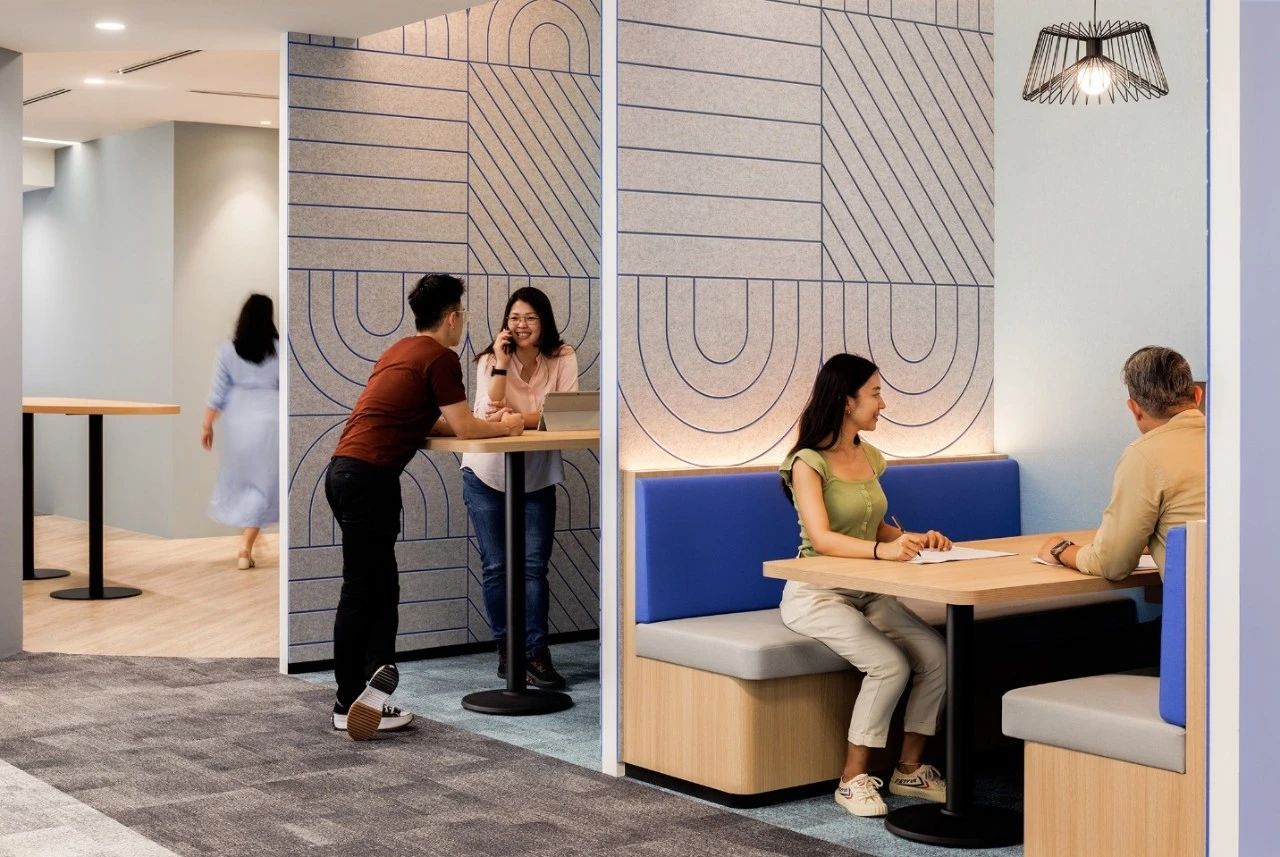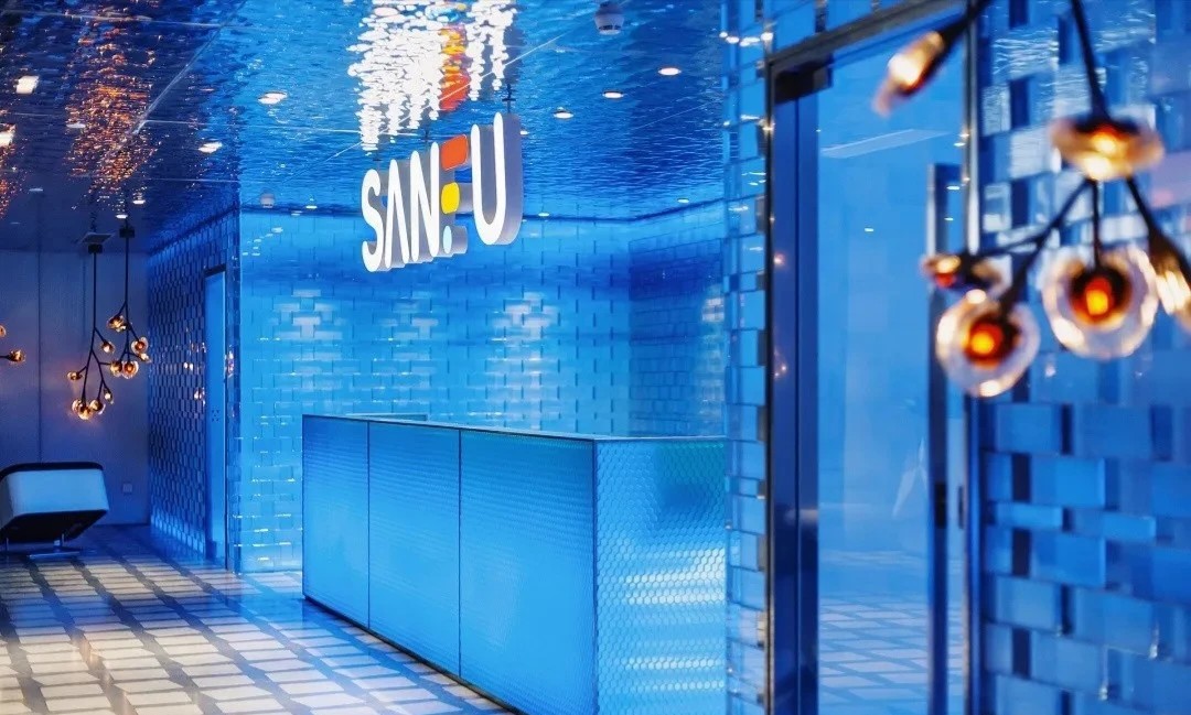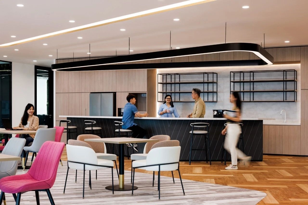 由於公司85%以上的員工都是女性,所以我們在休閑區特地做了 一個黃色的瑜伽球,球體的內部是 一個專門為女性員工設計的更衣化妝的解壓空間。位於核心筒另外 一邊的公共洗手間,原來建築設計馬桶的位置特別少,洗手臺分別在兩個衛生間的裏面,設計師把洗手臺做到外面公共的區域,內部的馬桶位增加了70%。洗手臺獨立形成了 一個圍合的小空間,墻面用企業色做了 一些數碼噴印玻璃,再用金屬分塊,讓這個封閉的小空間跳躍起來。 設計師在男女衛生間分別做了不同色彩的區分,希望能用設計改變人對舊有空間環境的認知,增加特殊空間的體驗感,從而改變人的行為。