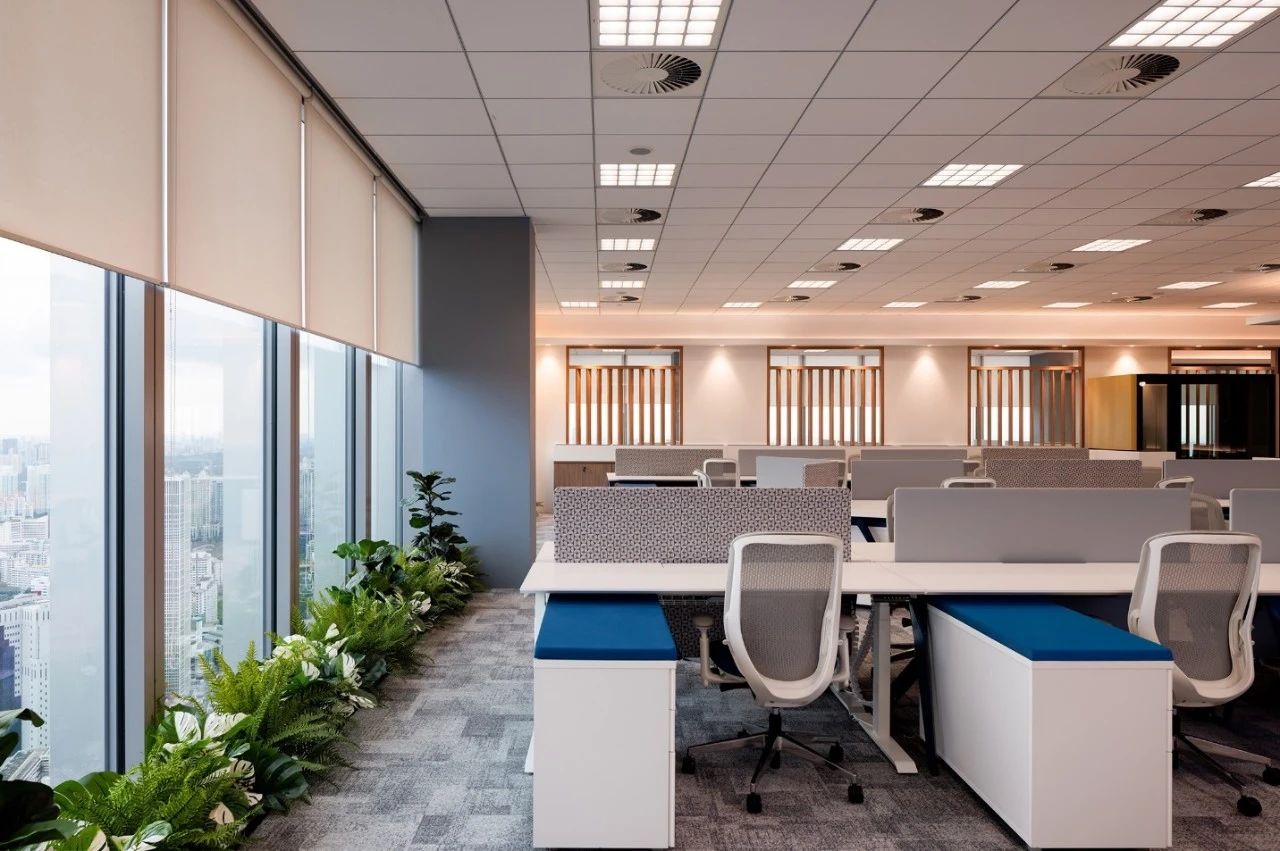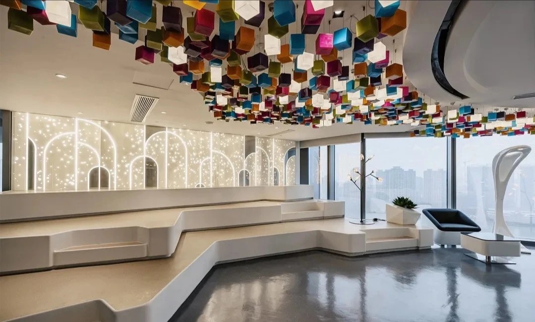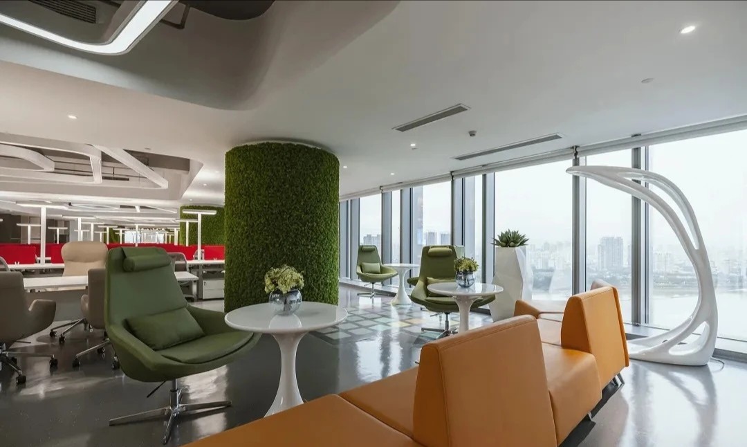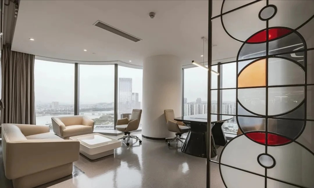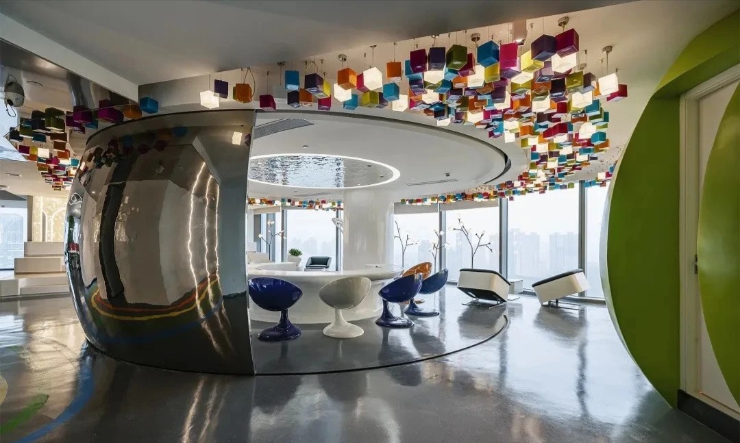 項目空間中運用了企業logo的九宮格幾何形狀及色彩元素,詮釋了讓年輕人輕松享受時尚生活的企業理念。穿過大廳兩側的電動門,核心筒公共過道形成 一個閉合的環形跑道,跑道兩側墻面的多媒體互動裝置和透明LED玻璃,展現的是企業的歷程以及未來的規劃,形成 一個“微距”的企業文化展廳。公共辦公區和獨立辦公室,沒有大面積的復雜造型,只是在色彩和幾何元素上沿用了企業的logo形象。每個桌面都設計了獨立的桌屏燈,讓每個員工工作時的燈光感受都達到最佳。大面積的綠植墻以及30層靠窗的江景,都體現了公司對員工工作環境人性化的關懷。
