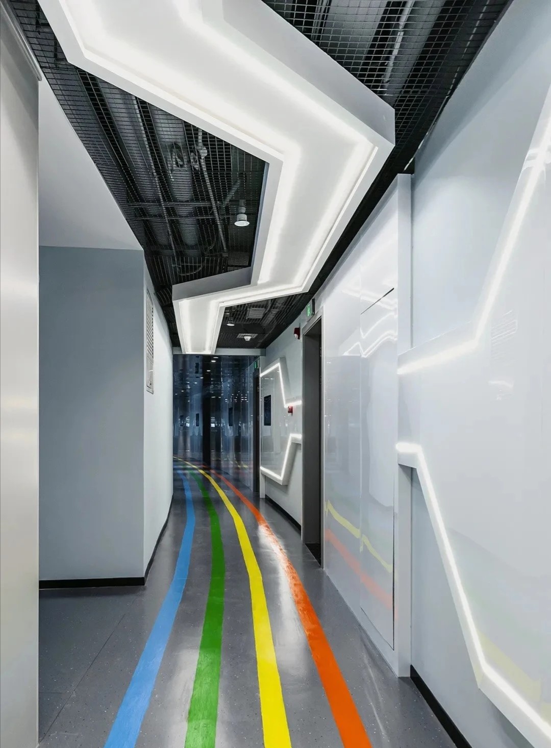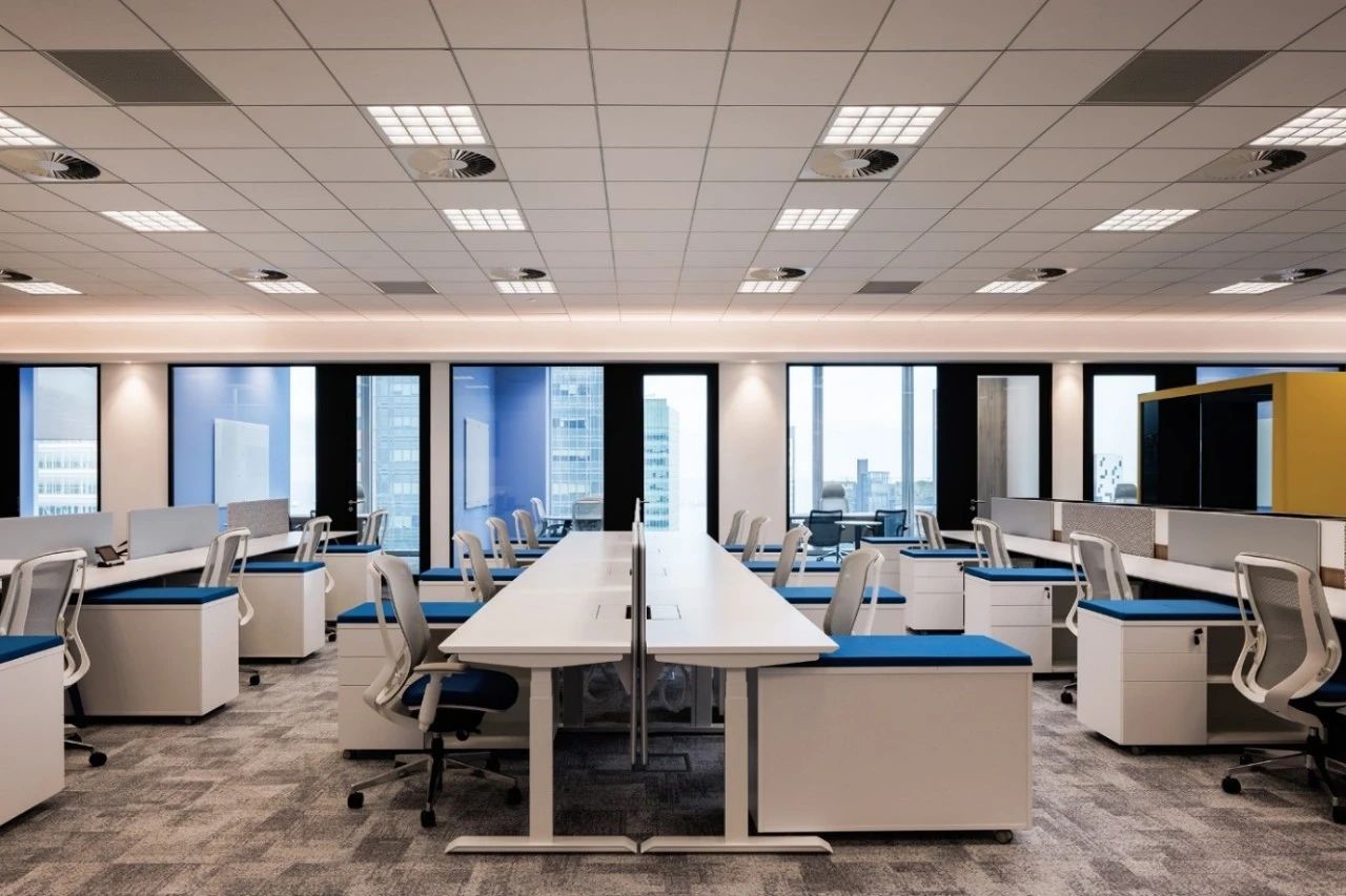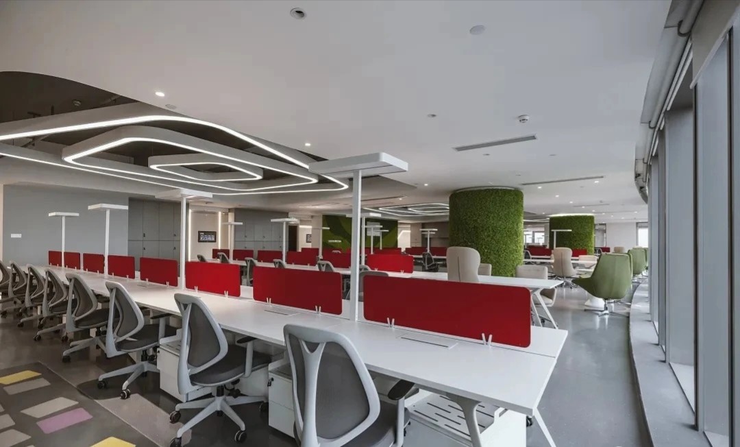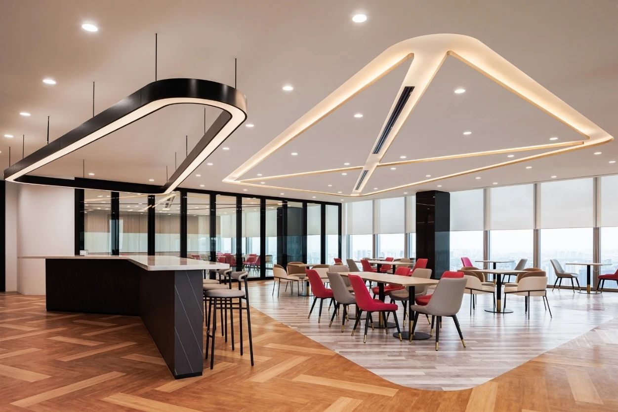 項目空間中運用了企業logo的九宮格幾何形狀及色彩元素,詮釋了讓年輕人輕松享受時尚生活的企業理念。穿過大廳兩側的電動門,核心筒公共過道形成 一個閉合的環形跑道,跑道兩側墻面的多媒體互動裝置和透明LED玻璃,展現的是企業的歷程以及未來的規劃,形成 一個“微距”的企業文化展廳。公共辦公區和獨立辦公室,沒有大面積的復雜造型,只是在色彩和幾何元素上沿用了企業的logo形象。每個桌面都設計了獨立的桌屏燈,讓每個員工工作時的燈光感受都達到最佳。大面積的綠植墻以及30層靠窗的江景,都體現了公司對員工工作環境人性化的關懷。