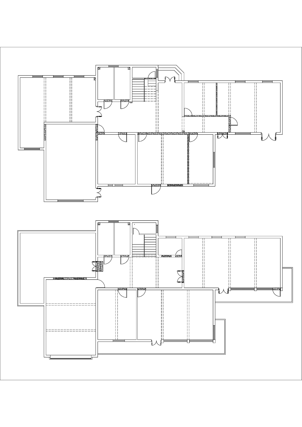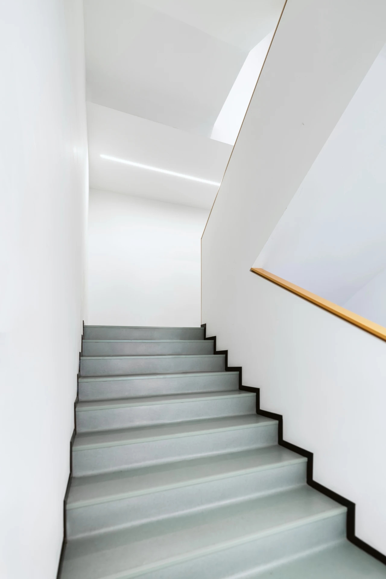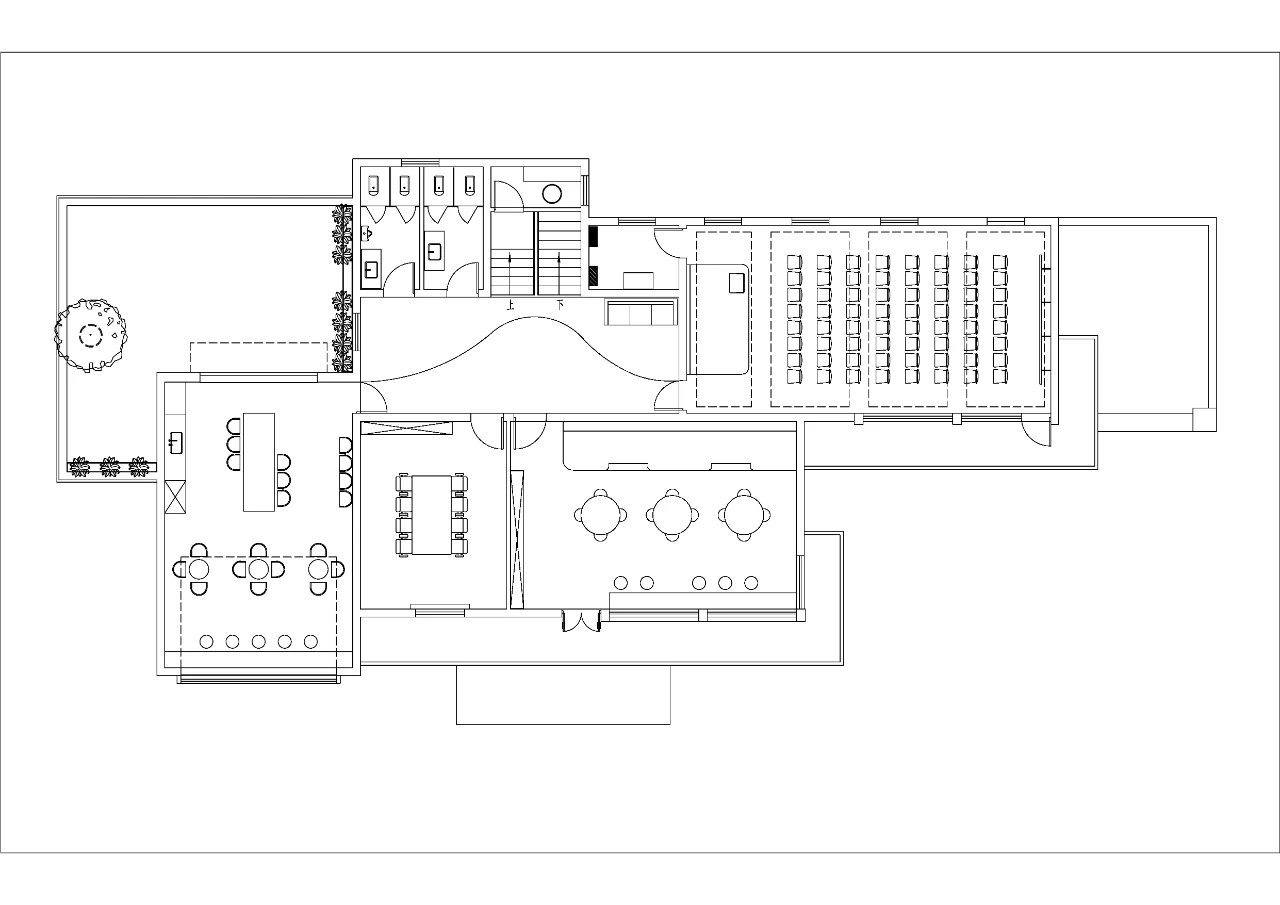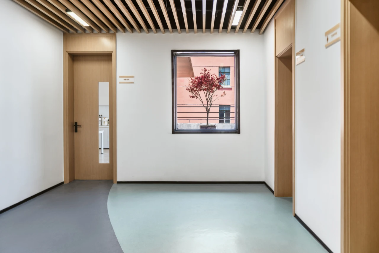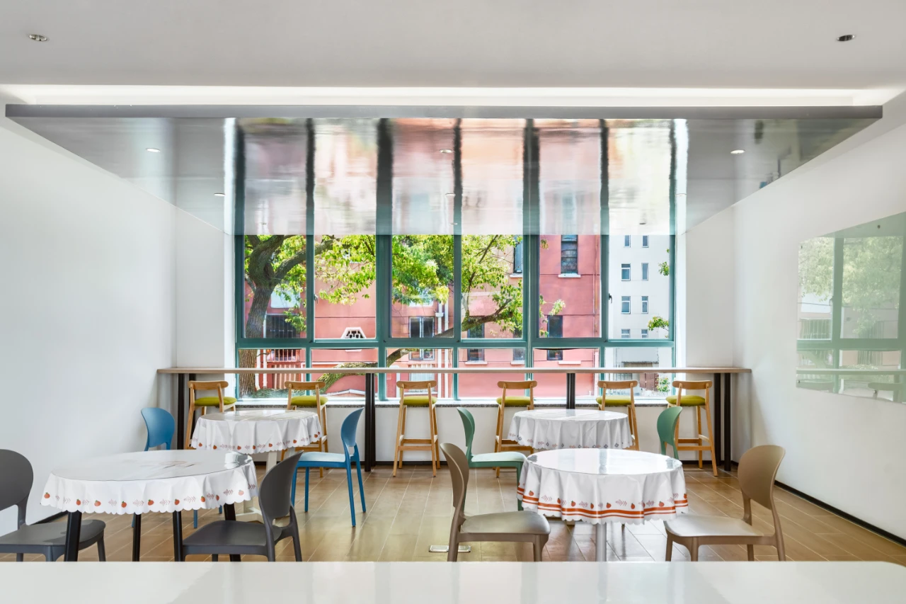 原建筑具有鲜明的砖红色外观,在保留外观现状的设计前提下,如何让新的室内空间与建筑整体呈现和谐交融的关系?以下图展示的一站式服务中心为例,利用木色圆角折板造型限定出居民主要活动空间,内部则是办公空间。这样就在整体的色调与观感上延续了建筑外观的暖色调。以活动中心空间为例,在功能设定上,体现了“和”的概念,不同年龄、背景的社区人群在同一个空间内共同参与活动,和谐共处。在空间设计层面,活动中心南北打通,北侧的通透折叠玻璃门将露台空间引入室内,南侧保留大面积开窗,同时通过设置在顶部有一定倾角的高亮金属吊顶,将室外的一片绿意引入室内,获得人与自然的和谐共融。亲子活动空间同样体现这种和谐的氛围,靠窗的吧台、空间中间的圆桌、靠墙的地台,三种不同的家具形态塑造不同的活动方式。楼梯作为两层之间的联系,也是我们重点刻画的细节。设计采用实体楼梯栏板的形式,上下融合连通为一体,表面用木饰面覆盖,便于使用者手扶,在结构和视觉上的整体性都很强。
