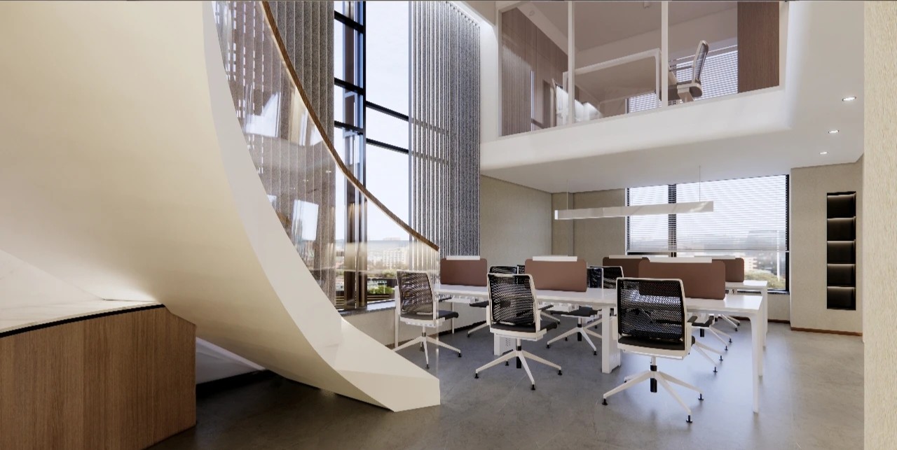 公共办公区的空间以原色调为主,让整个办公室设计看起来更为沉稳低调,营造出一种安静沉淀的氛围。趣味性的吧台、旋转楼梯,部门经理办公室的推拉门,享受与众不同的办公方式。