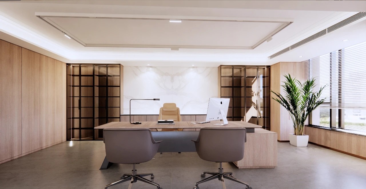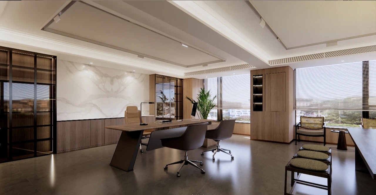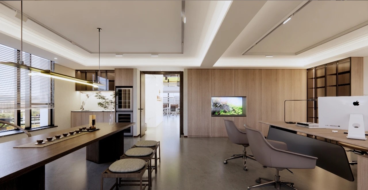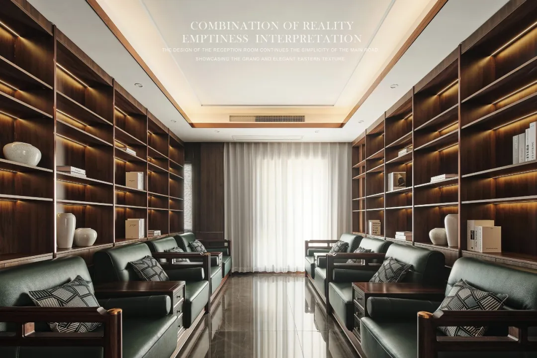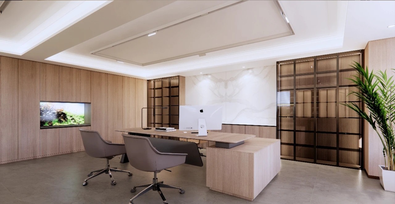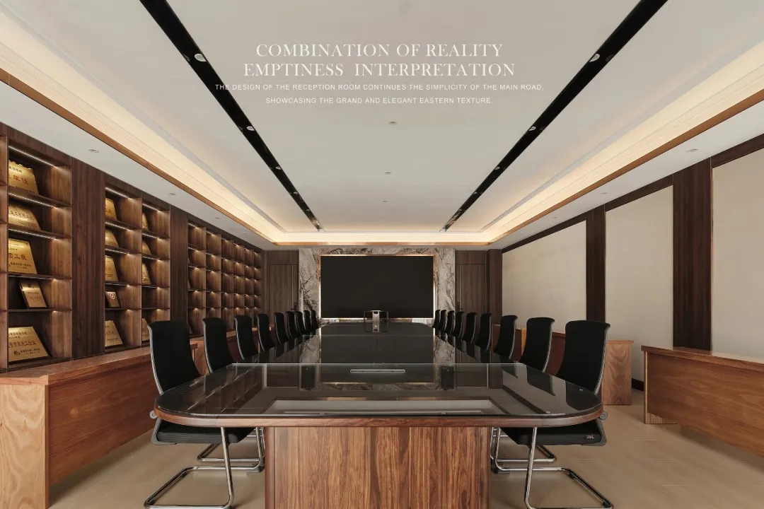 墙面花瓣源于甲方LOGO中的紫荆花瓣,设计师将其重组扩散,在墙面上形成天女散花的感觉,为空间提升活力,并强调公司形象。与之对应的另一侧为公司历程宣传墙,墙面内退可以将视线拓展,过道的压抑感会因此降低。在总经理办公室向外俯瞰浐河风景净收眼底,删繁就简,以最经典的木色为主题搭配色调,没有繁琐的设计和过多的装饰,减去办公中的压抑感。通过将自然纯净的白色与沉静木色相结合,将品牌形象简洁地呈现表达,同时为左右空间的过渡创建和谐观感。通过设计大面积的收纳空间缓解办公中大量的储物需求。