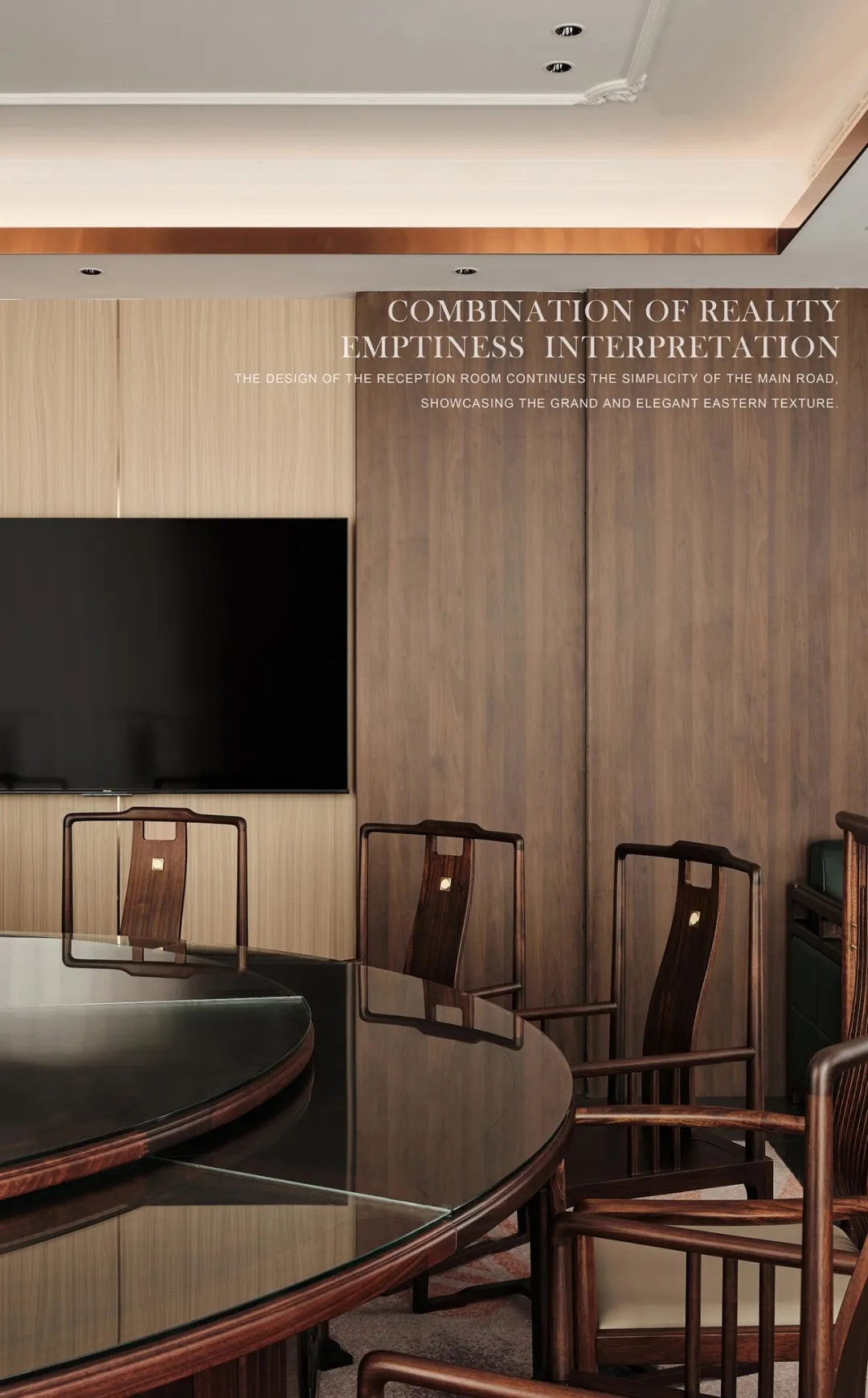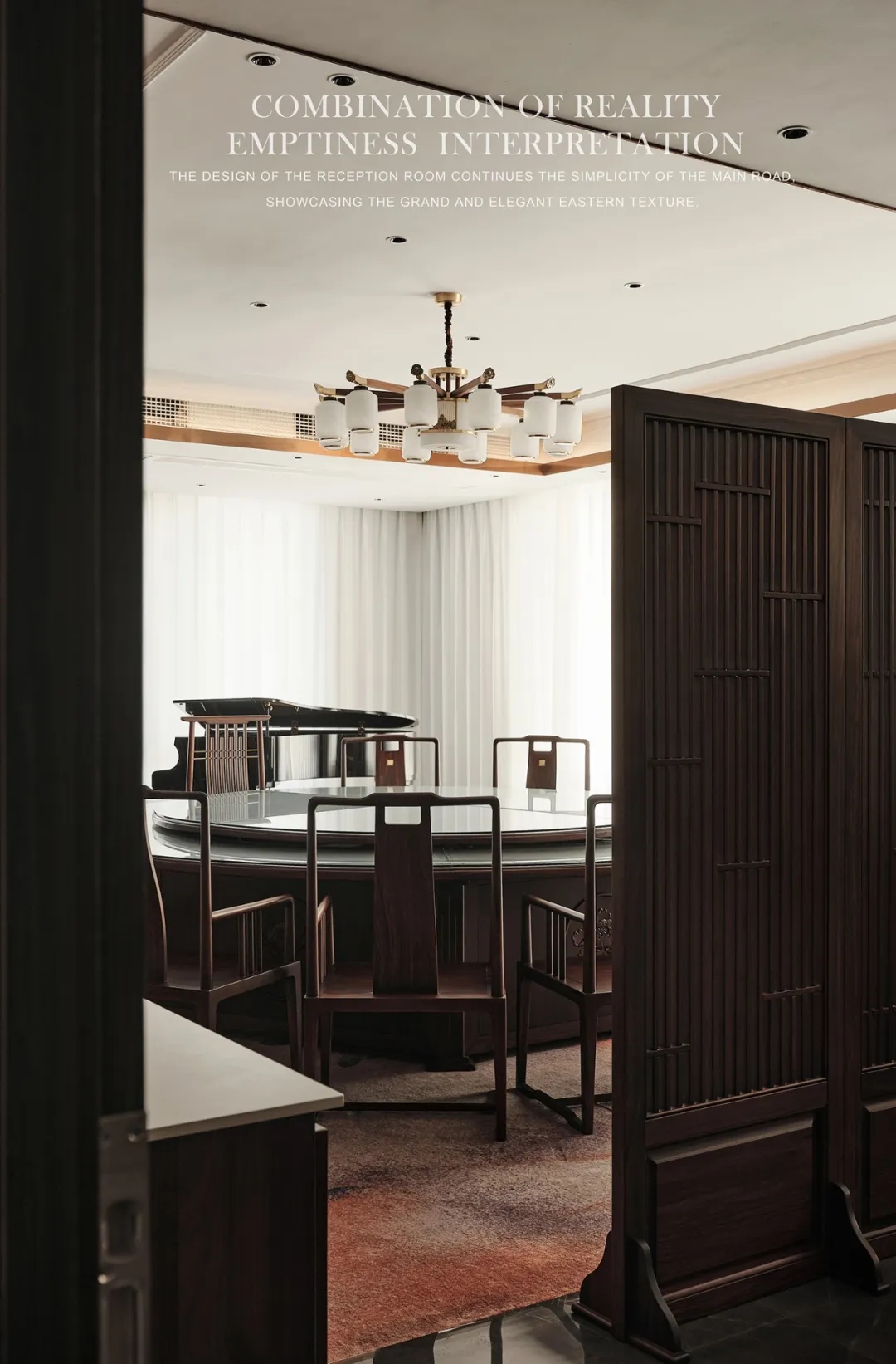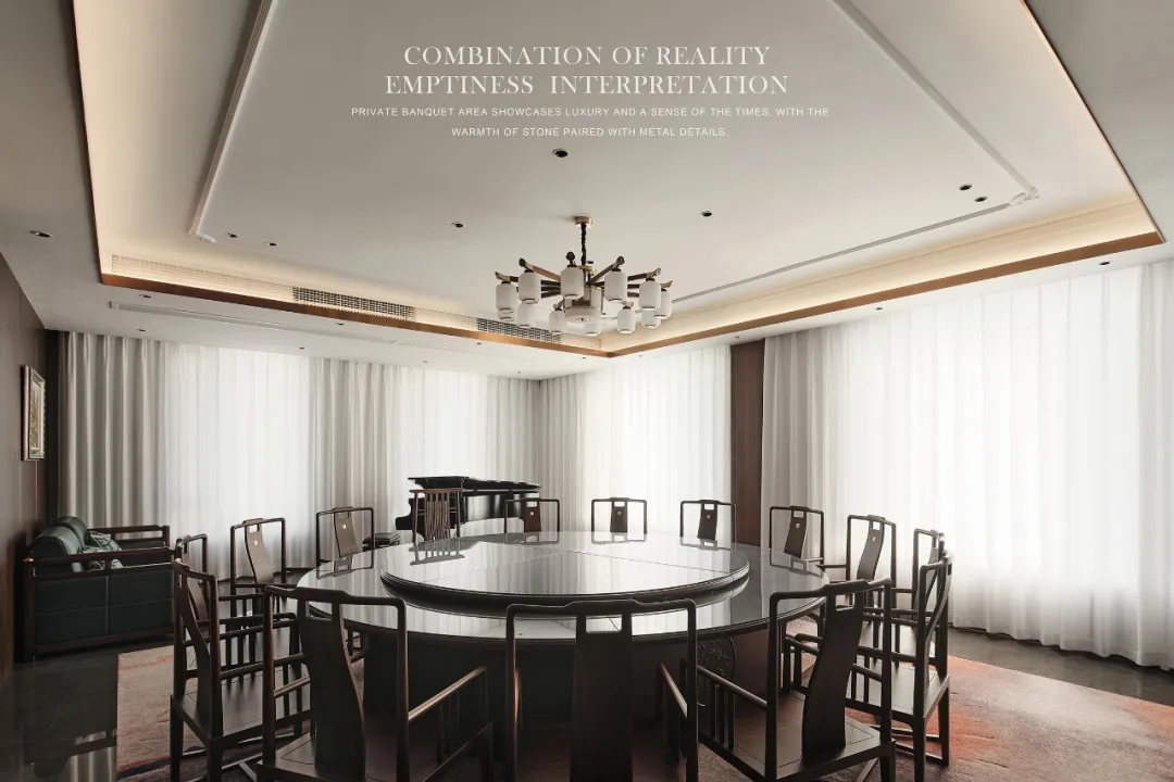 私宴区彰显豪华与时代感,石材的温润与金属的细节搭配,镂空的屏风将山峦的形与意镌刻于此,体验尊贵之感受。