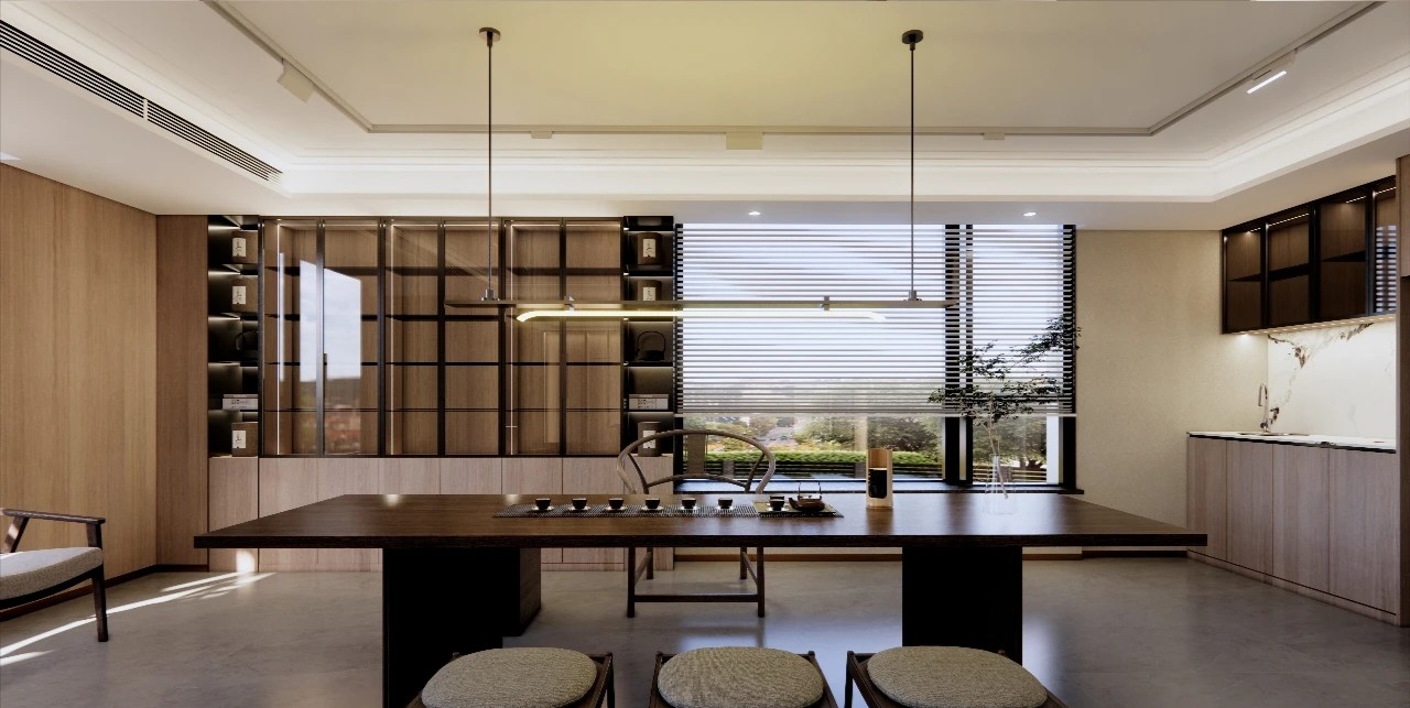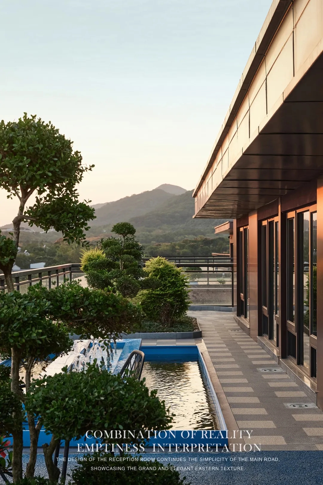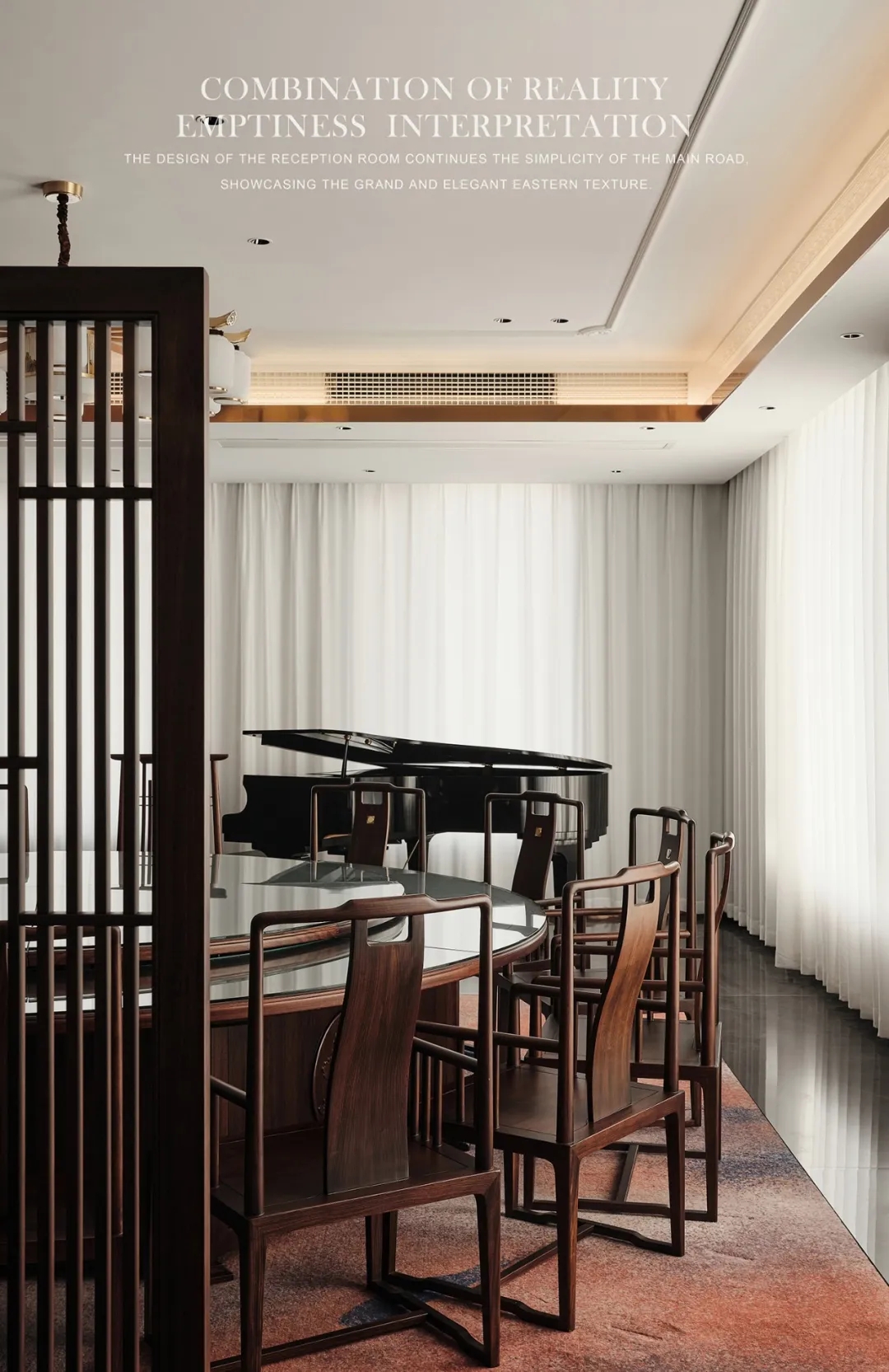 私宴区彰显豪华与时代感,石材的温润与金属的细节搭配,镂空的屏风将山峦的形与意镌刻于此,体验尊贵之感受。