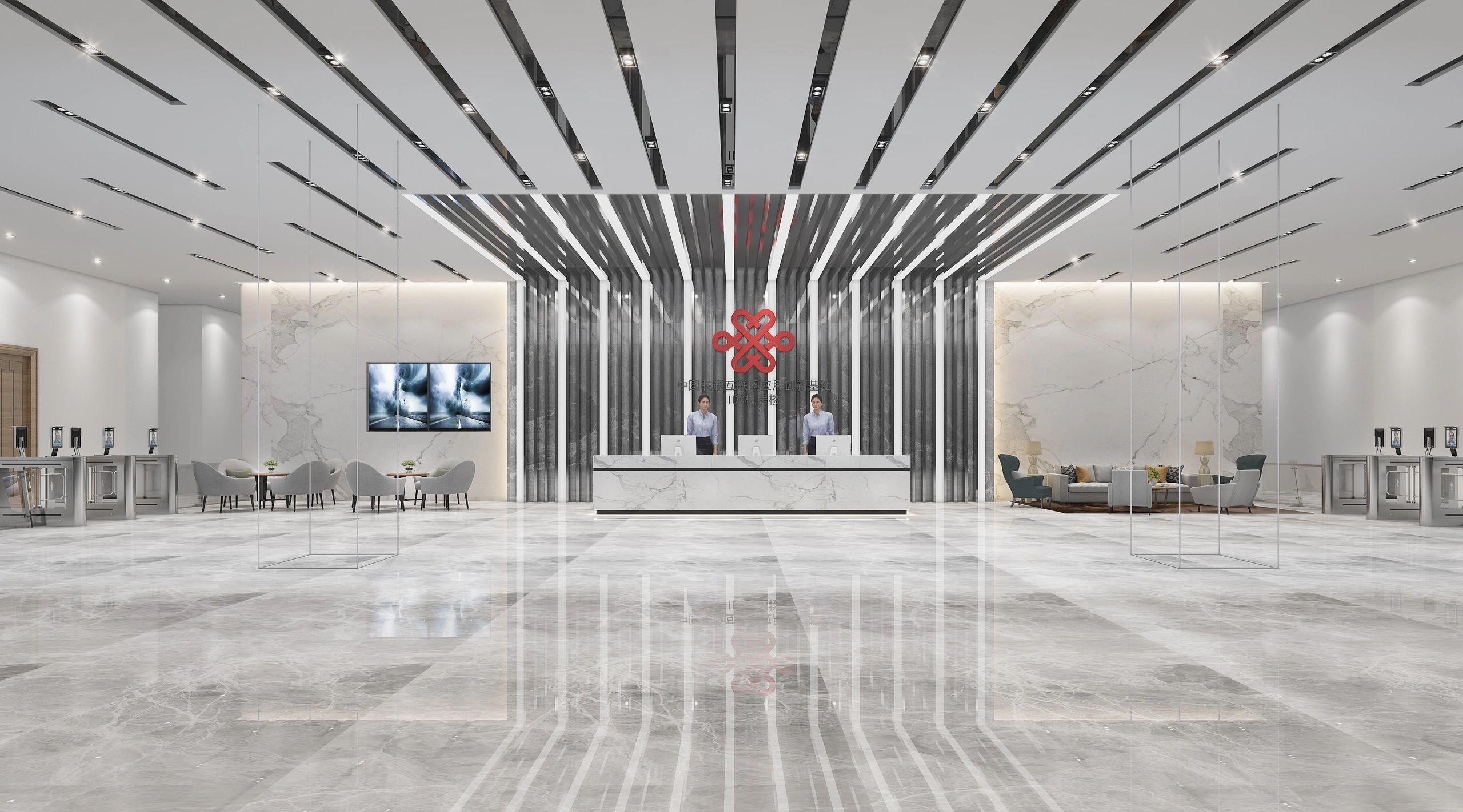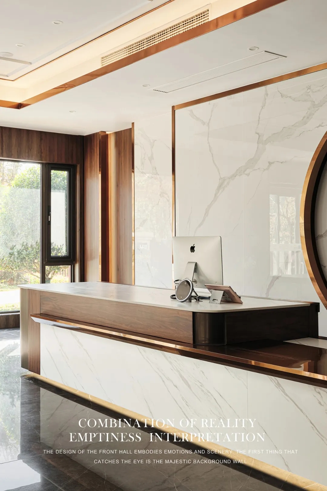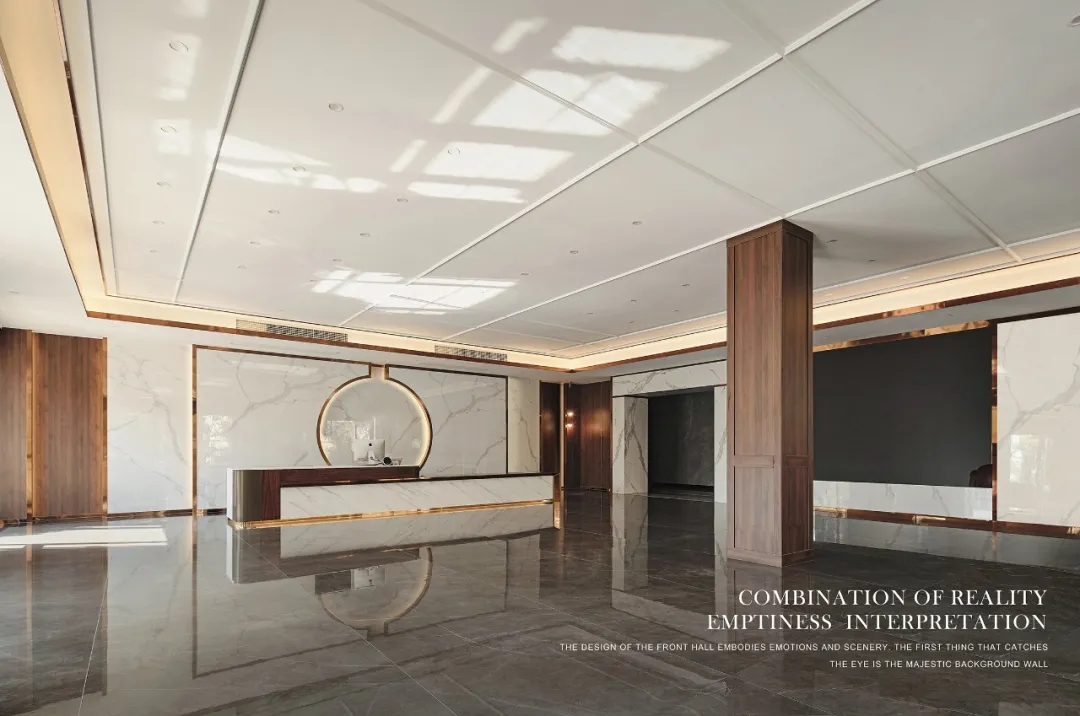 办公大楼设计|前厅的设计寓情与景,首先映入眼帘的是气势磅礴的背景墙月洞造型,勾勒出典雅的人文意境,前台为白色的石材与金属和木纹搭配,增添质感与格调同时,传达出时尚的艺术品味。