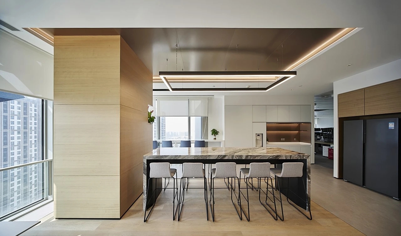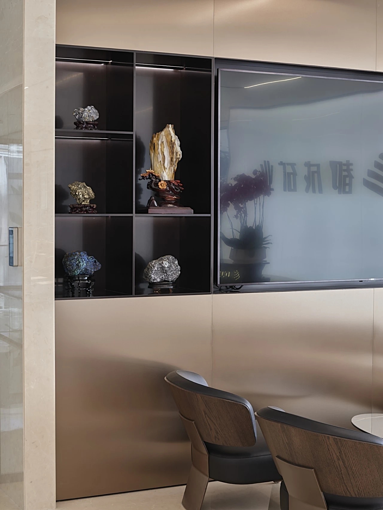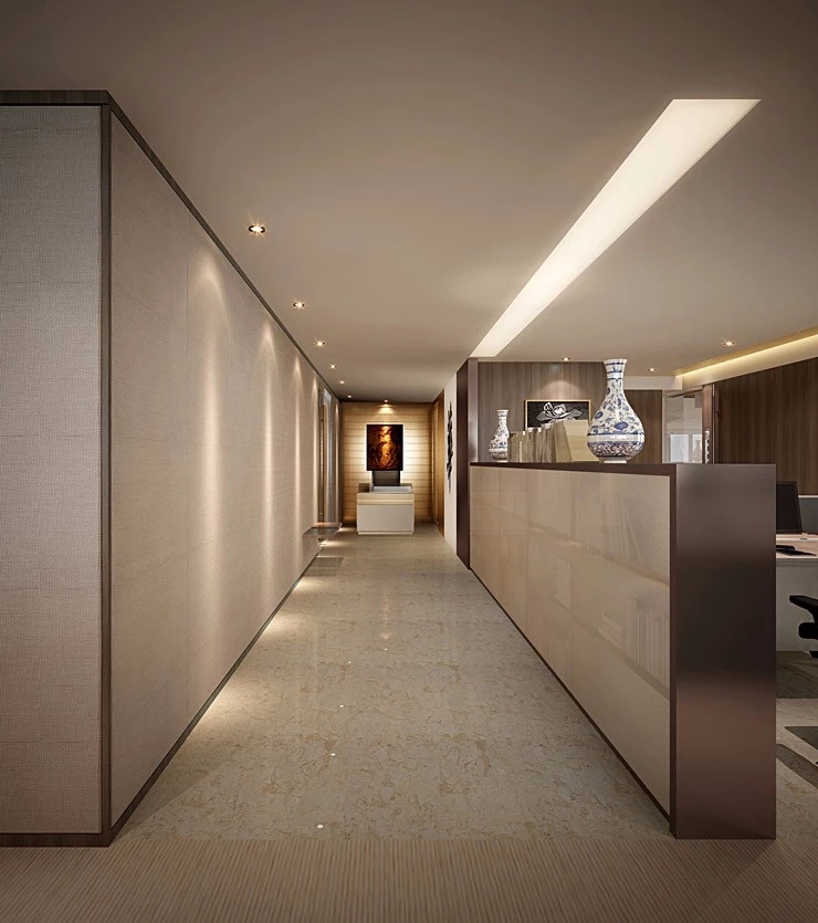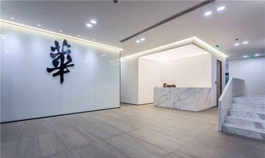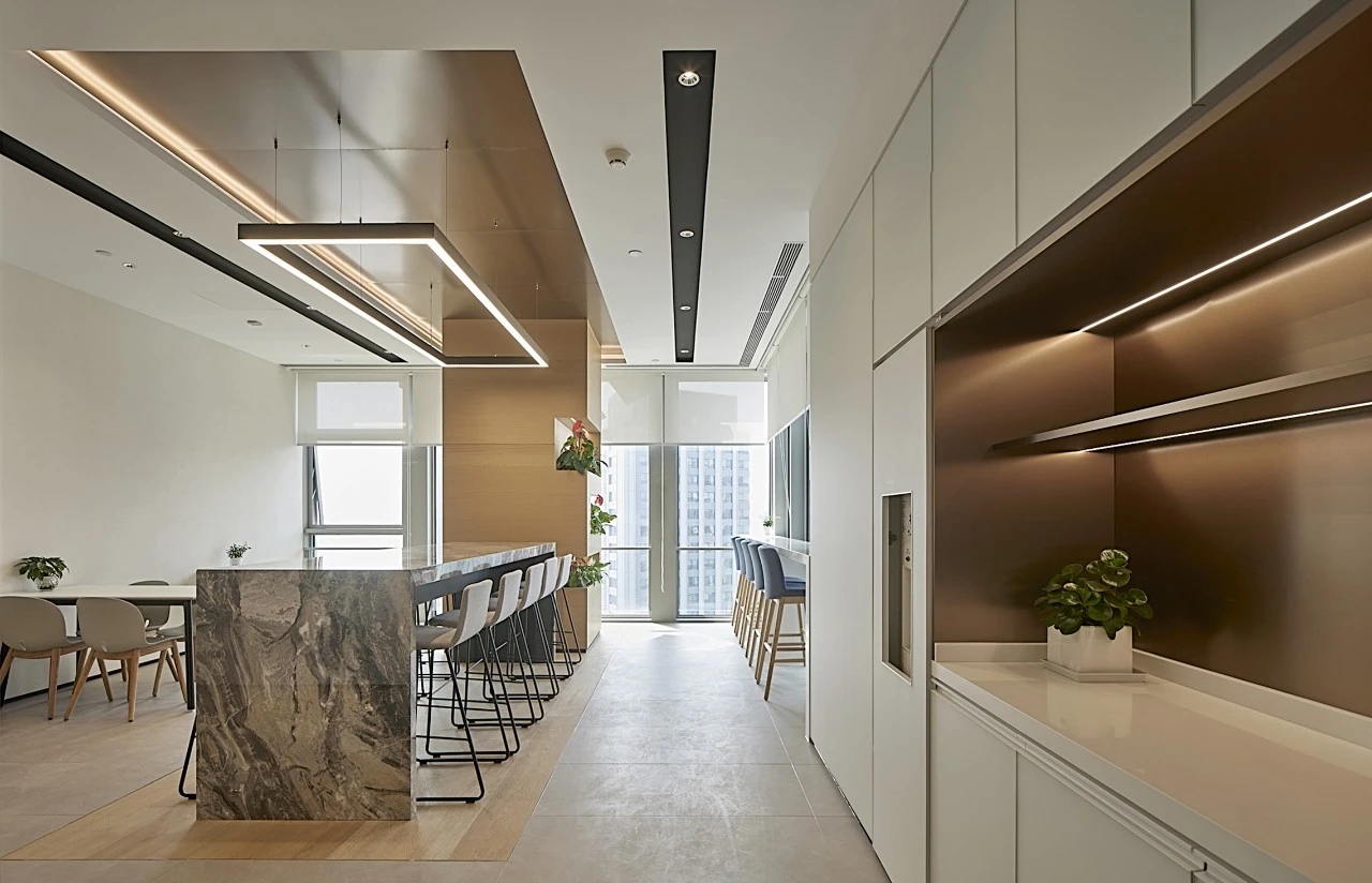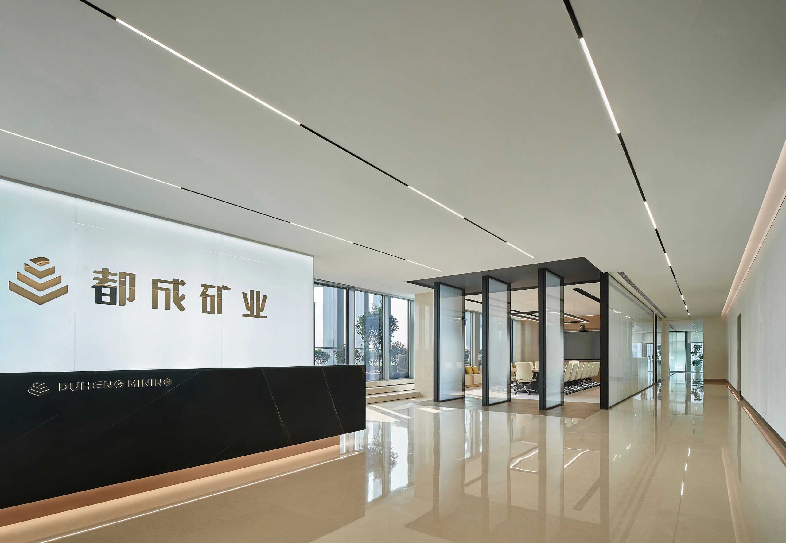 进入都成矿业的前厅,访客会被宽敞的布局和半透明精致的夹丝玻璃招牌墙所吸引。招牌墙的长度恰如其分地展示了都成公司的LOGO,同时可以让自然光从户外露台进来,与露台花园融为一体,营造一种花园绿洲的氛围;前厅及整个走廊地面全部铺设细腻温润的莎安娜米黄大理石,来烘托由铜色金属和劳伦金黑大理石制作的接待台的贵气和高级感。
