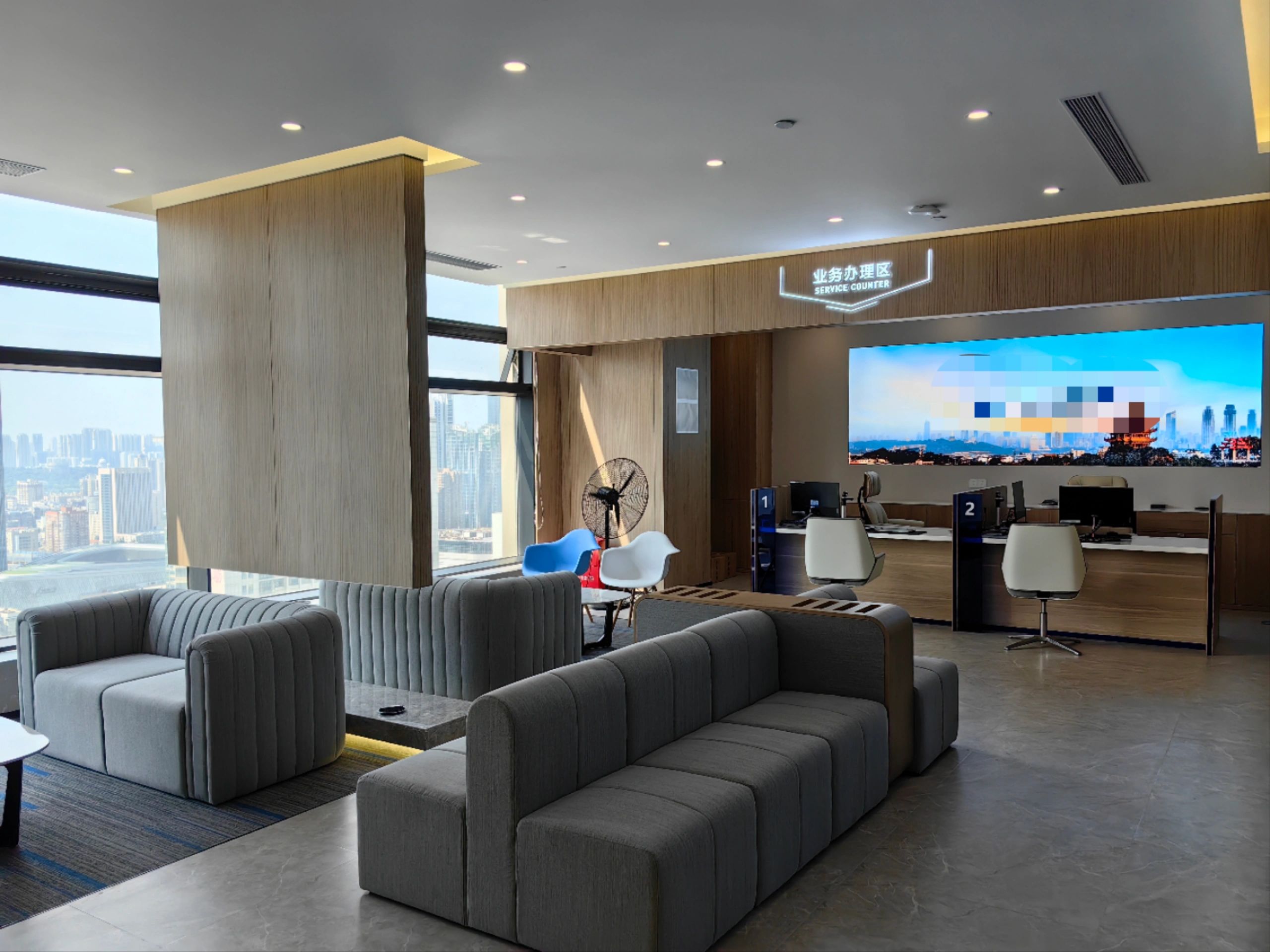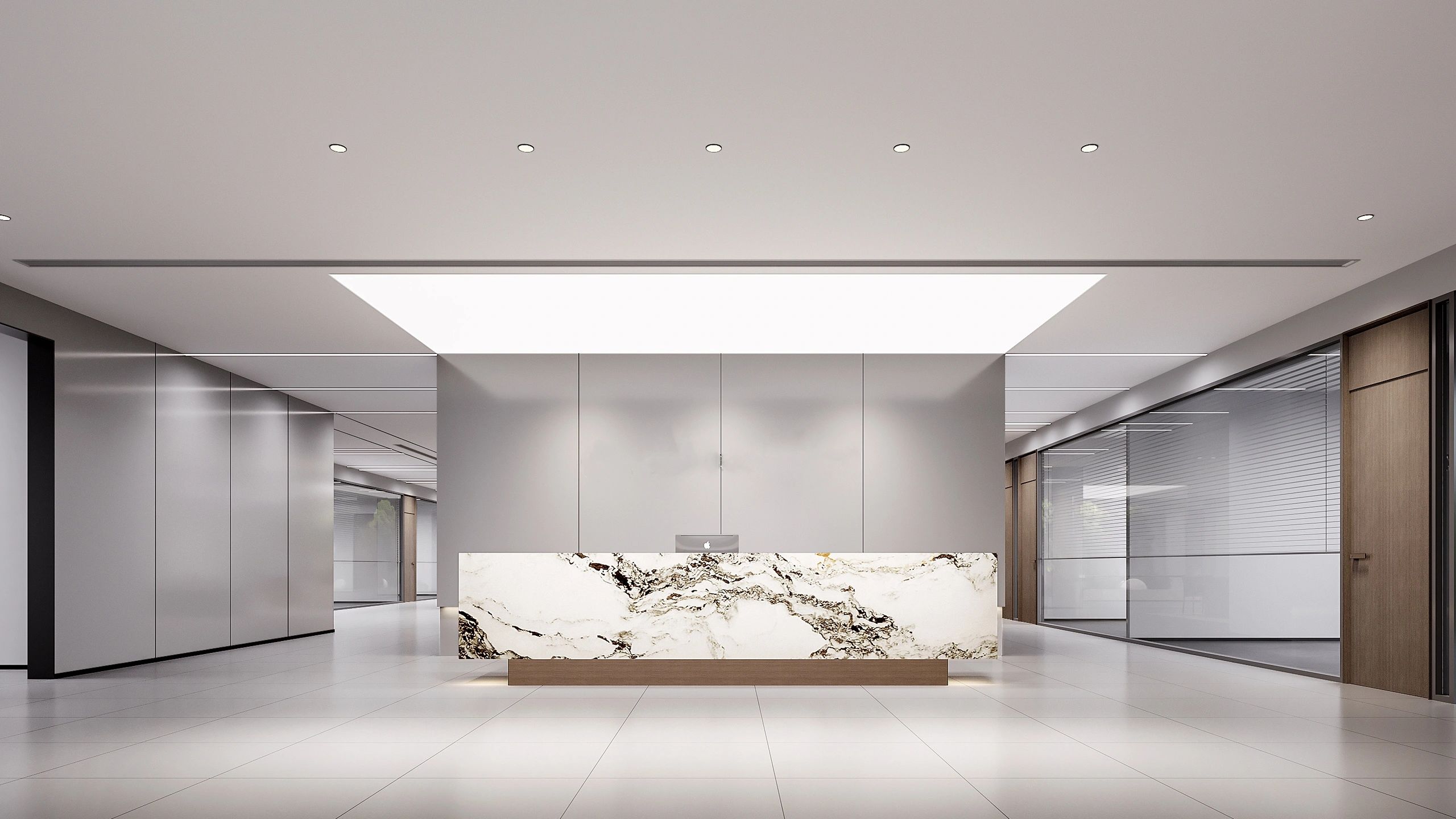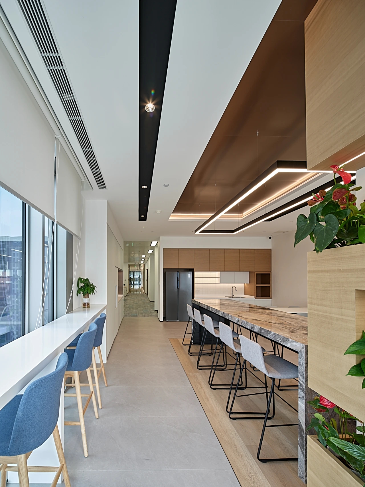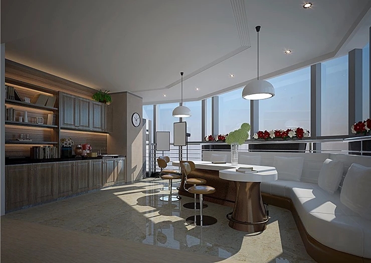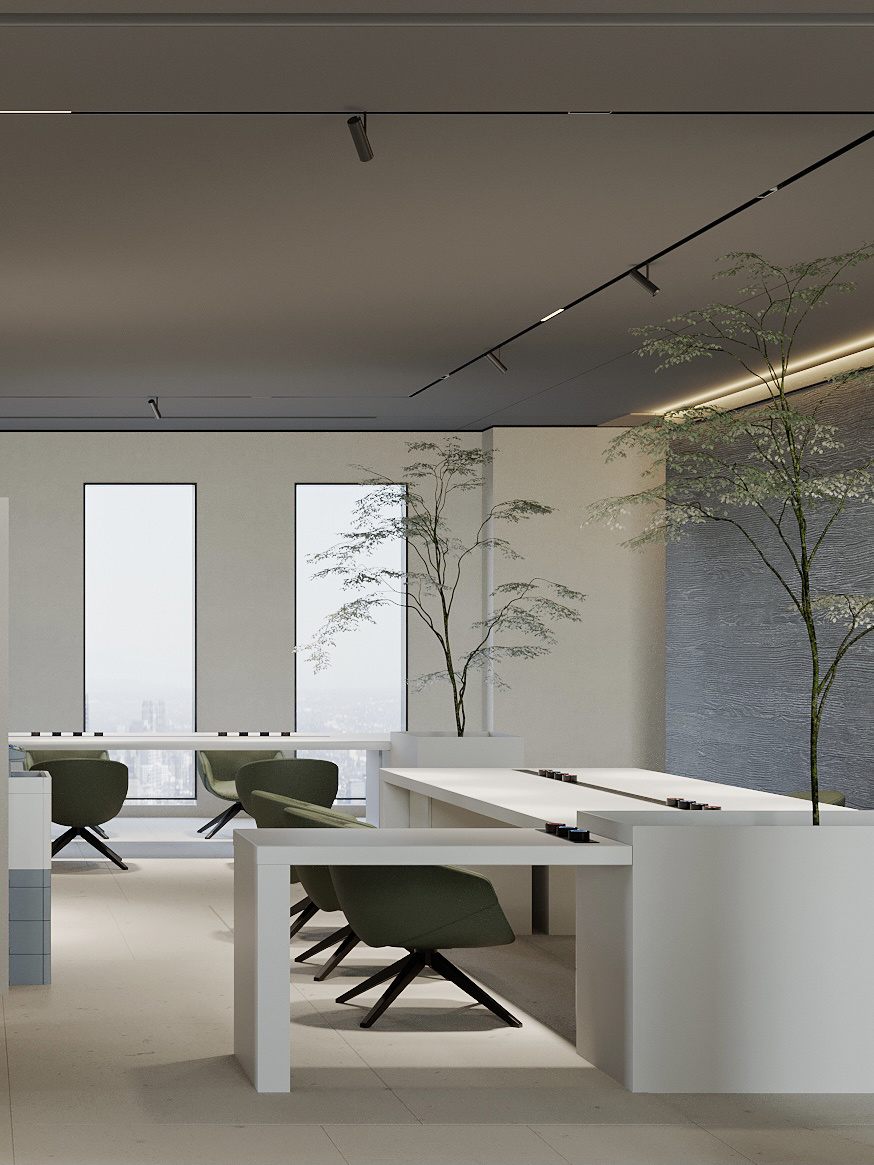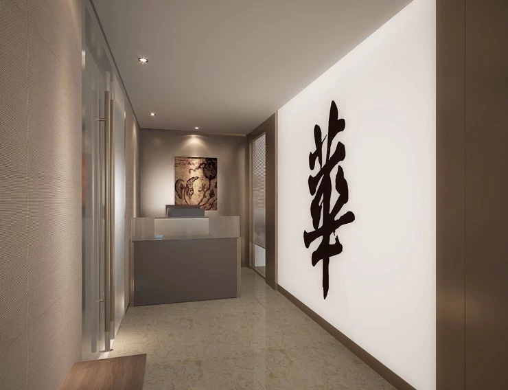 进入都成矿业的前厅,访客会被宽敞的布局和半透明精致的夹丝玻璃招牌墙所吸引。招牌墙的长度恰如其分地展示了都成公司的LOGO,同时可以让自然光从户外露台进来,与露台花园融为一体,营造一种花园绿洲的氛围;前厅及整个走廊地面全部铺设细腻温润的莎安娜米黄大理石,来烘托由铜色金属和劳伦金黑大理石制作的接待台的贵气和高级感。