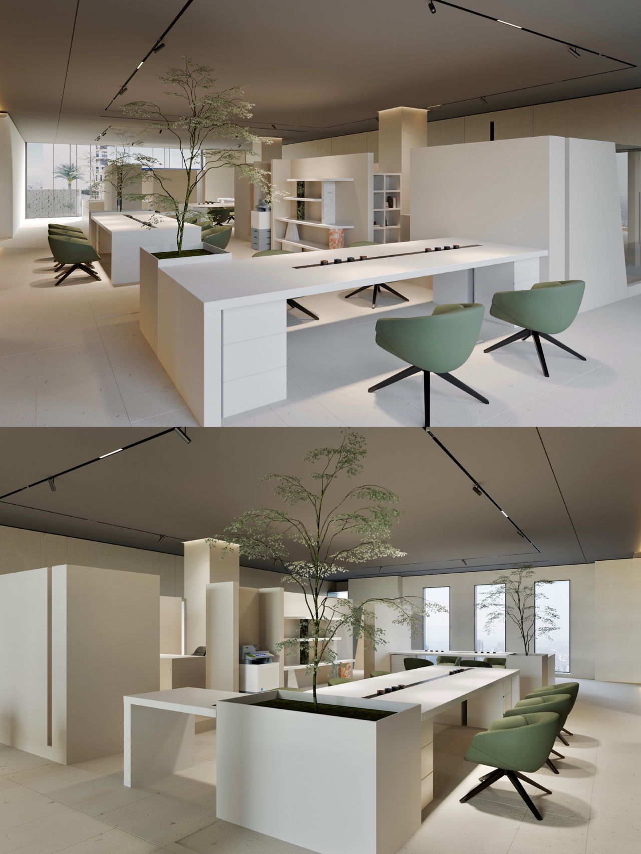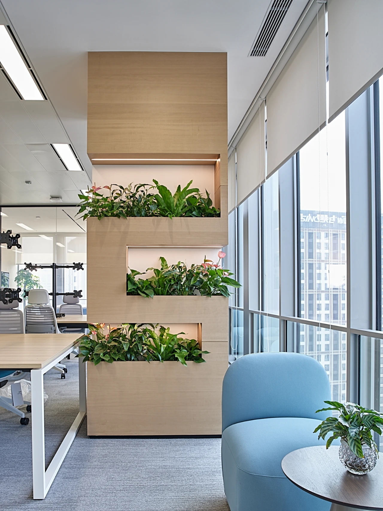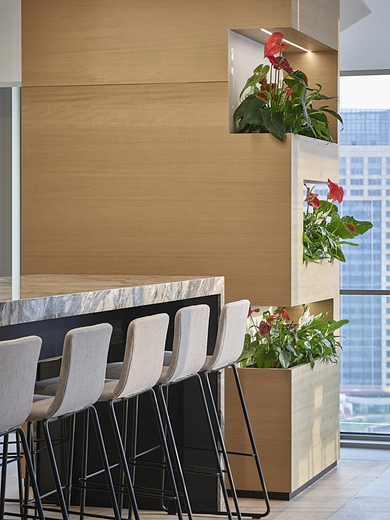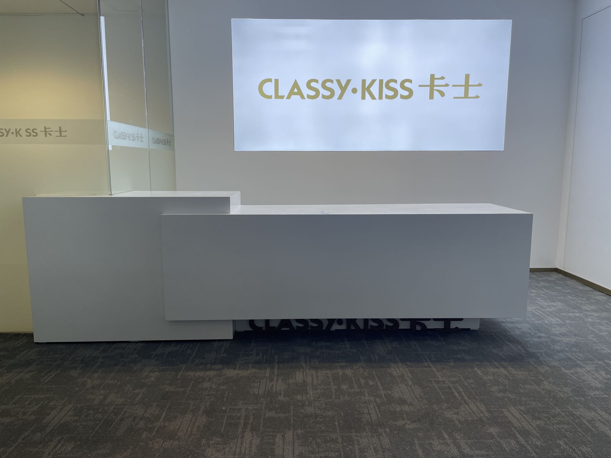 进入都成矿业的前厅,访客会被宽敞的布局和半透明精致的夹丝玻璃招牌墙所吸引。招牌墙的长度恰如其分地展示了都成公司的LOGO,同时可以让自然光从户外露台进来,与露台花园融为一体,营造一种花园绿洲的氛围;前厅及整个走廊地面全部铺设细腻温润的莎安娜米黄大理石,来烘托由铜色金属和劳伦金黑大理石制作的接待台的贵气和高级感。