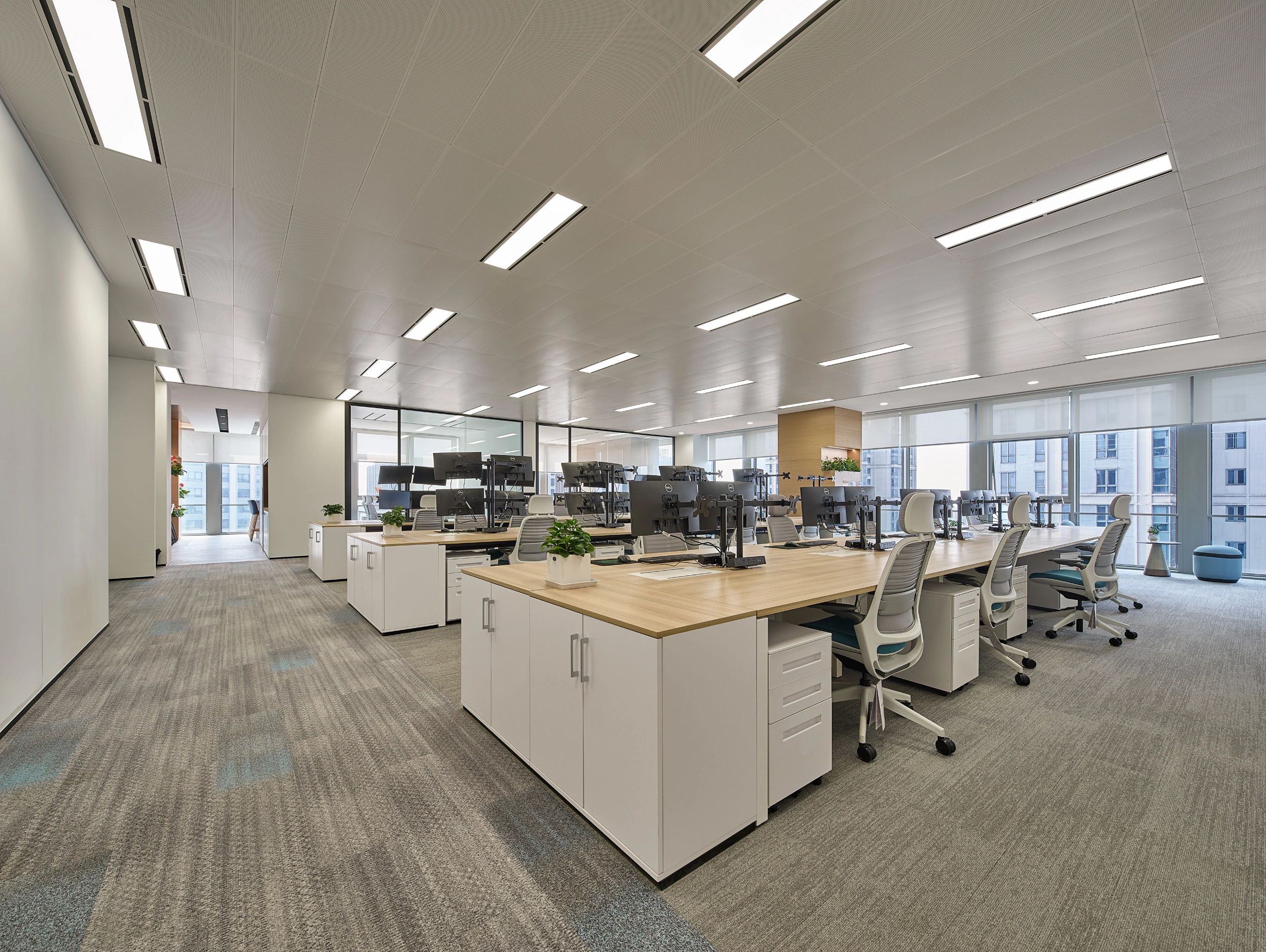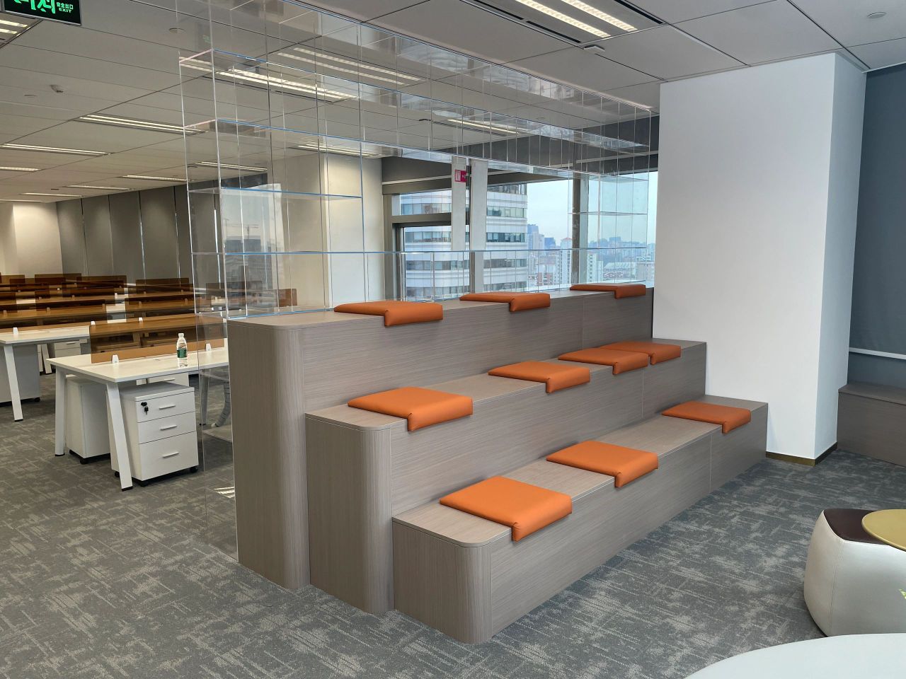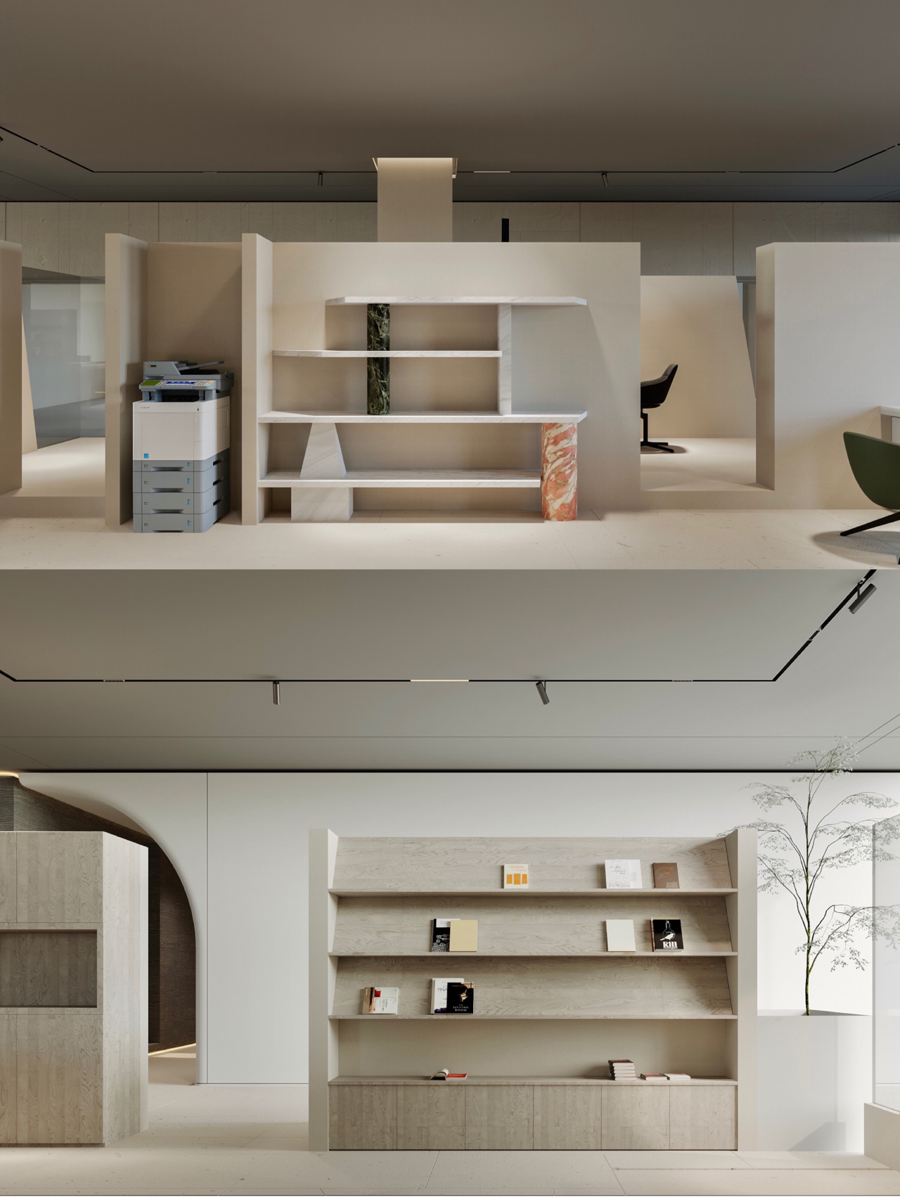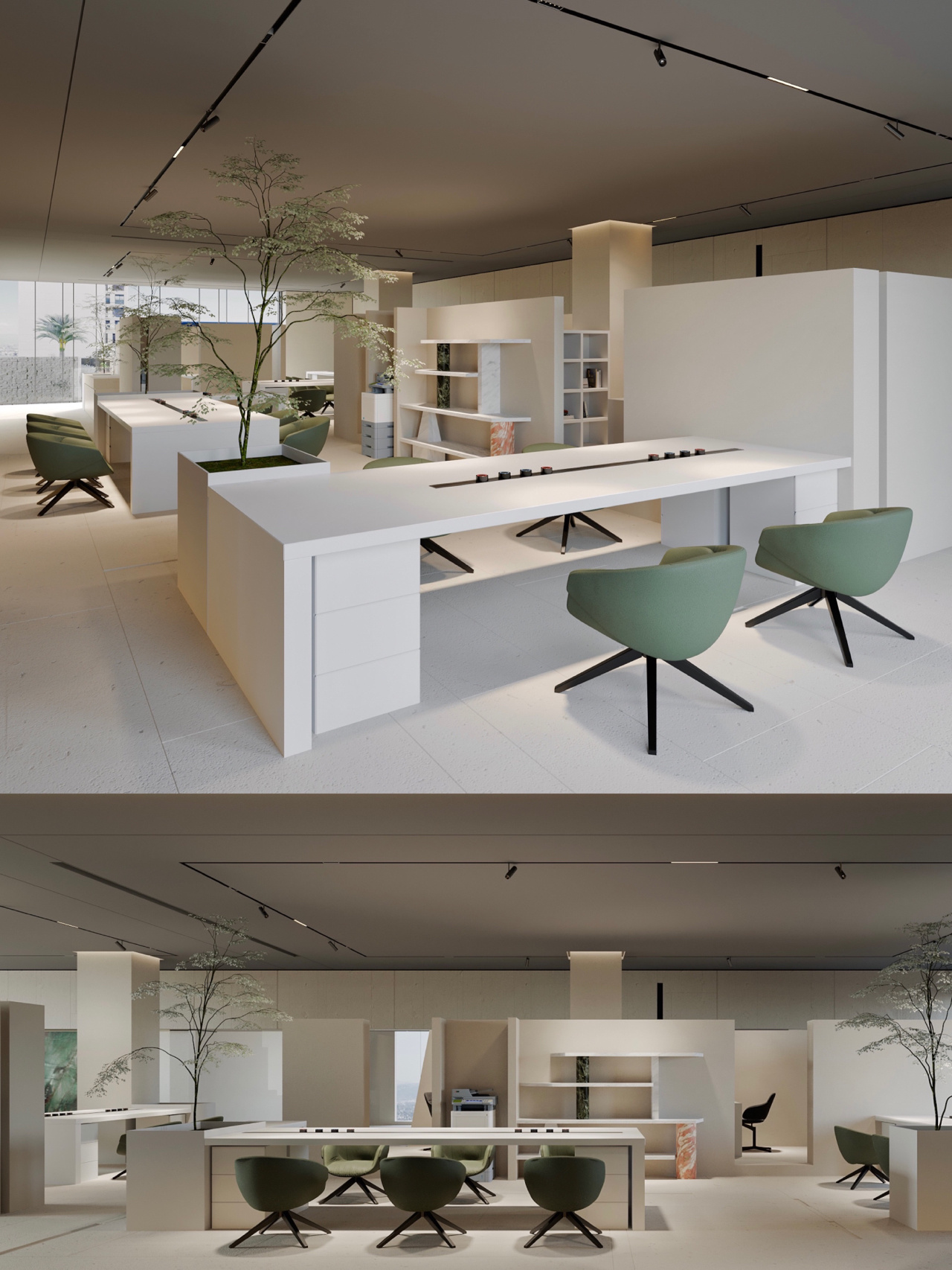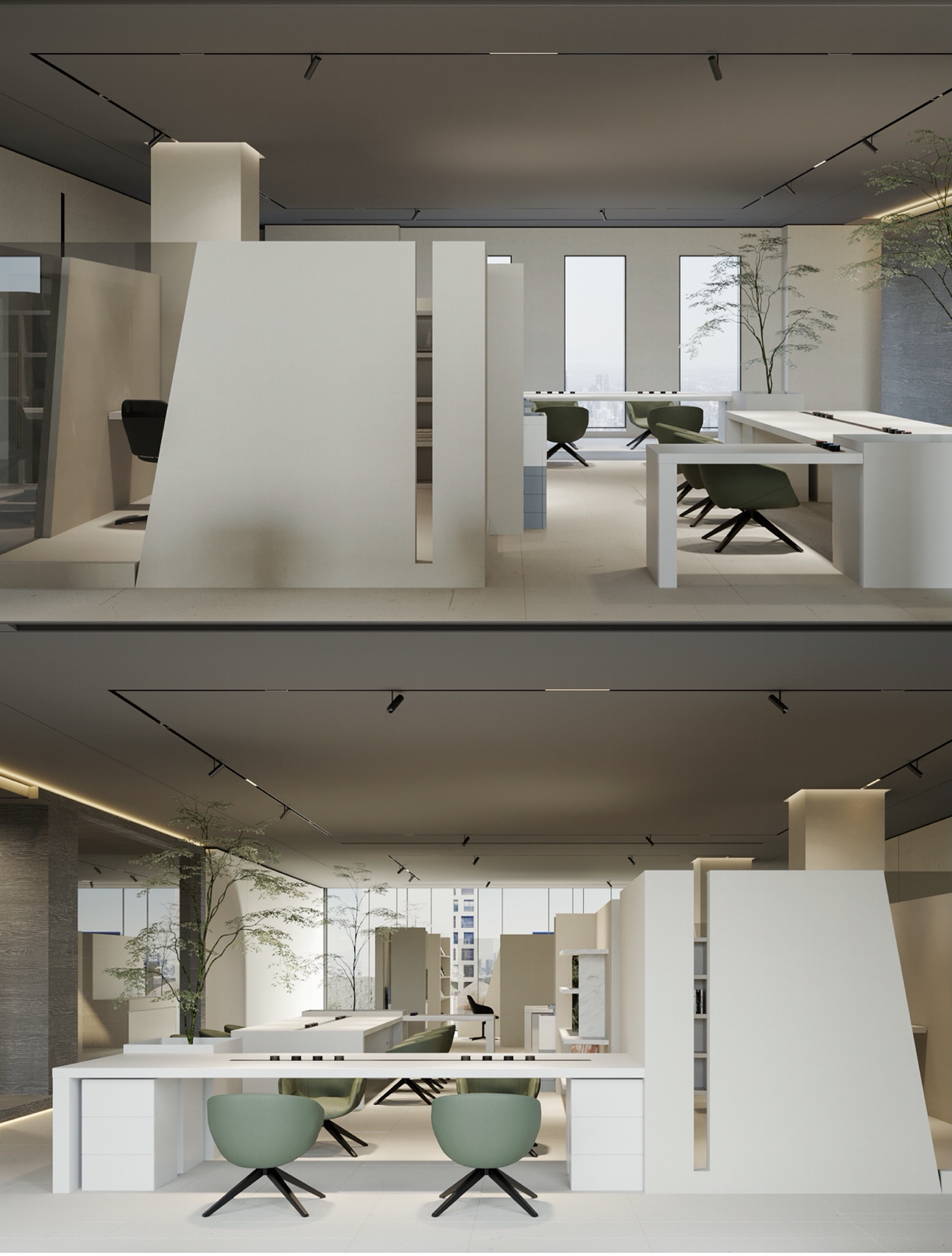 进入都成矿业的前厅,访客会被宽敞的布局和半透明精致的夹丝玻璃招牌墙所吸引。招牌墙的长度恰如其分地展示了都成公司的LOGO,同时可以让自然光从户外露台进来,与露台花园融为一体,营造一种花园绿洲的氛围;前厅及整个走廊地面全部铺设细腻温润的莎安娜米黄大理石,来烘托由铜色金属和劳伦金黑大理石制作的接待台的贵气和高级感。
