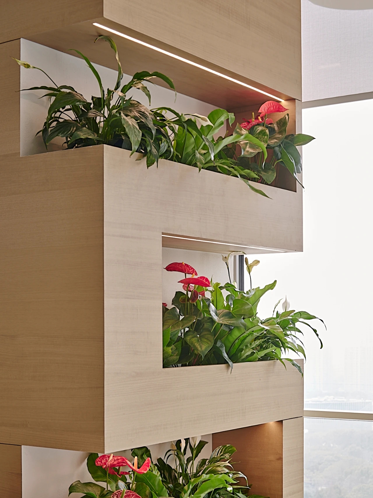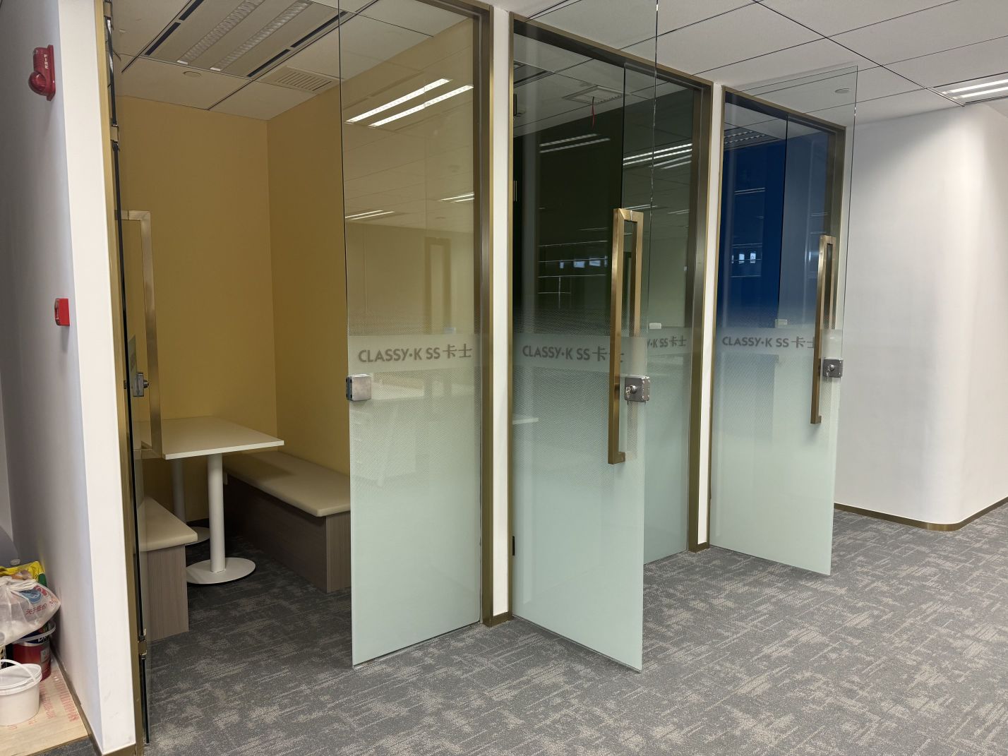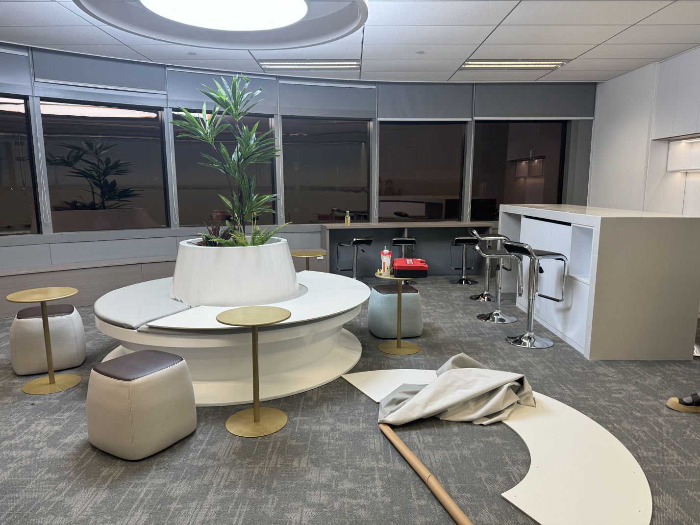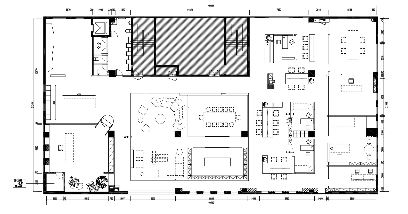 进入都成矿业的前厅,访客会被宽敞的布局和半透明精致的夹丝玻璃招牌墙所吸引。招牌墙的长度恰如其分地展示了都成公司的LOGO,同时可以让自然光从户外露台进来,与露台花园融为一体,营造一种花园绿洲的氛围;前厅及整个走廊地面全部铺设细腻温润的莎安娜米黄大理石,来烘托由铜色金属和劳伦金黑大理石制作的接待台的贵气和高级感。