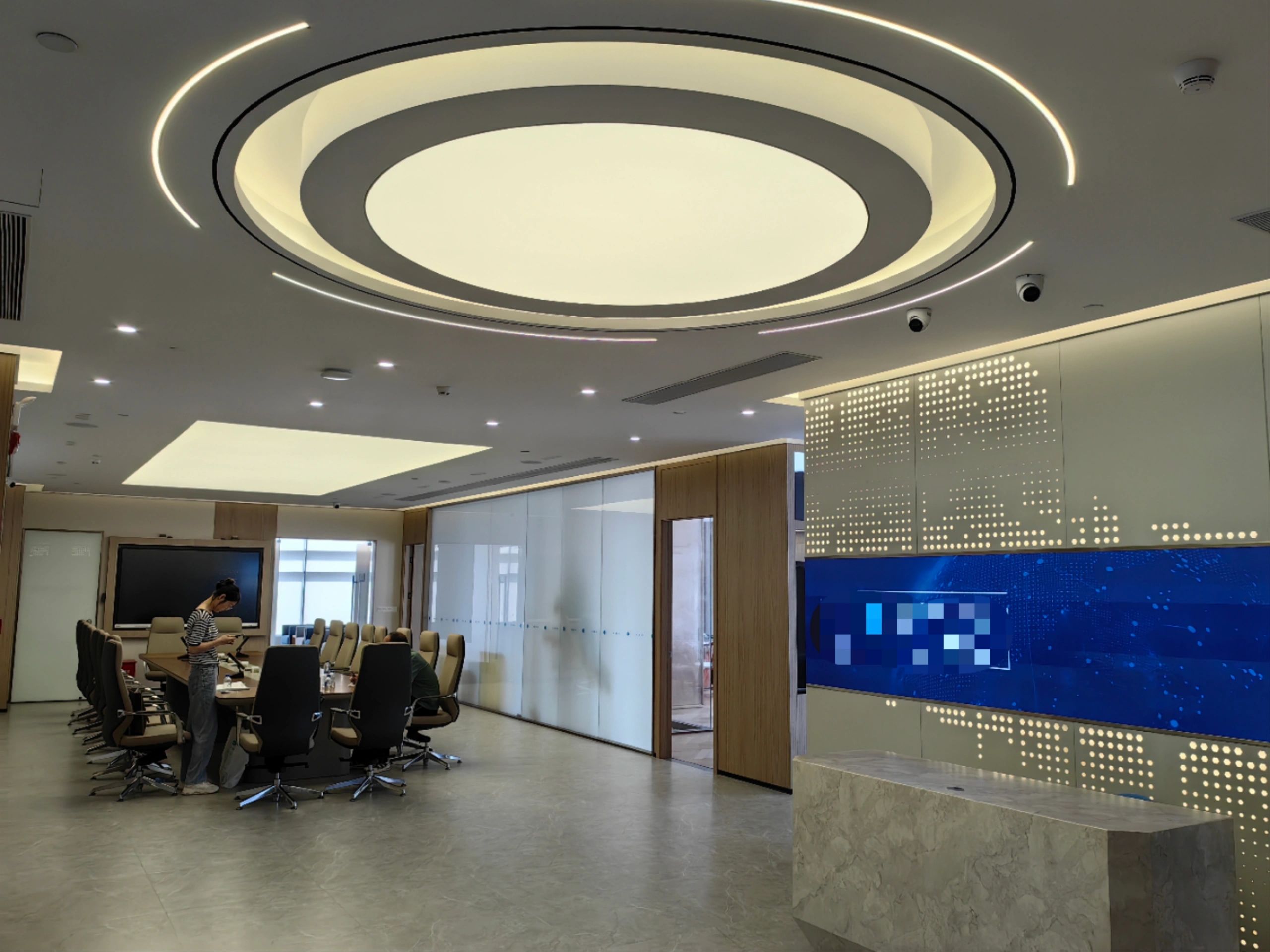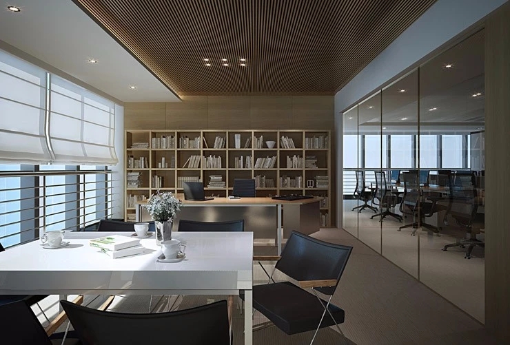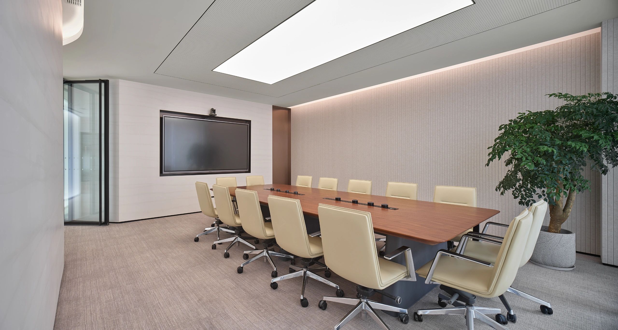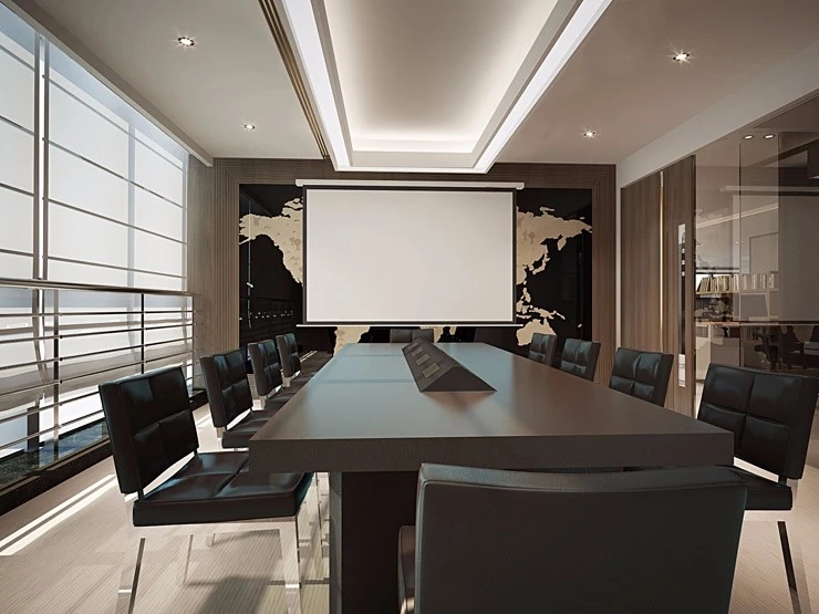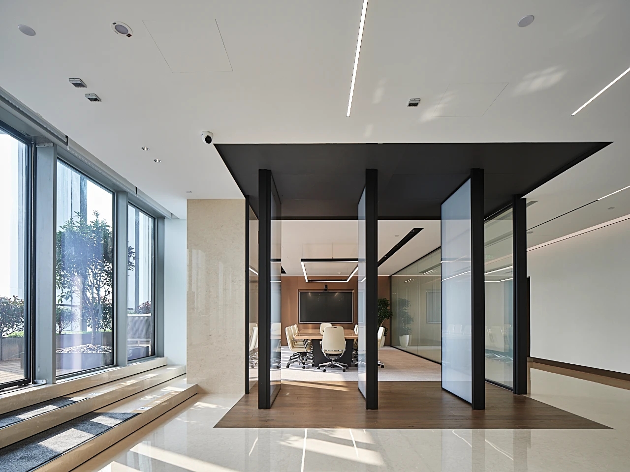 董事会议室通过三个超宽的玻璃转门与前厅贯通,视觉上不仅给前厅一种延伸的效果;而且在空间的使用上提供了更多灵活性-既可以单独作为会议室,也可以与前厅和户外花园合并作为举办大型宴会的场所。