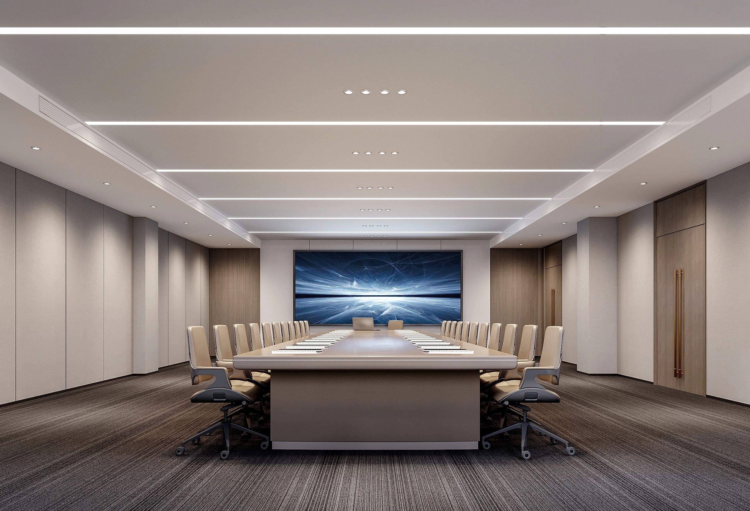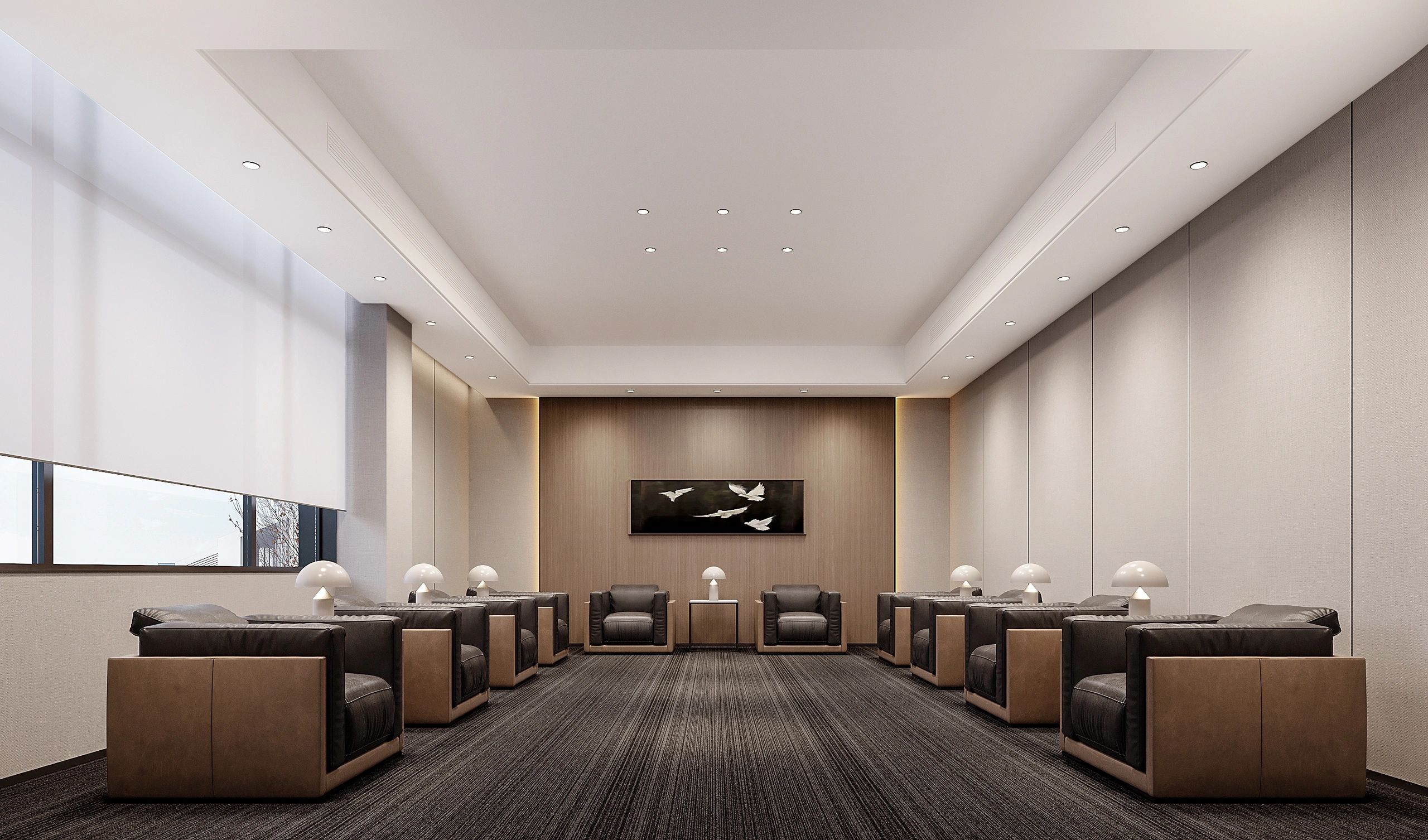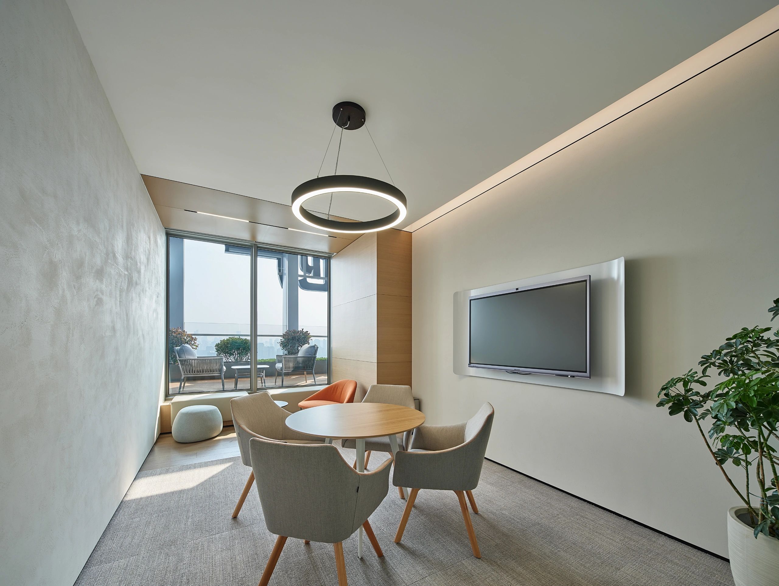 董事会议室通过三个超宽的玻璃转门与前厅贯通,视觉上不仅给前厅一种延伸的效果;而且在空间的使用上提供了更多灵活性-既可以单独作为会议室,也可以与前厅和户外花园合并作为举办大型宴会的场所。
