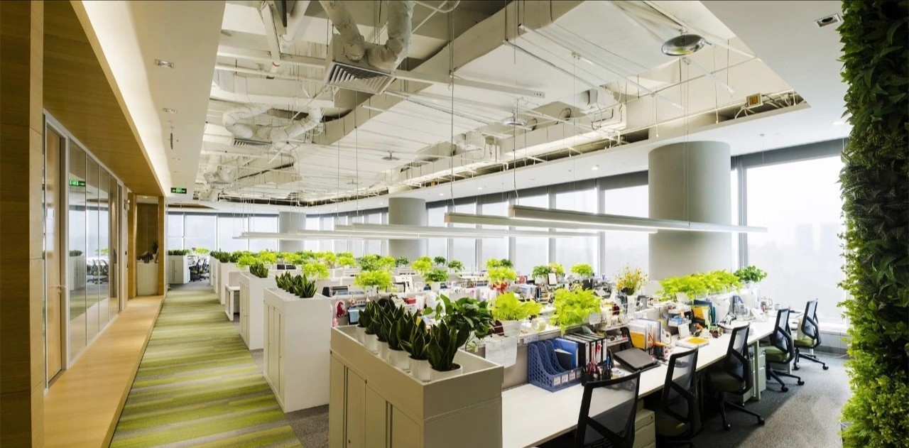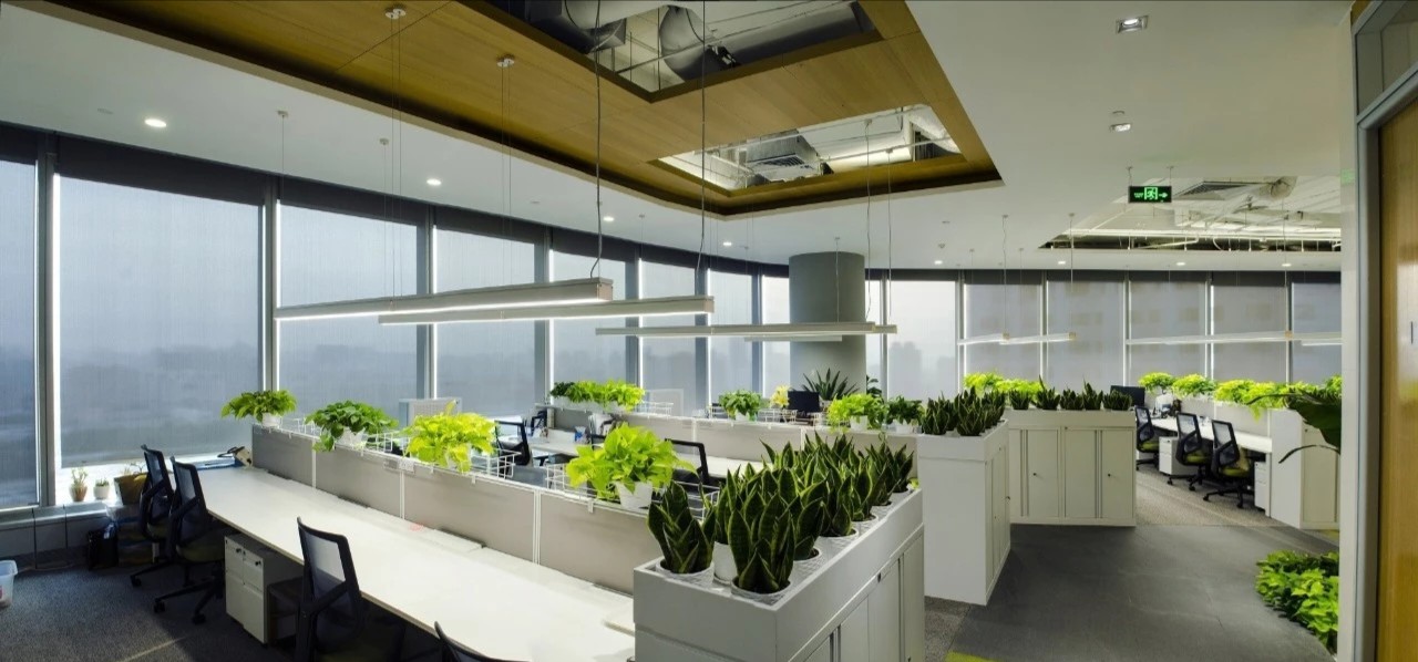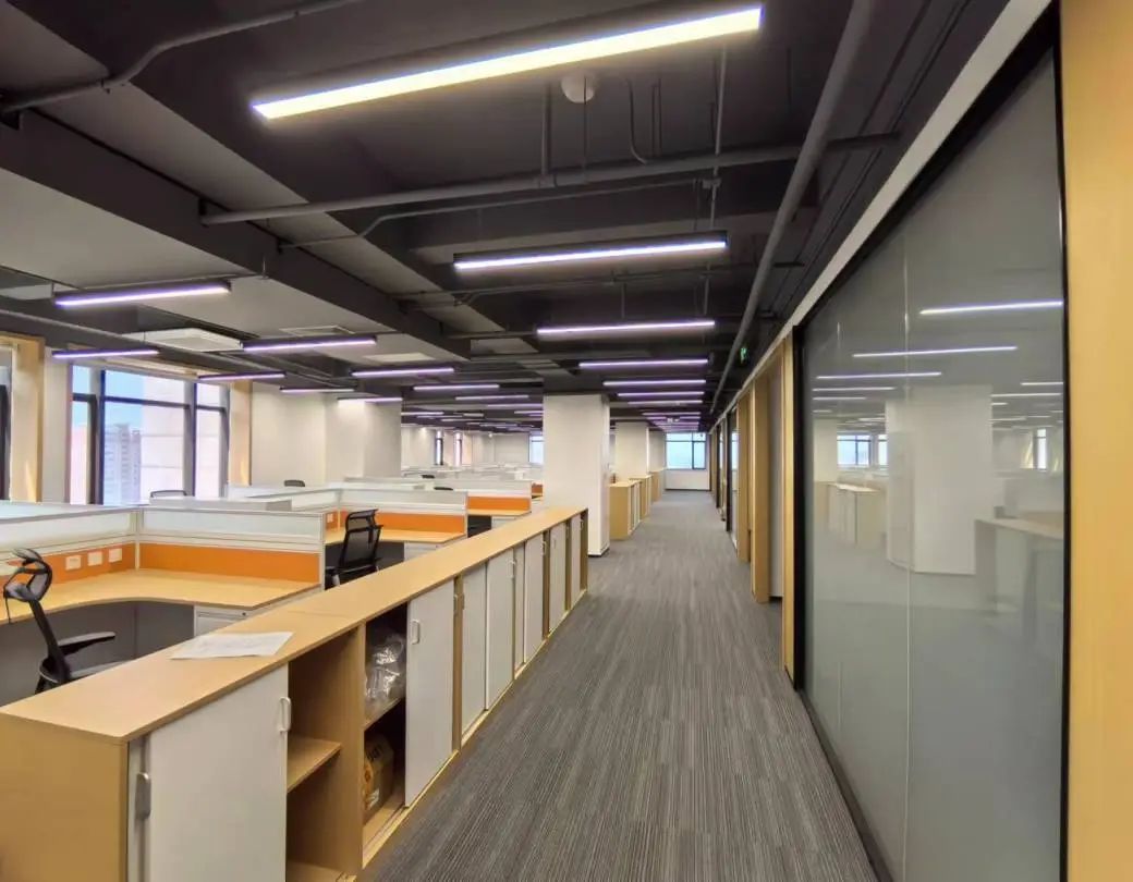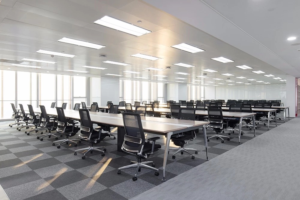 从前台经过道到集中办公区,由绿至灰渐变的地毯很好的中和了区域转换时的视觉冲突。集中办公区利用通透的自然采光,黑、白、灰的大面积纯色,还原了极简主义应有的美感。高低错落的绿植布置缓解了员工工作时的紧张疲劳。疏密有致,宽敞干净的工位设置,既保证了公司的用人需求,又保证员工办公时不会产生拥挤与局促感。