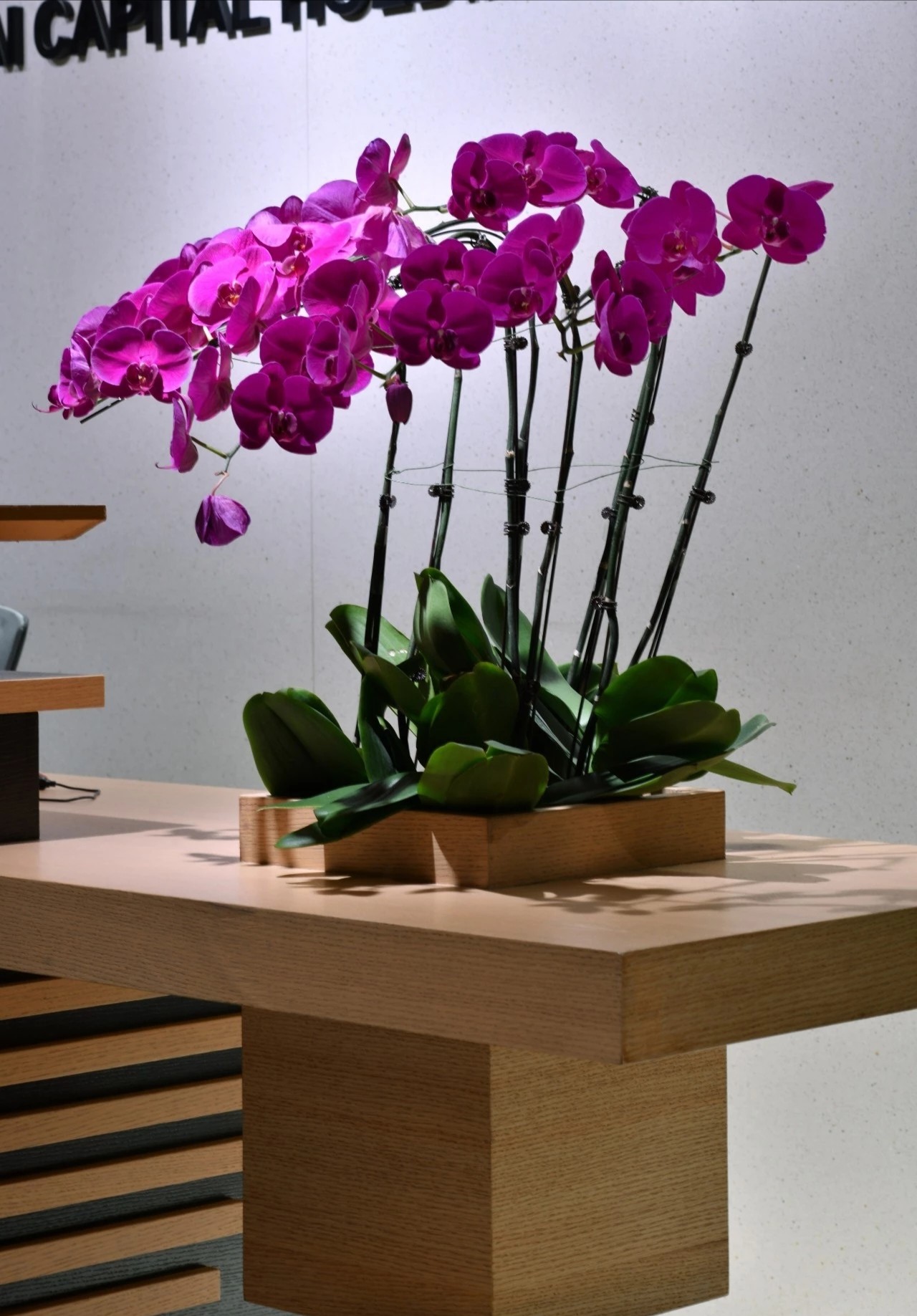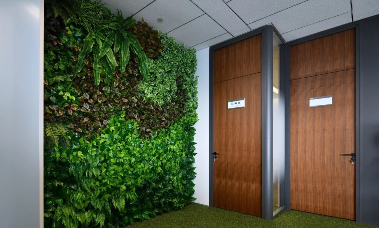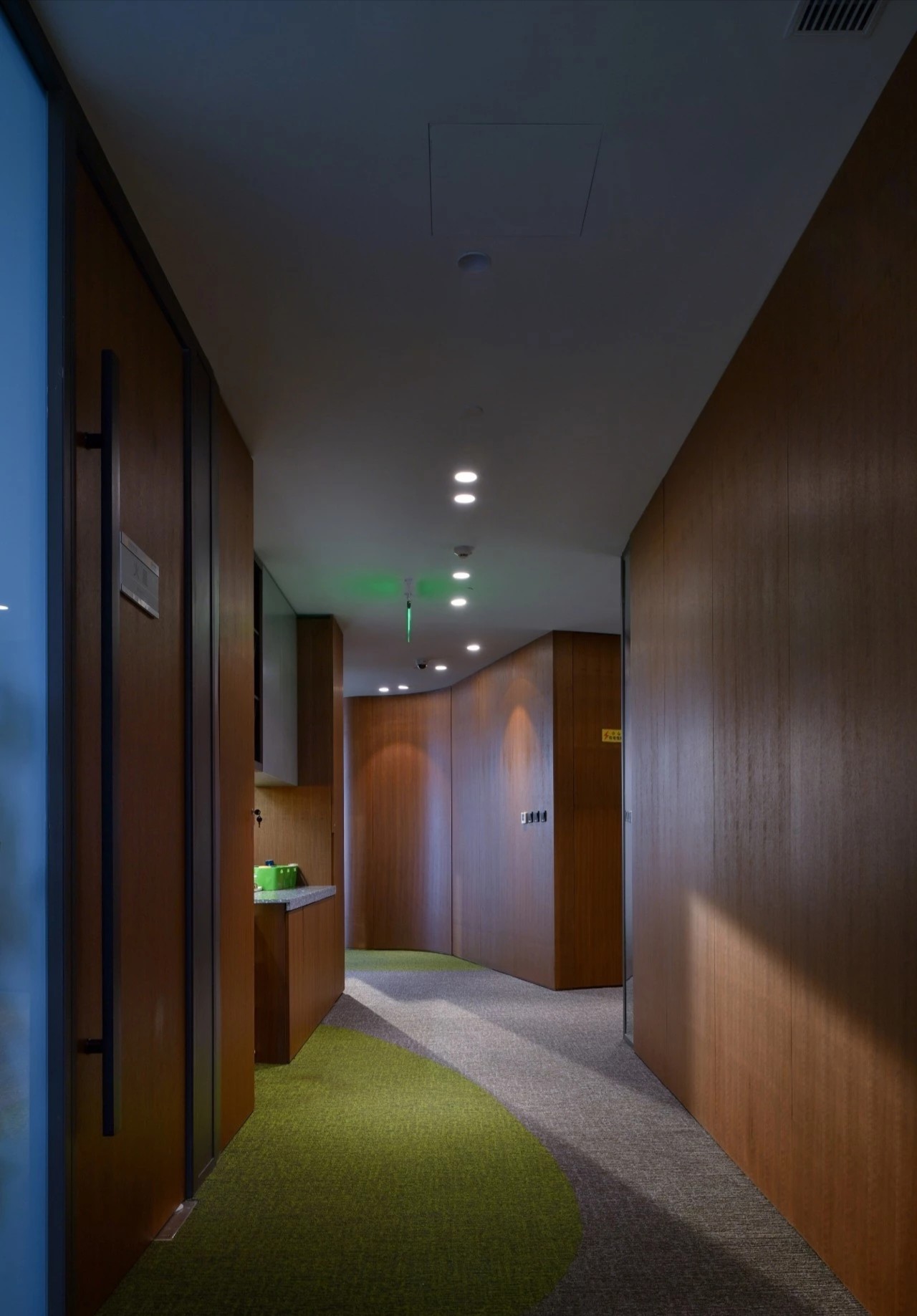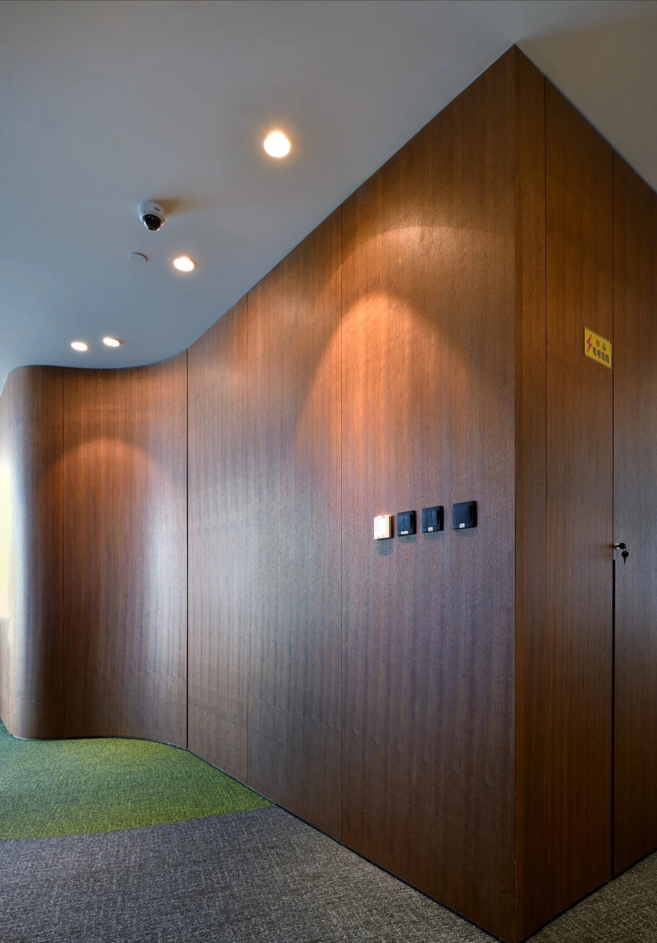 走进办公室,最先映入眼帘的前台就在传统设计中创造出了新的形式感。前台装饰通过简单的长短木块搭配,以客户logo为中心,勾画出了流畅自然的线条,线条布局讲求既错落又规整,既圆润又锋利,将现代审美的抽象与古典艺术的厚重融为一体。前台一隅凌空架设的紫色蝴蝶兰是整体色彩搭配中唯一一抹艳丽,不仅调和了色彩的冷暖平衡,又为庄重的氛围中添加了一丝情趣。整体空间大面积木饰面的运用奠定了商务风格正式且严肃的基调,作为点缀的立体绿植墙面又为其注入了鲜活和灵动的气息,使得其格调兼容并蓄,视觉效果稳中有变,体现了企业专业、热情、亲和的风貌。