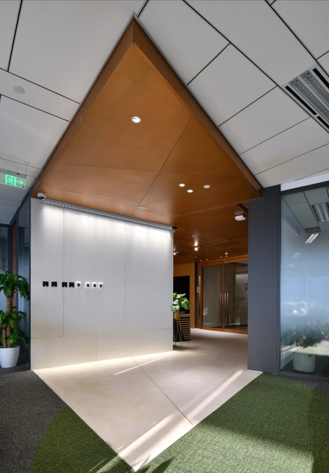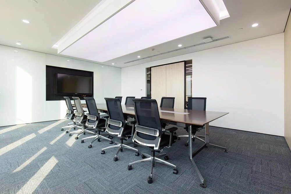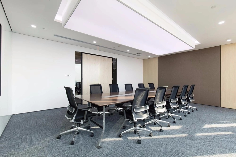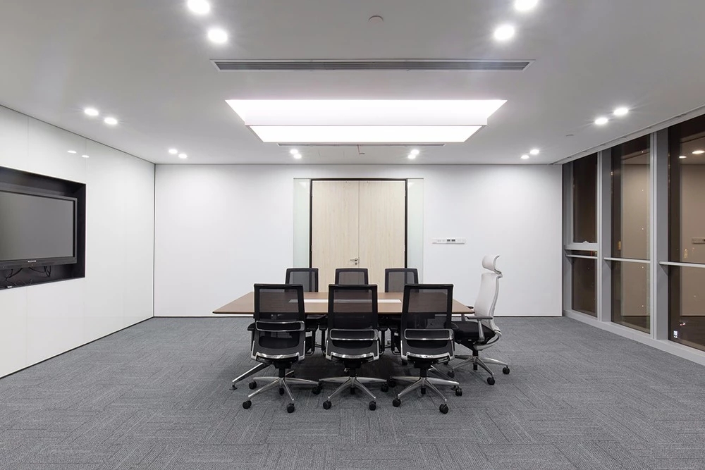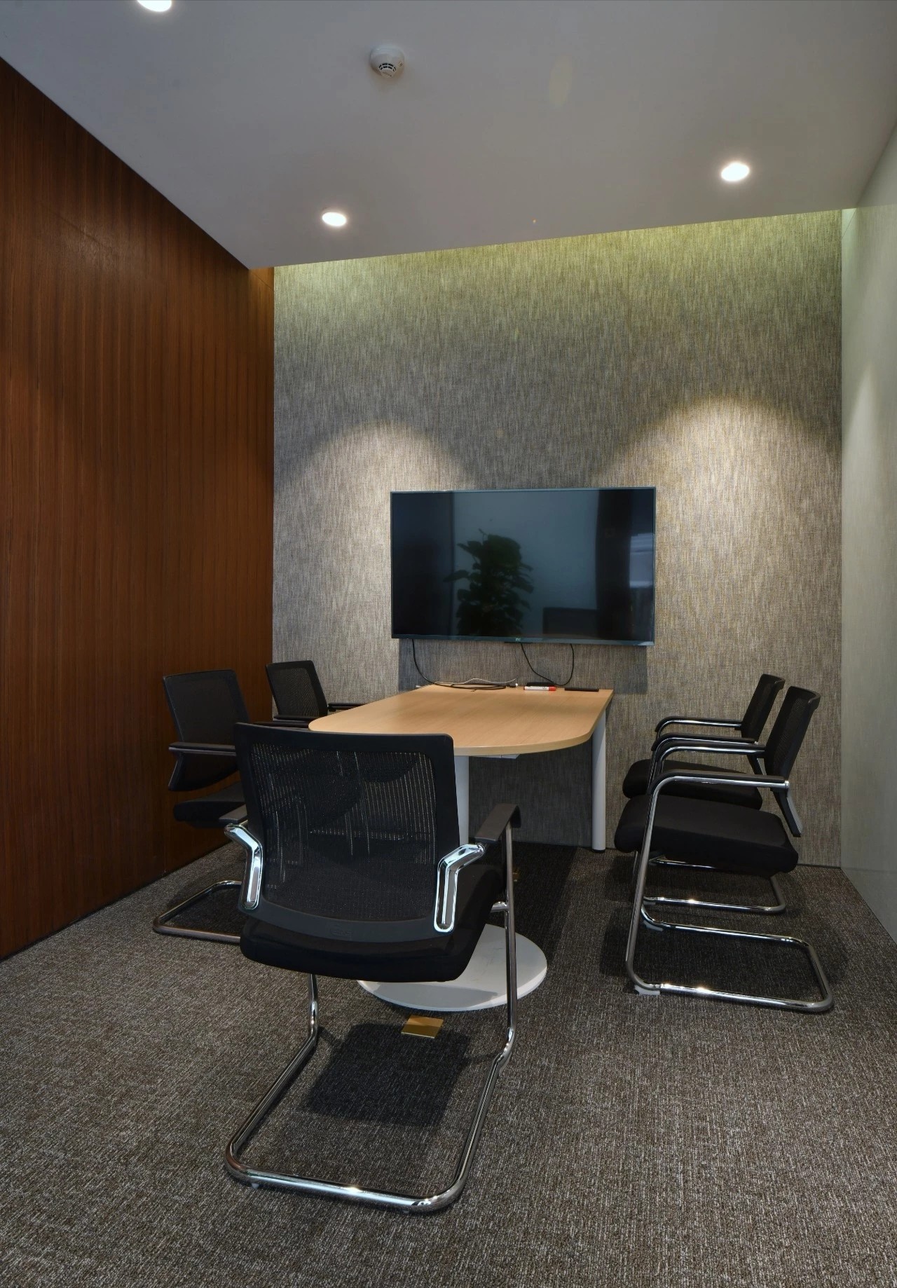 小会议室的设计风格与大会议室颇多不同,均是为体现两个会议室功能属性不同有意为之,体现了设计师对设计语言的深刻理解。不同于大会议室的开放性,小会议室以烤漆玻璃隔开内外空间,又以紧凑布局营造节奏感,用以强调小会议室作为日常部门任务布置、临时会议、工作研讨等用途所需要的高效率、快节奏。绿色地毯与绿植又调和了快节奏带来的紧张感,一张一弛之间更显现代办公的人性化理念。