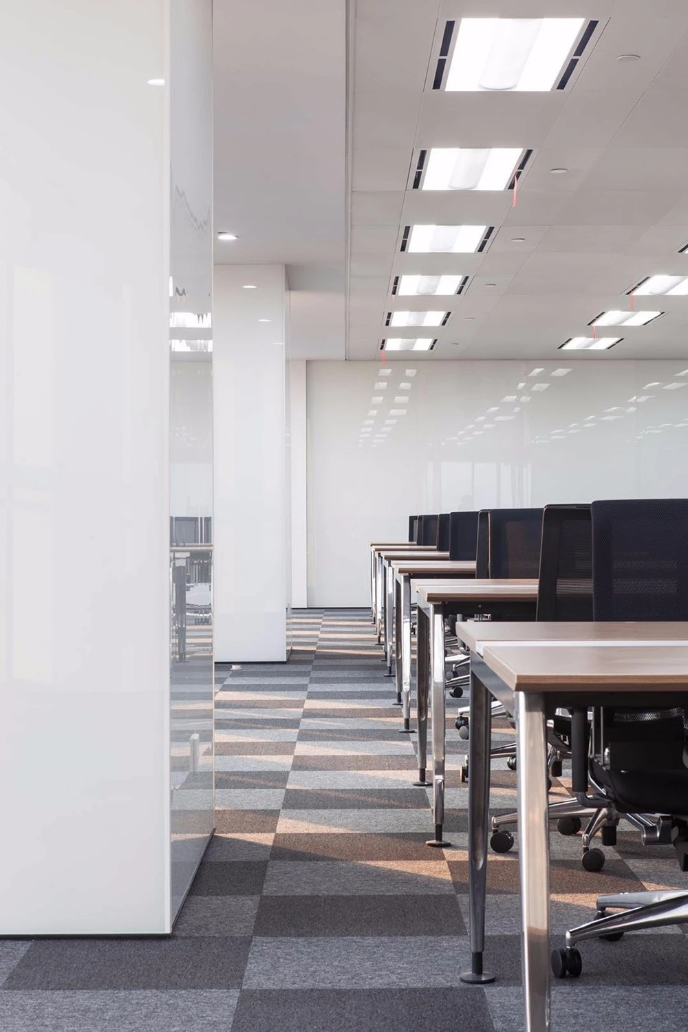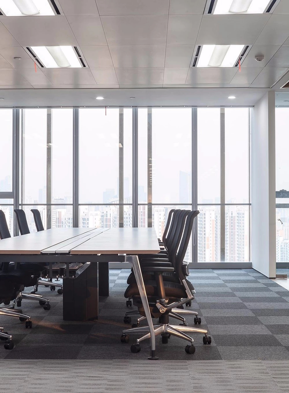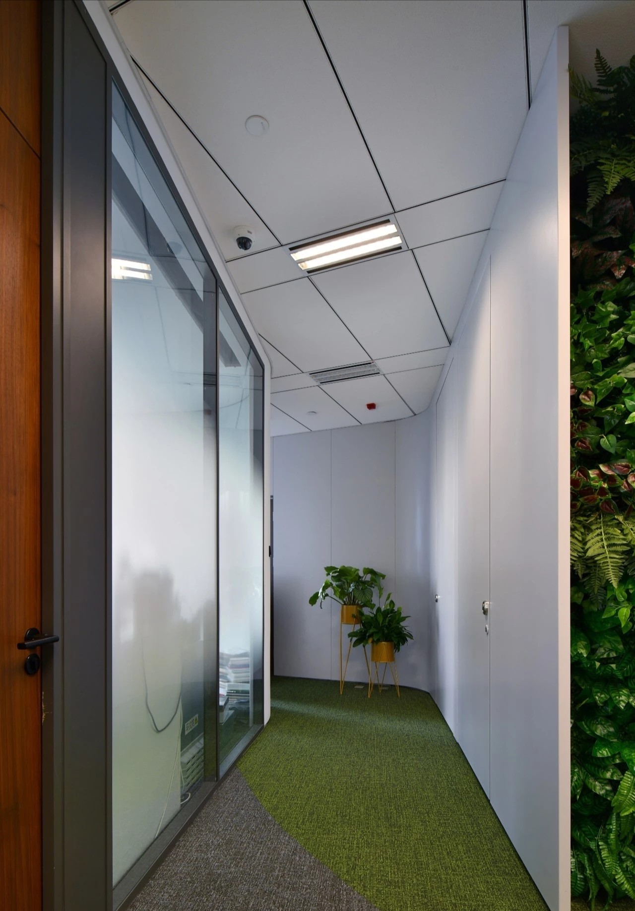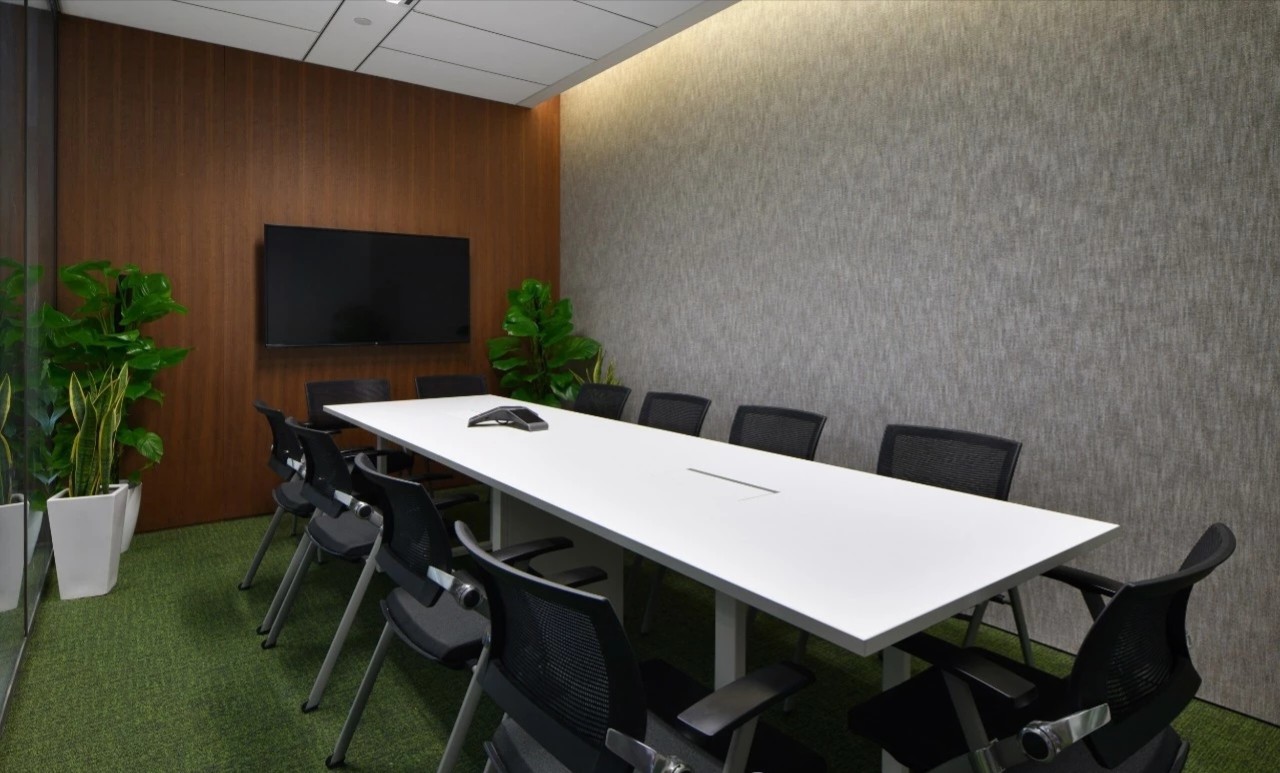 小会议室的设计风格与大会议室颇多不同,均是为体现两个会议室功能属性不同有意为之,体现了设计师对设计语言的深刻理解。不同于大会议室的开放性,小会议室以烤漆玻璃隔开内外空间,又以紧凑布局营造节奏感,用以强调小会议室作为日常部门任务布置、临时会议、工作研讨等用途所需要的高效率、快节奏。绿色地毯与绿植又调和了快节奏带来的紧张感,一张一弛之间更显现代办公的人性化理念。