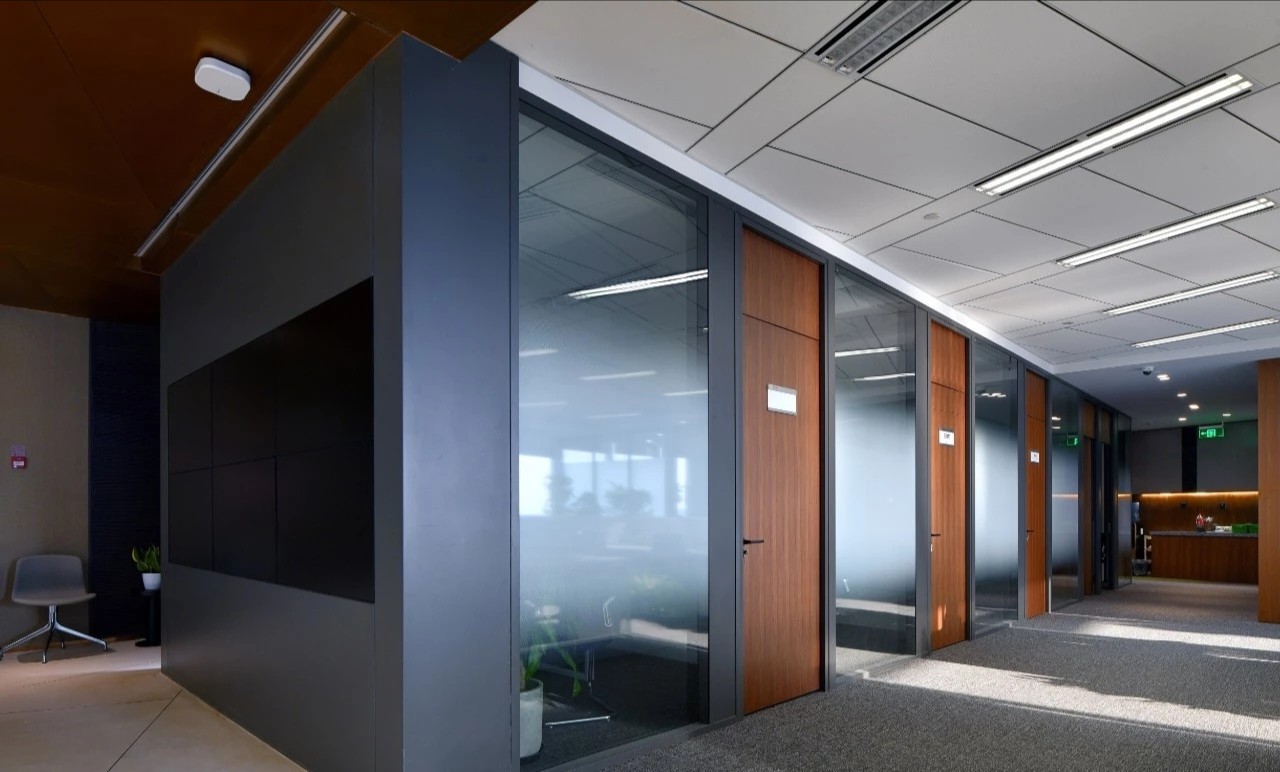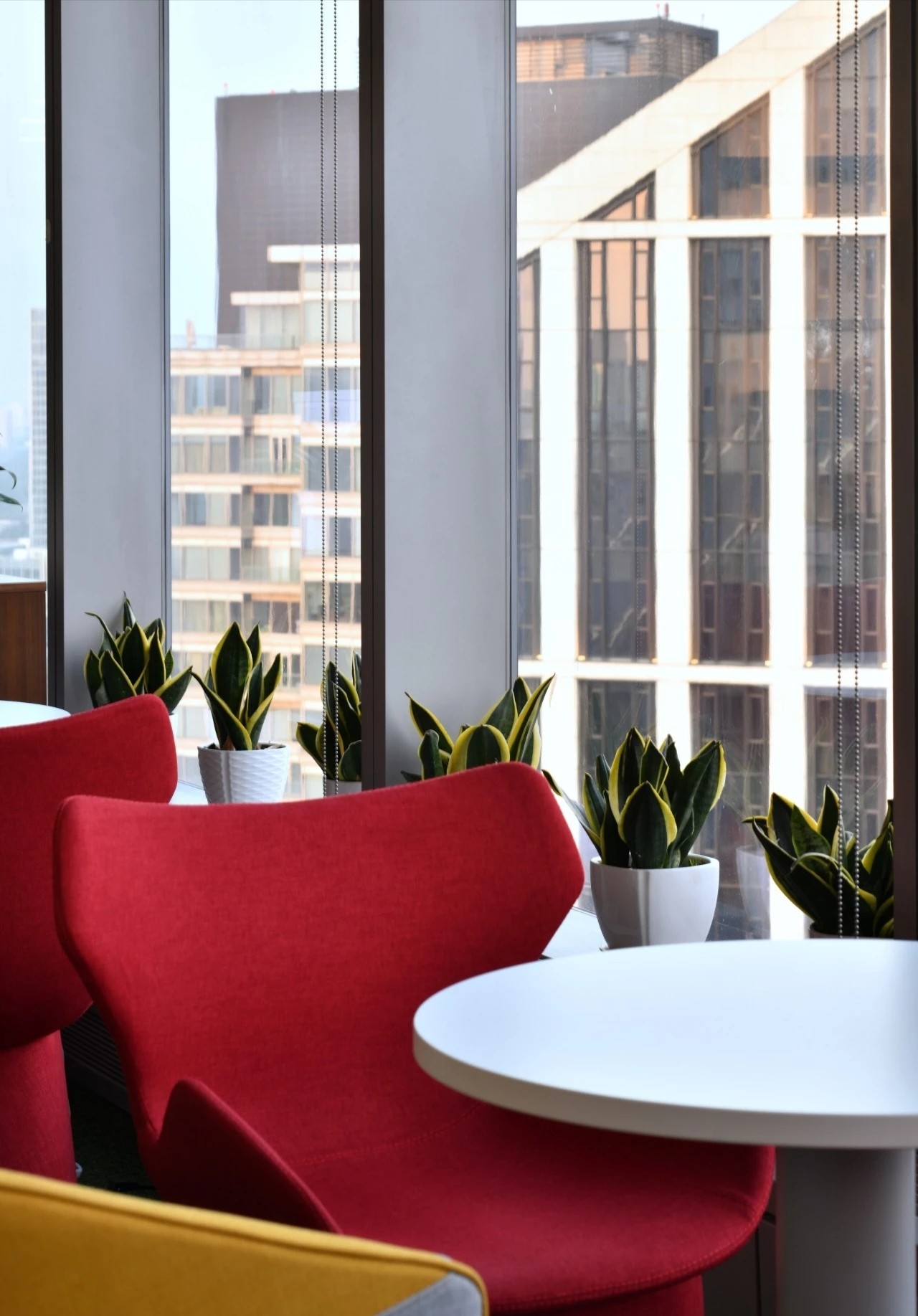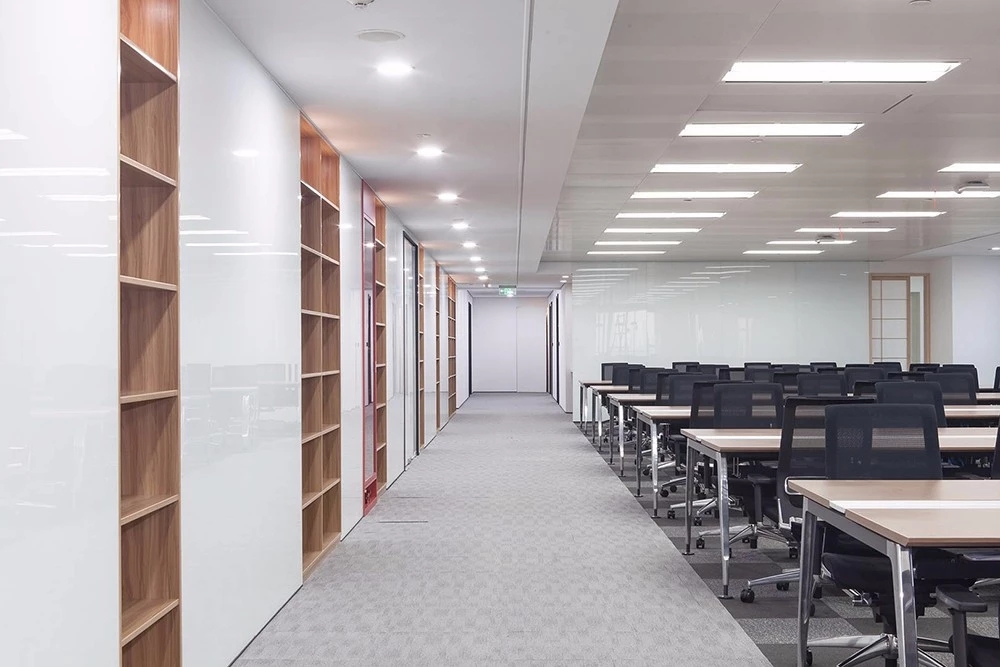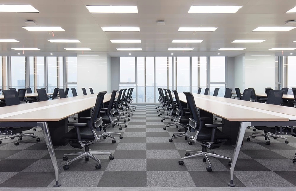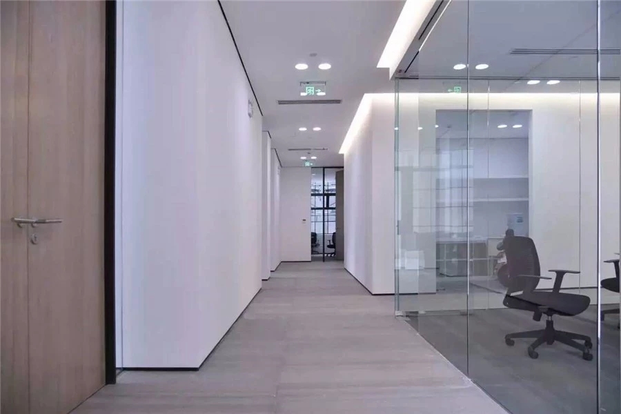 小会议室的设计风格与大会议室颇多不同,均是为体现两个会议室功能属性不同有意为之,体现了设计师对设计语言的深刻理解。不同于大会议室的开放性,小会议室以烤漆玻璃隔开内外空间,又以紧凑布局营造节奏感,用以强调小会议室作为日常部门任务布置、临时会议、工作研讨等用途所需要的高效率、快节奏。绿色地毯与绿植又调和了快节奏带来的紧张感,一张一弛之间更显现代办公的人性化理念。