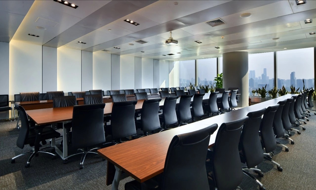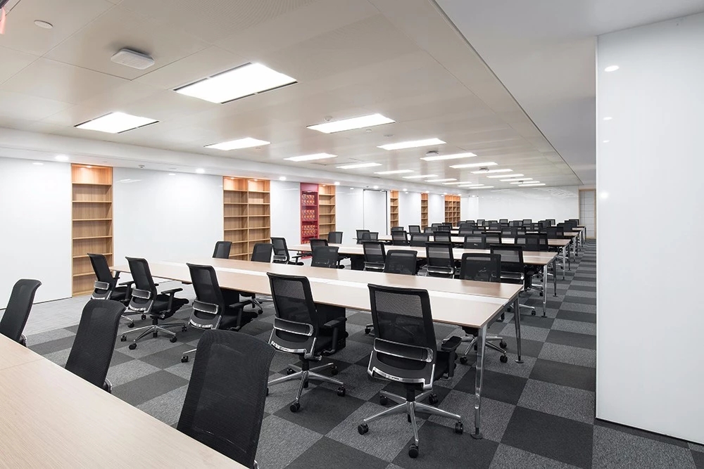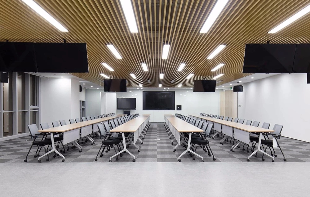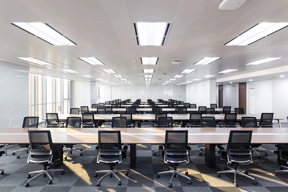大会议室的设计不拘一格,在传统的布局下,设计师以极具空间层次感的墙面和灯光,创制出了层层递进的光影效果,让观者瞬间跳出了会议室拘泥刻板的固有印象,带给人观感极佳的视觉体验。整体空间布局不用添加冗余装饰,仅以空间构成的艺术性,就令大会议室的氛围大气高档,与大会议室的空间作用相得益彰,乃是大巧若拙的最佳注解。