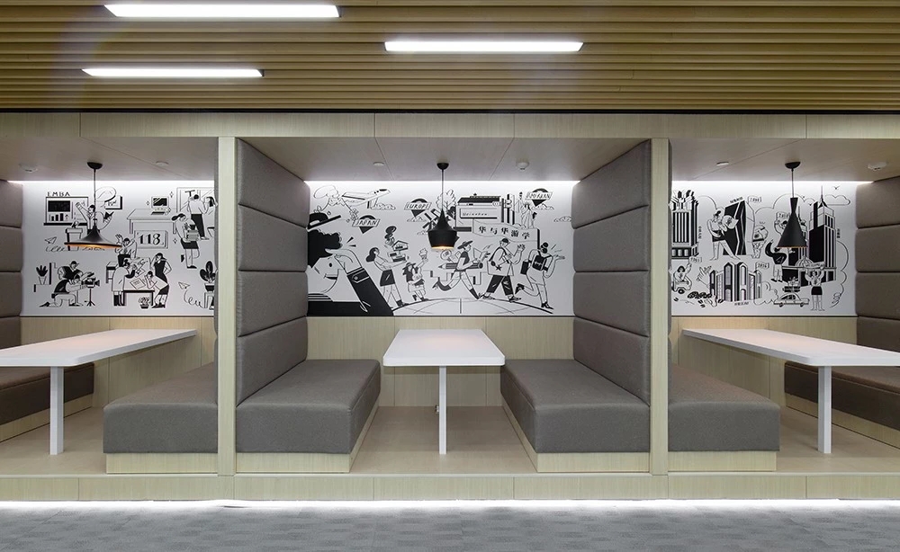 华与华的经营理念“悦近来远”,出自《论语》,叶公问政,子曰:“近者悦,远者来。”在近处的人喜悦了,远方的人自己就来了。这不仅在于经营,对待员工也一样,能成就现有的员工,远方的人才自己就来。游学、奖励机制、送读EMBA,成就员工之余更有关怀。办公室的全套家具选择了日本国誉,保证员工长时间亲密接触的每一张桌子每一把椅子都是最舒适的。办公室风景最佳的位置用作公共休息区是华与华的传统,面朝苏州河的“华咖啡”是新办公室的休闲区,让员工们在高速运转中暂时放缓,品一口醇香,赏一道美景,享一刻闲逸。在卡座式休息区既可以放空脑袋,放松片刻,也可以三两人一起碰撞创意。